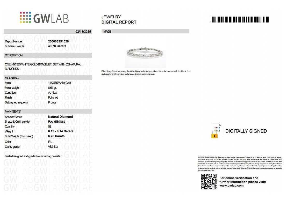 Exclusieve tennisarmband 14K witgoud GW Certificate no. 250006951028 Natuurlijke diamanten Caraat: 6.76crt / 52 diamanten Kleur: F-L Helderheid: VS2-SI3 Bezichtiging op afspraak Materiaal: Witgoud Certificaat: Ja Lage schatting: 13900€