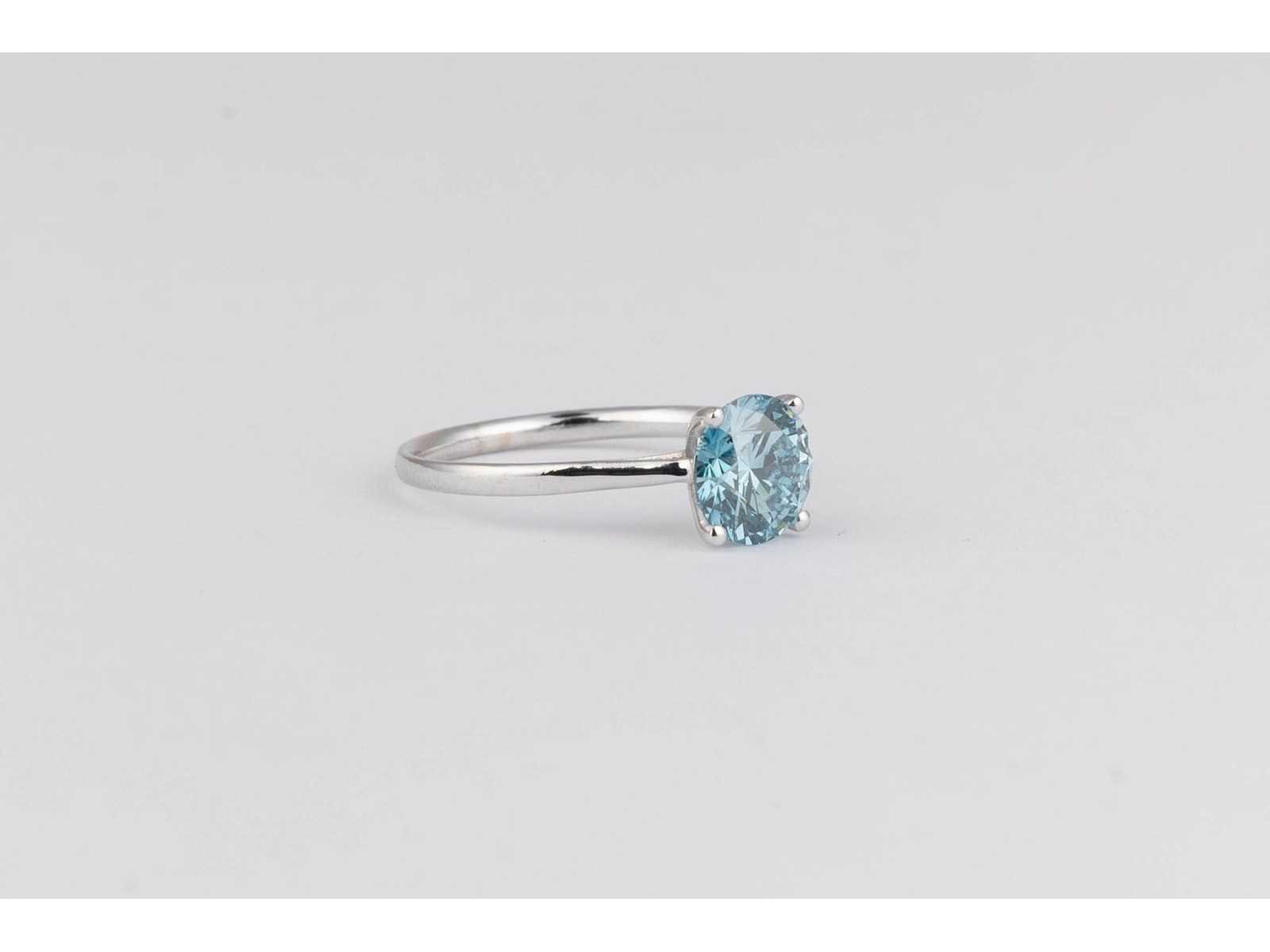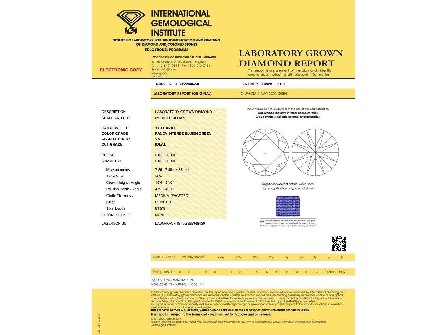 Vorm: Rond Brilliant Gewicht: 1.63CT Kleur: Fancy Intense Bluish Green Helderheid: VS1 Symmetrie: uitstekend Fluorescentie: geen Laserinscriptie IGI: LG355948450 Bezichtiging op afspraak Materiaal: Witgoud Ringmaat : 53 Certificaat: Ja Lage schatting: 3900€