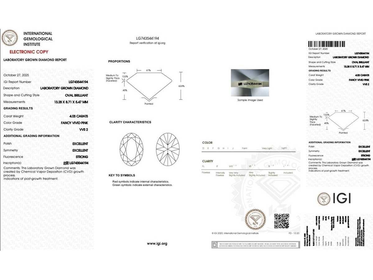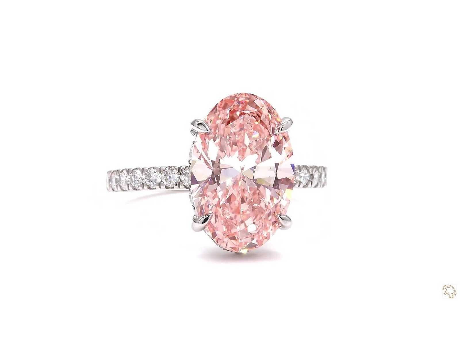Exclusieve platinum 950 ring Ringmaat - 50 EU / 10 IT / 5.25 US Rapportnummer IGI: LG743544194 Totaal karaatgewicht - 4.63 Vorm: Ovaal Brilliant Cut Gewicht van de hoofdsteen: 4,03 CT Kleur: Fancy Vivid Pink Helderheid: VVS2 Snede: uitstekend Symmetrie: uitstekend Omringende stenen - 0,60 Bezichtiging op afspraak Materiaal: Platina Certificaat: Ja Lage schatting: 8700€