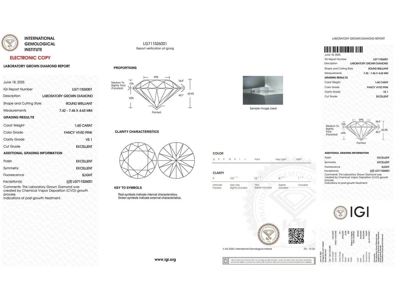 Vorm: Rond Brilliant Gewicht: 1.60CT Kleur: Fancy Vivid Pink Helderheid: VS1 Symmetrie: uitstekend Fluorescentie: Licht Laserinscriptie IGI: LG711526001 Bezichtiging op afspraak Materiaal: Witgoud Certificaat: Ja Lage schatting: 3100€