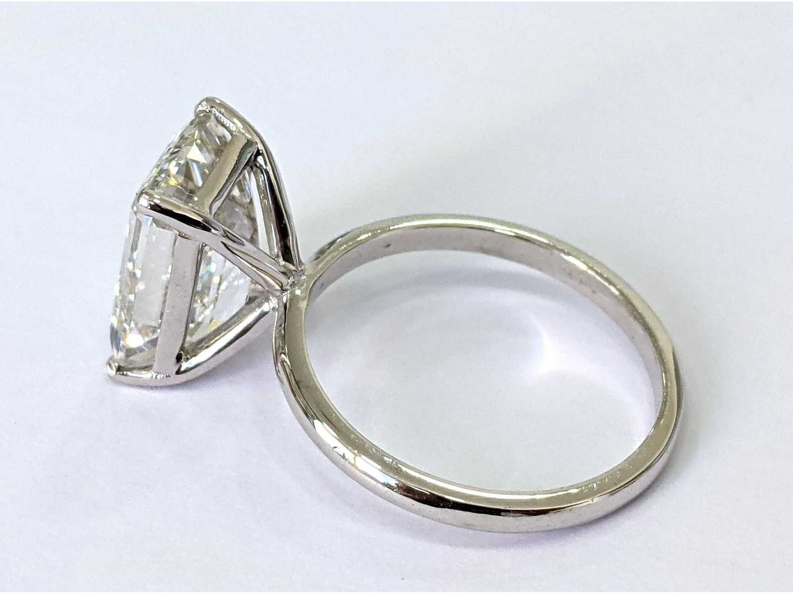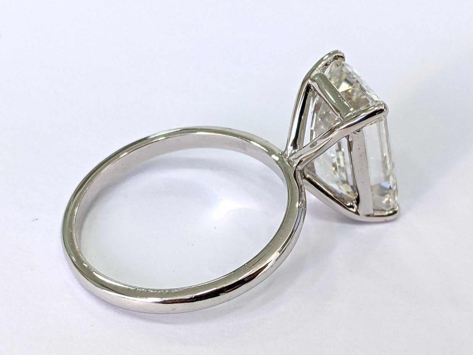 Snede: Emerald Cut Karaat: 7,68 karaat Kleur: E Helderheid: VVS2 Ringmaat: 54 (EU) / 14 (IT) / 6 ¾ (VS) Bezichtiging op afspraak Materiaal: Witgoud Ringmaat : 54 Certificaat: Ja Lage schatting: 21900€
