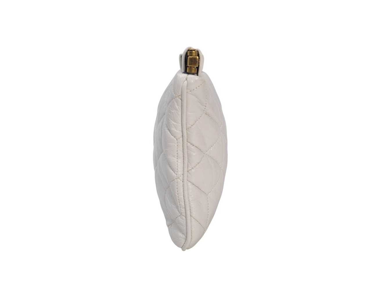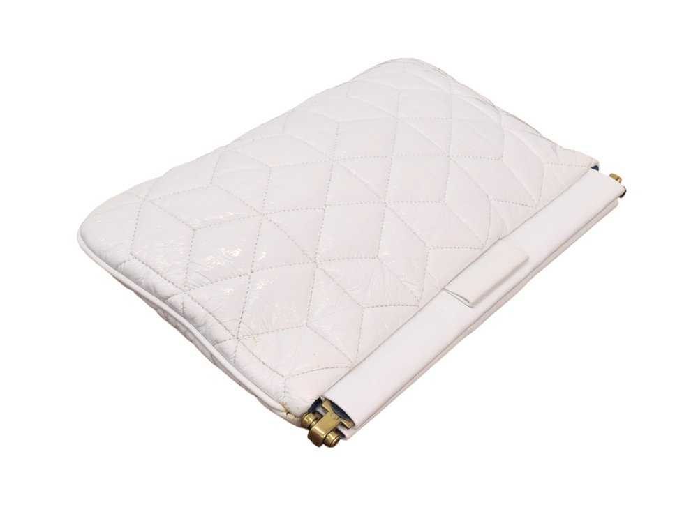 Miu Miu Pochette in witte gelakte leren uitvoering met gouden details, het klassieke handtasmodel. Staat: Uitstekend Bezichtiging op afspraak Merk: Miu Miu Fabrikant: Miu Miu Materiaal: Wit leer Model: Pochette Product type: handtas Lengte: 16cm Breedte: 25cm