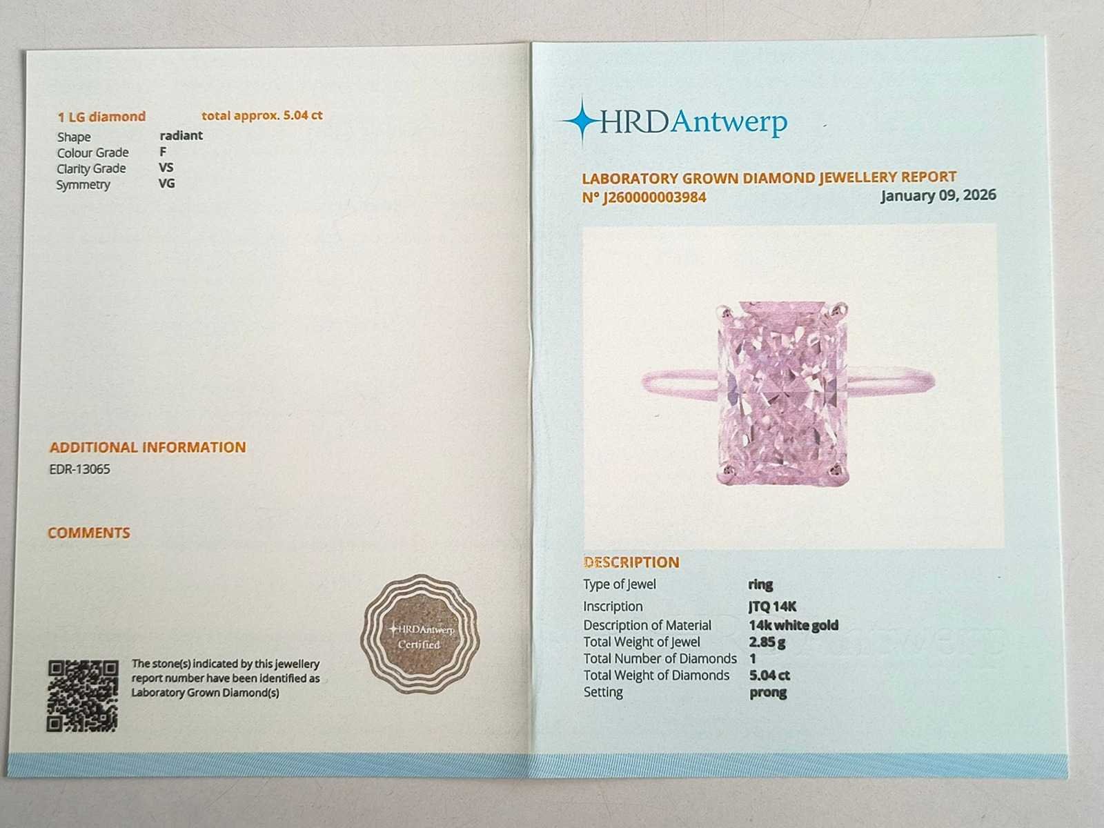 Metaal: 14K witgoud - Certificaatnummer: J260000003984 - Laboratorium: HRD Antwerp - Duidelijkheid: VS - Kleur: F Bezichtiging op afspraak Materiaal: Witgoud Ringmaat : 55 Certificaat: Ja Lage schatting: 9400€