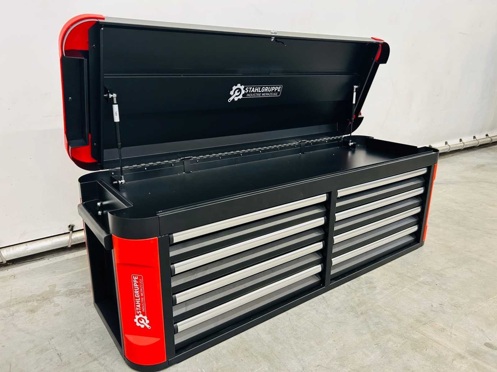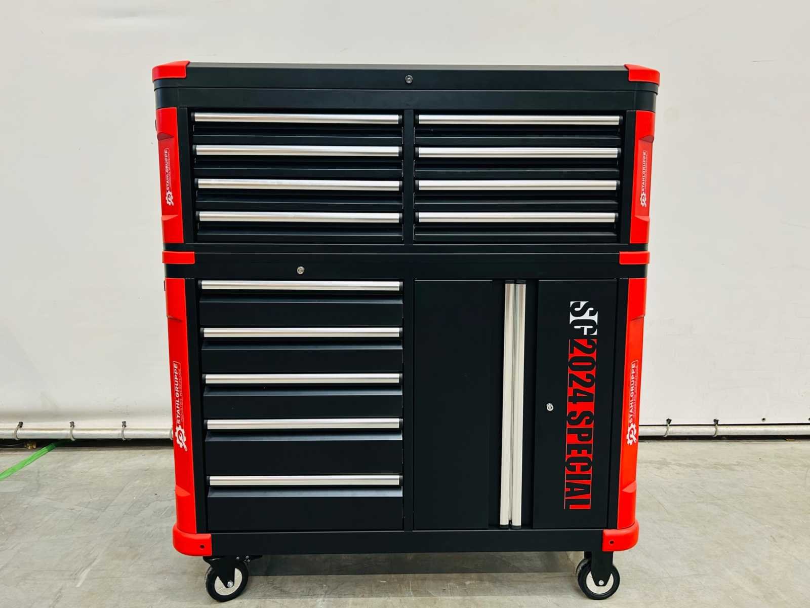 Kar met afneembare topbox; topbox met 8 laden en boven klep; Kar met 5 laden en kast met dubbele openslaande deuren; 13laden - 9 gevuld; 2 zwenkwielen waarvan 2 geremd; 7212 Merk: Stahlgruppe Model: SG2024 Type: 327-delige Kleur: rood - zwart Gewicht: 215kg Lengte: 144cm Breedte: 54cm Hoogte: 154cm