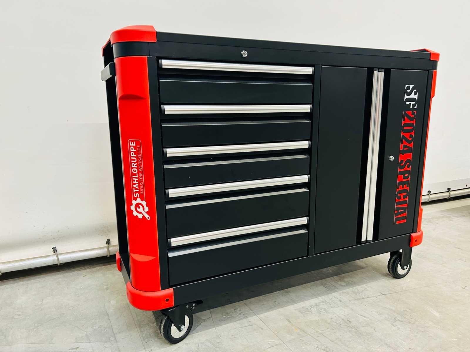 Kar met afneembare topbox; topbox met 8 laden en boven klep; Kar met 5 laden en kast met dubbele openslaande deuren; 13laden - 9 gevuld; 2 zwenkwielen waarvan 2 geremd; 7212 Merk: Stahlgruppe Model: SG2024 Type: 327-delige Kleur: rood - zwart Gewicht: 215kg Lengte: 144cm Breedte: 54cm Hoogte: 154cm
