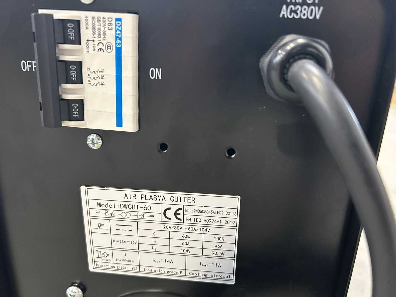 Rated power: 9.2 KVA; Rated current: 14 A; No-load voltage: 256 V; Output current adjustment: 20-60 ; Rated output voltage: 104 V; Max cutting thickness: 20 mm; Cyclic duration factor: 60%; Efficiency: 70%; Insulation grade: F; Protection grade: IP21; Arc-start: Contact; 6094 Merk: Daewoo Type: DWCUT60 Bouwjaar: 2024 Max. snijdikte: 20mm Aansluiting: 380V Machinegewicht: 15kg Afmeting l: 535mm Afmeting b: 210mm Afmeting h: 380mm