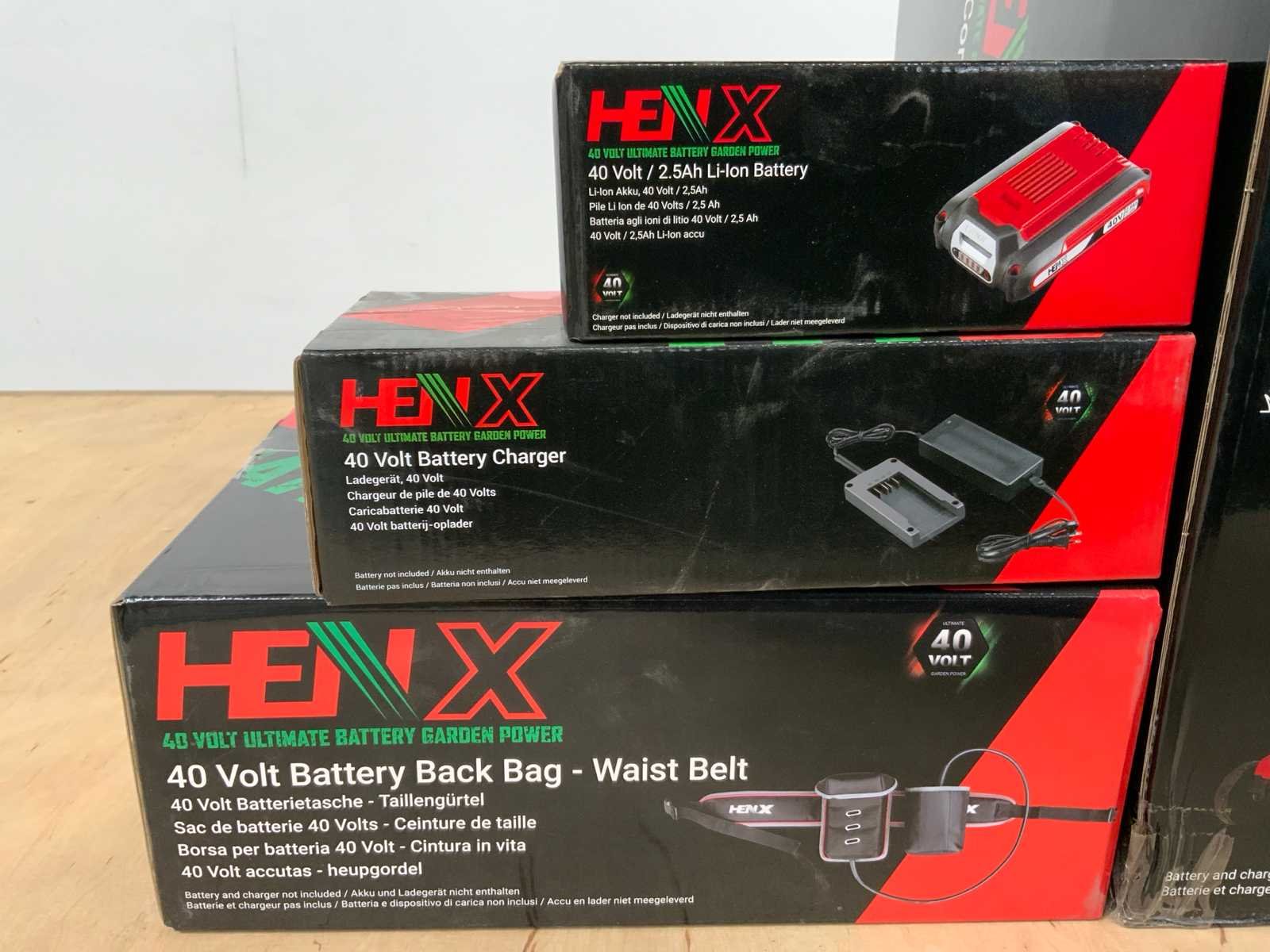 1 accu 2.5AH; 1x grasmaaier; 1x heggenschaar; 40V batterij waist belt; Merk: Henx