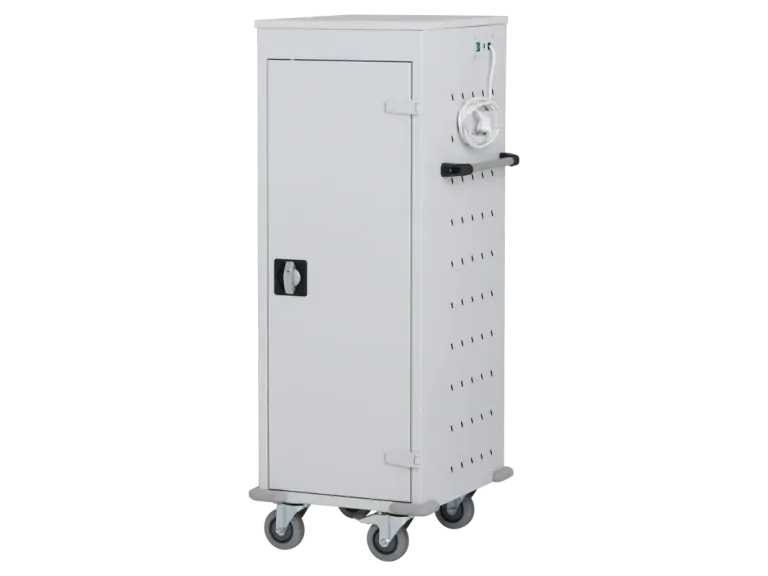 Opberg/oplaadstation voor tablets en laptops, Voorzien van zwenkwielen, 230v aansluiting, 10 vakken, betreft een ongebruikt product Merk: Povag Lengte: 53cm Breedte: 54cm Hoogte: 124cm