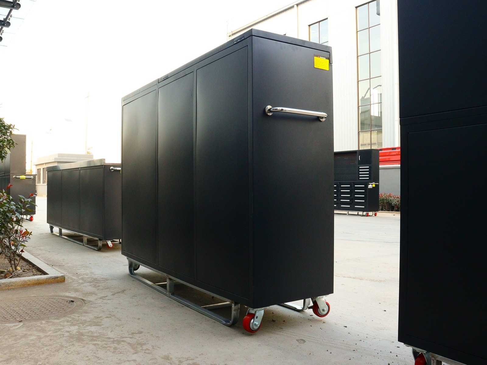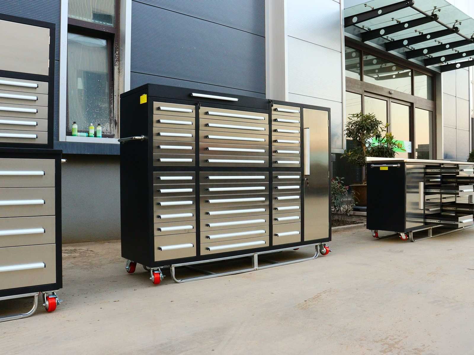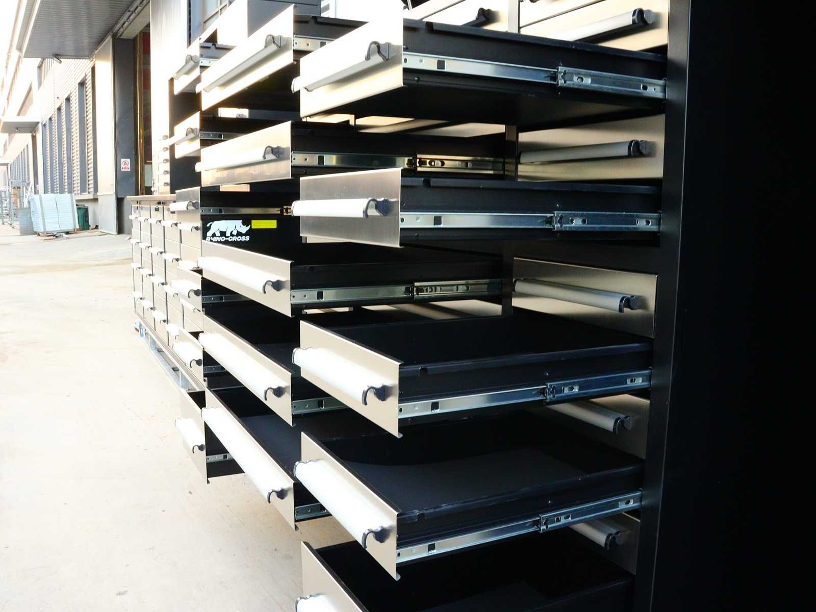 Voorzien van Gepoedercoat staal; 35 lades; 1 Deur; 1 bovenkast; Ongebruikt (Transport afmetingen 2875x725x1140mm) Merk: Rhino-Cross-Workbench Product type: H7ft-35D-1-L-01C RVS