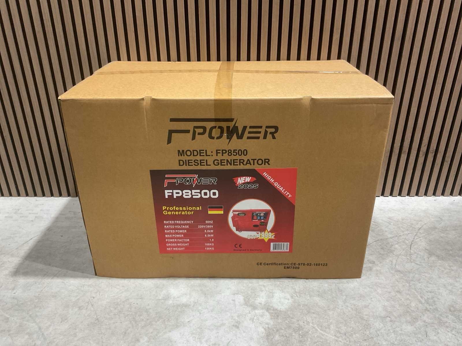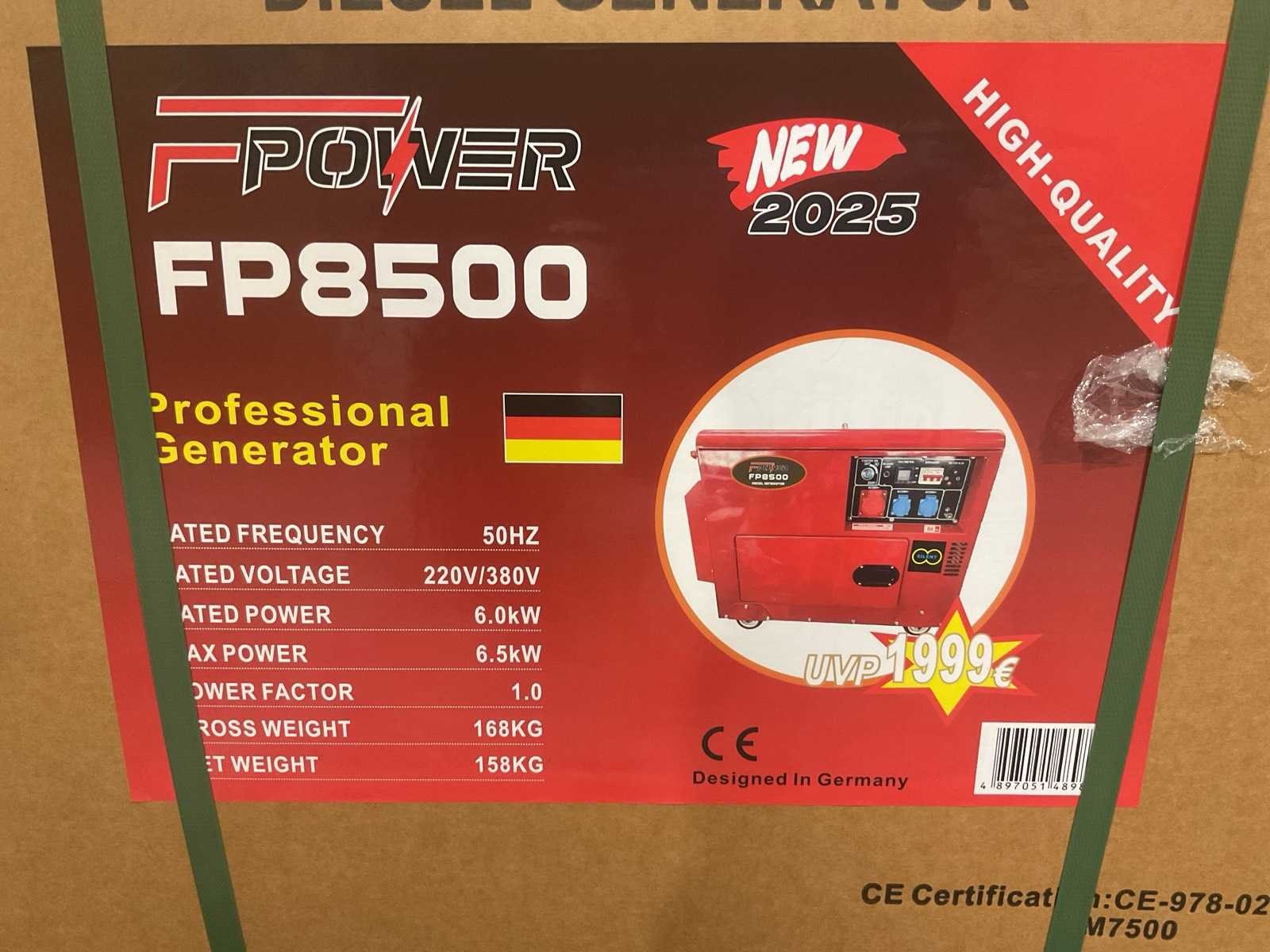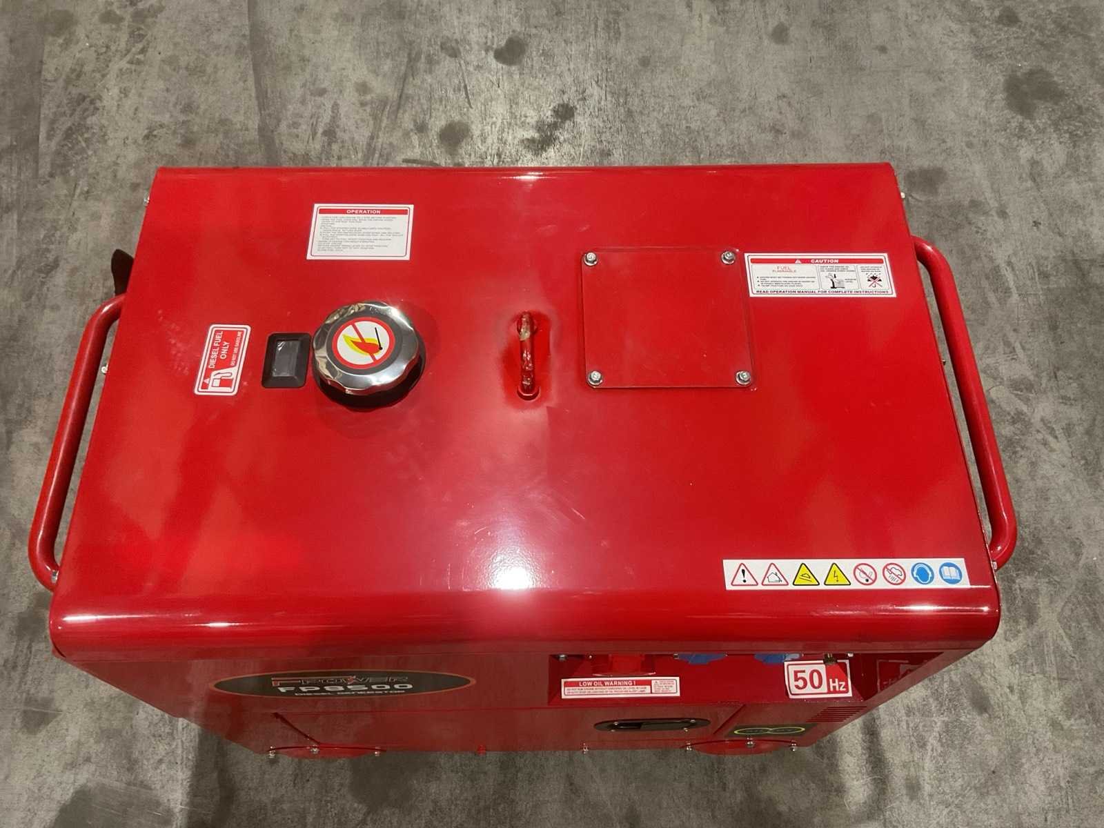 Voorzien van Frequentie: 50 Hz; Spanning: 220V / 380V (1-fase & 3-fase); Maximaal vermogen: 6,5 kW; Power factor: 1.0; Spanningsregeling: AVR (automatisch); Motortype: 4-takt dieselmotor; Koeling: Luchtgekoeld; Injectie: Directe diesel-injectie; Start: Elektrisch; Transport: 168 kg (91x54x63) cm; Ongebruikt Merk: Fpower Type: FP8500 Diesel: true