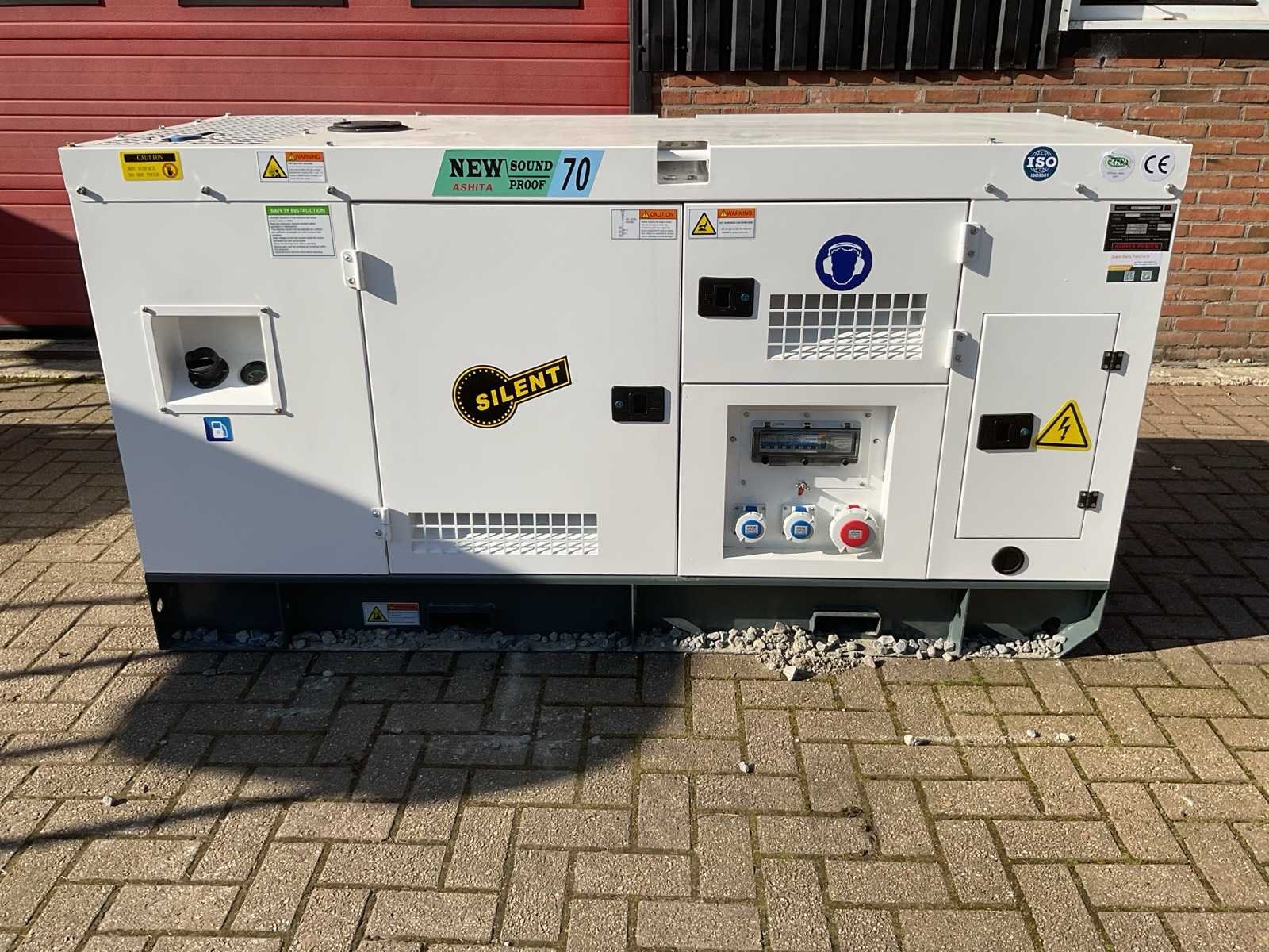 Voorzien van Nominaal vermogen: 70 kVA (±56–60 kW) Standby vermogen: ±82 kVA (±65,8 kW) Motorvermogen: ±66 kW Spanning: 230 / 400 V Frequentie: 50 Hz 2 × 230 V, 1 × 400 V Brandstof: Diesel Aantal cilinders: 4 cilinders Motortoerental: 1500 rpm Verbruik: ≤231 g/kWh Geluidsniveau: ±78 dB(A) met geluidsdichte canopy Afmetingen (L × B × H): ±2100 × 830 × 1170 mm Gewicht: 900 kg Geluidsdichte behuizing (silent canopy) SmartGen digitaal controlepaneel Elektrische start AVR spanningsregeling voor stabiele output Forklift pockets en hijsogen voor transport Merk: Ashita Power Type: AG3-70 Wit