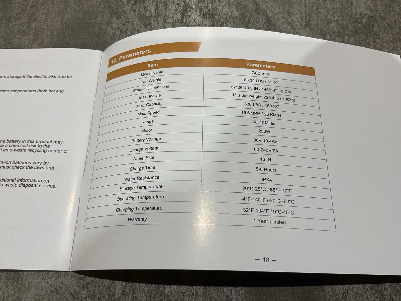 Voorzien van Aandrijving: Elektrisch met trapondersteuning; Motorvermogen: 250 W; Motortype: Borstelloze elektromotor; Max. ondersteunde snelheid: 25 km/u; Aandrijving: Achterwielmotor; Accu: 36V Lithium-ion; Accucapaciteit: 10.4 Ah; Laadspanning: 100–240 V / 2A; Wielmaat: 16 inch; Transport gewicht: 39kg; Ongebruikt in doos Merk: C80 Model: Mini Product type: Black