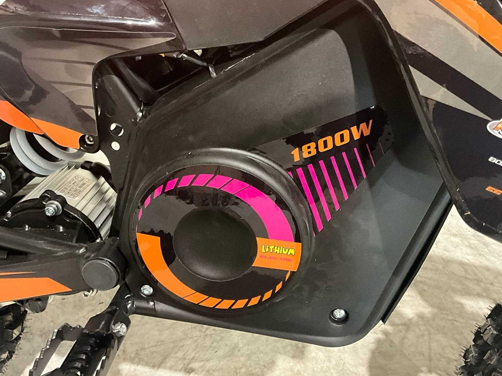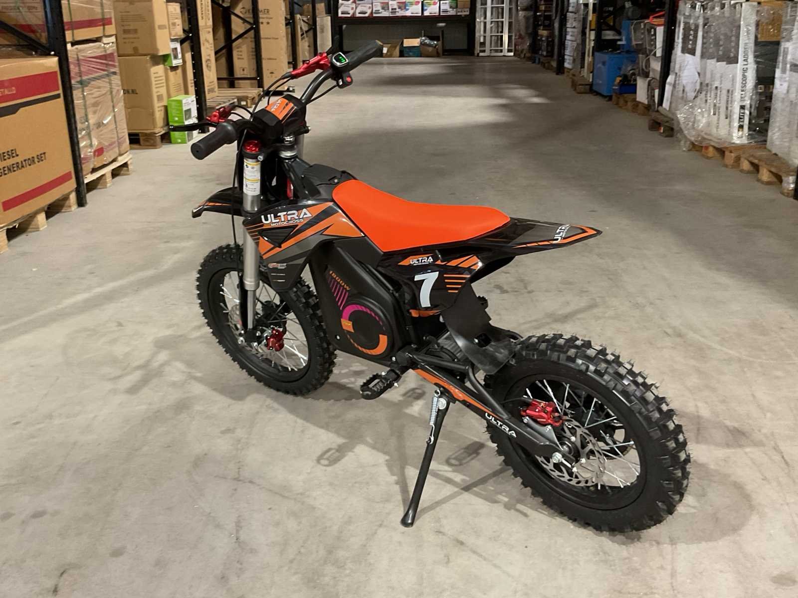 Voorzien van Accu: 48V13Ah lithium; Transmissie: intelligente controller, instelbaar in 2 functies; Gasrespons instelbaar van 0,2S tot 1,0S; Maximale snelheid instelbaar van 10 km/u - 55 km/u (1800W); Eindaandrijving: voor 10T / achter 76T; Actieradius per volle lading (13Ah lithium accu): ~24 km; Velg & banden: Velg met stalen spaken, voor 14" en achter 12"; Band: voor 2,75-14" / achter 3,00-12"; Max. Snelheid: 55 km/u (1800 W); Max. draagvermogen: 65 kg; Remsysteem: mechanische rem/schijf voor en achter (Ø 180 mm); Vering: hydraulische upside-down vork en monoshock achter; Afmetingen (L*B*H): 1470*640*920 mm; Wielbasis: 1010 mm; Zithoogte: 680 mm; Minimale bodemvrijheid: 300 mm; Gewicht: 38 kg; Ongebruikt in doos (Transport afmetingen 129x37x66cm 49kg) Merk: Ultra Motocross Model: ULD01 OR Type: 1800W 48v Gewicht: 39kg Kleur: Oranje Bouwjaar: 2025
