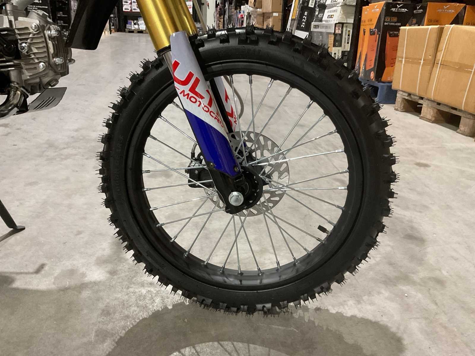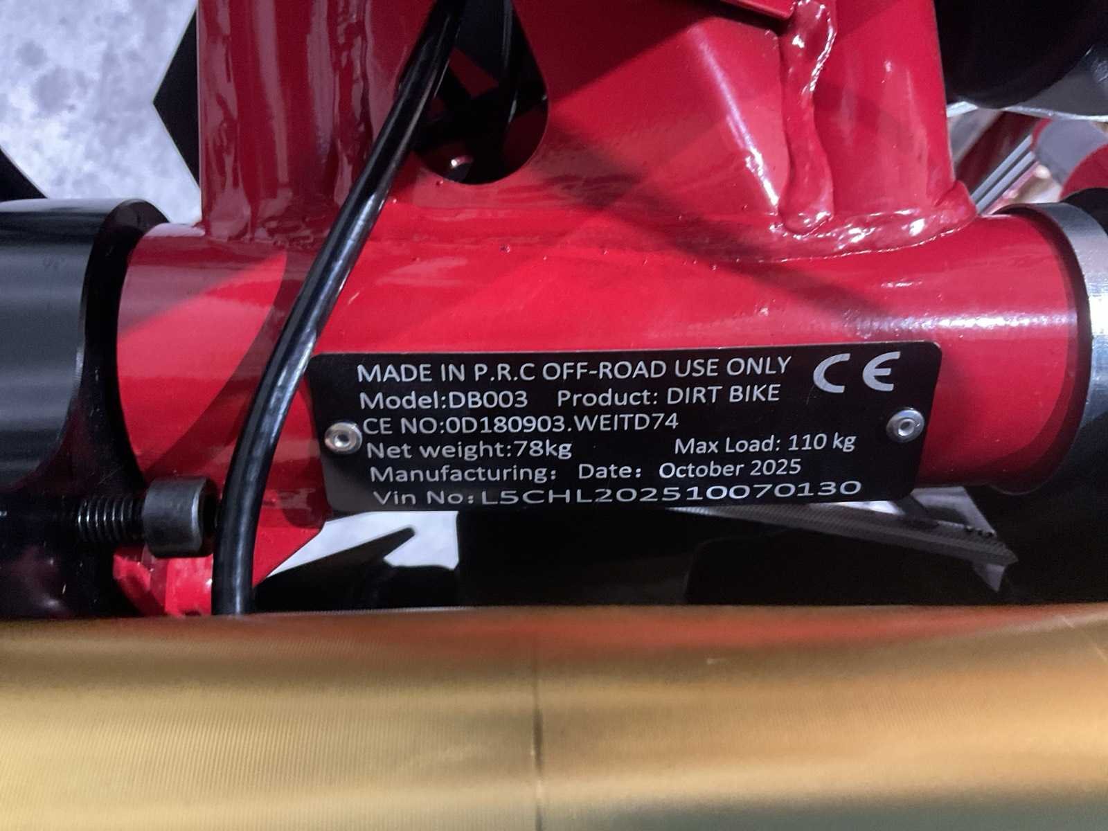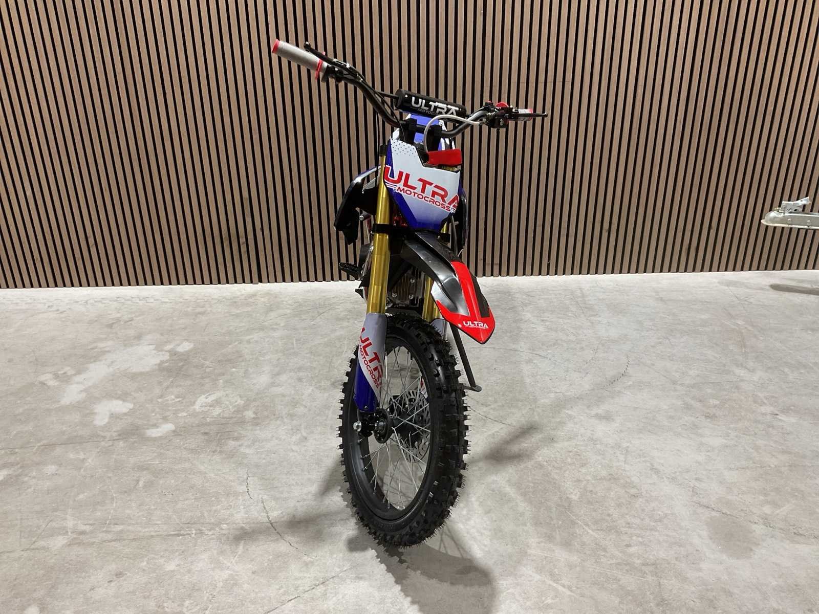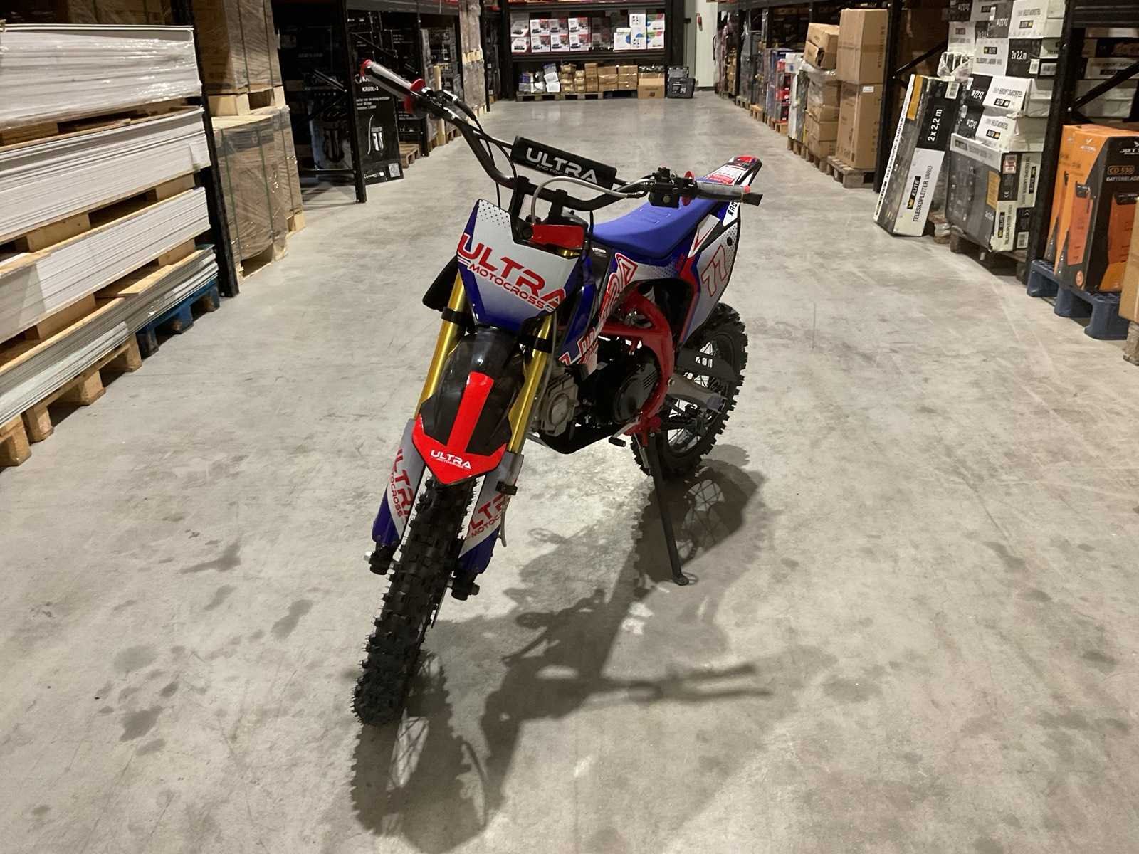 Voorzien van motor: 125 cc, 4-takt, 11 pk; Brandstof: benzine (4-takt); Transmissie: schakel; Remmen: hydraulische schijfremmen; Bandenmaat: voor 17" / achter 14"; Transportafmetingen (in doos): 135 × 45 × 65 cm; Transport gewicht: 78kg; ongebruikt in doos Merk: Ultra Motocross Model: DB003 Type: Pitbike 2025 RD Cilinderinhoud: 125cc Gewicht: 71kg Kleur: Rood