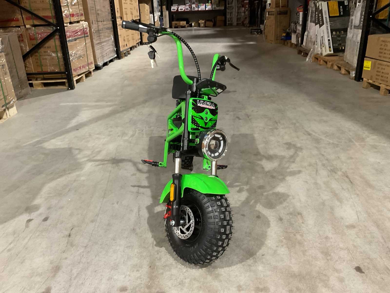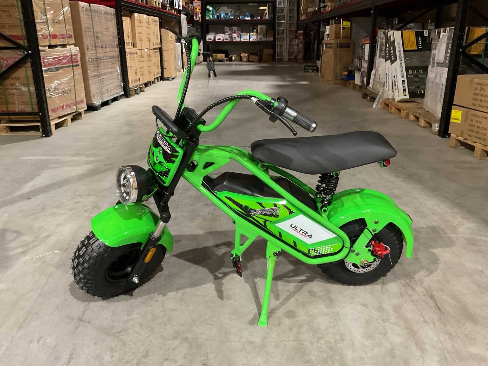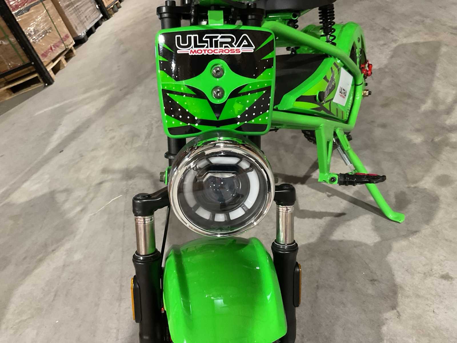 Voorzien van 48V 1000W motor; Led verlichting voor en achter; Led dashboard met kilometerteller; 3 snelheid standen; Topsnelheid circa 45kmh; Actieradius +-20km; Zadelhoogte: 62cm; Electromotor direct op het achterwiel!; Afmeting gemonteerd: 130x70x90cm (LxBxH); Maximaal toelaatbaar gewicht: 100KG; Ongebruikt in doos (Verzend afmetingen: 1200x320x640, gewicht 41kg) Merk: Ultra Motocross Model: Viper MUL TX 50 Type: GR Brandstof: Elektrisch Kleur: Groen Bouwjaar: 2025