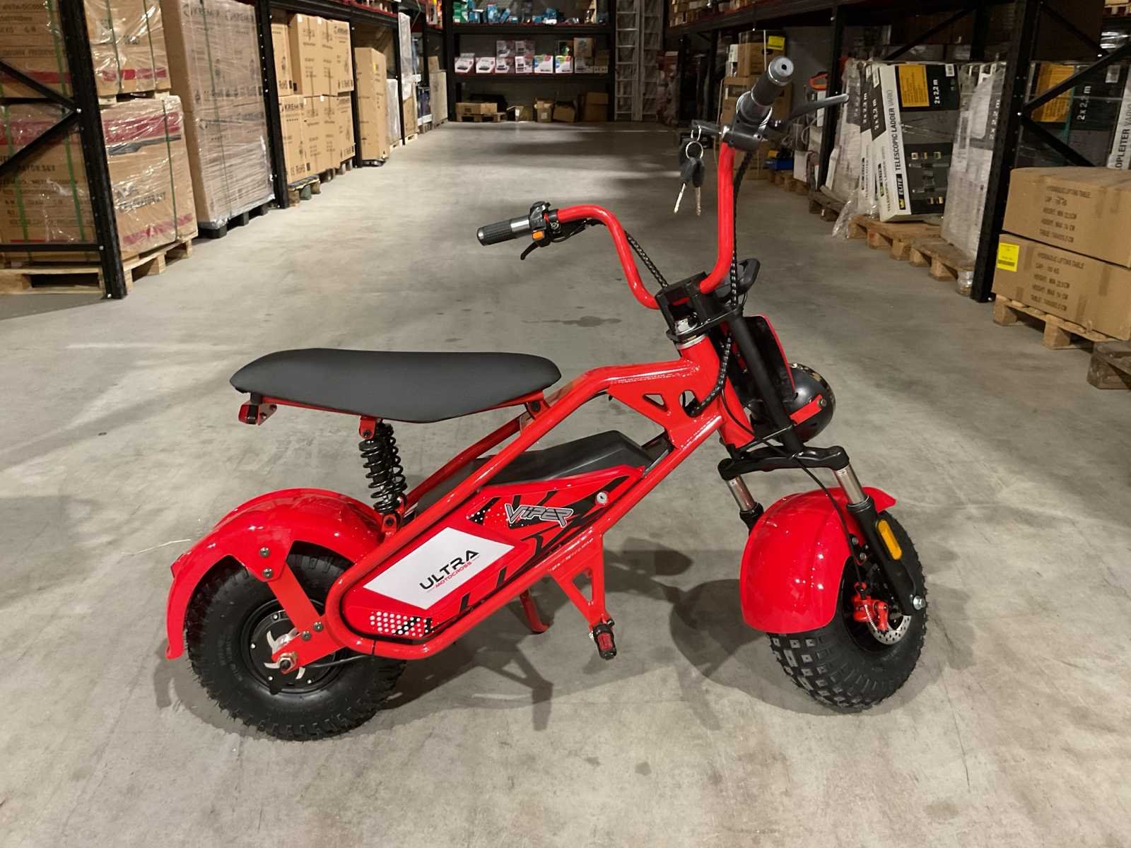 Voorzien van 48V 1000W motor; Led verlichting voor en achter; Led dashboard met kilometerteller; 3 snelheid standen; Topsnelheid circa 45kmh; Actieradius +-20km; Zadelhoogte: 62cm; Electromotor direct op het achterwiel!; Afmeting gemonteerd: 130x70x90cm (LxBxH); Maximaal toelaatbaar gewicht: 100KG; Ongebruikt in doos (Verzend afmetingen: 1200x320x640, gewicht 41kg) Merk: Ultra Motocross Model: Viper MUL TX 50 Type: RD Brandstof: Elektrisch Gewicht: 23kg Kleur: Rood Bouwjaar: 2025