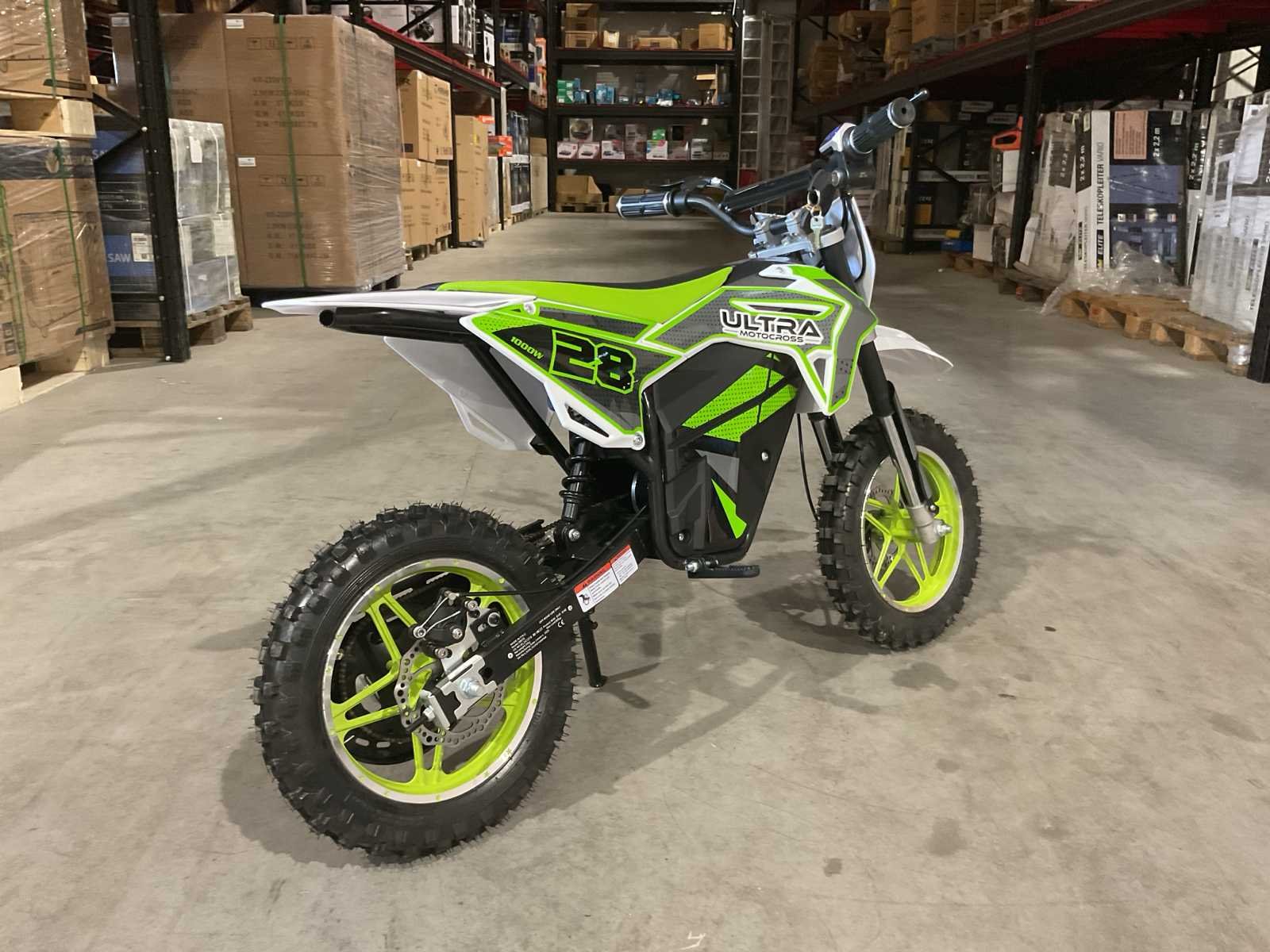 Voorzien van Motorvermogen: 1000 W elektrische motor; Voedingsspanning: 36 V; Topsnelheid: ± 35 km/u (snelheid in 3 standen instelbaar via sleutel); Zadelhoogte: ± 61 cm; Afmetingen (L×B×H): ± 120 × 80 × 56 cm (gemonteerd); Eigen gewicht: 40 kg; Max. belasting: 65 kg; Ongebruikt Merk: Ultra Motocross Model: DB07E GR Type: 1000W Gewicht: 38kg Kleur: Groen