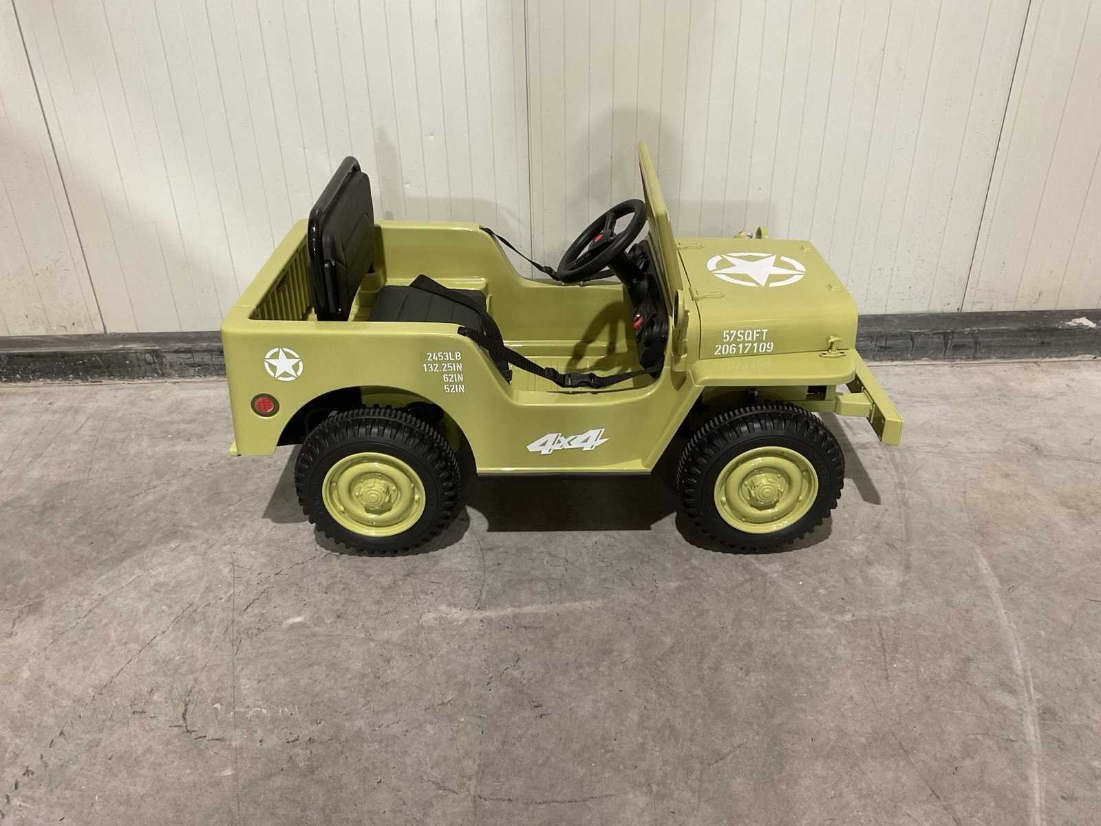 Voorzien van Elektrische aandrijving; 1 zitplaats; Banden: Kunststof wielen met profiel; Geluidseffecten; usb aansluiting; Verlichting; Afstandsbediening; Transport gewicht: 17 kg; Transport afmetingen: 103x58x32 cm; ongebruikt in doos Merk: Jeep Model: Hj103 Licht groen