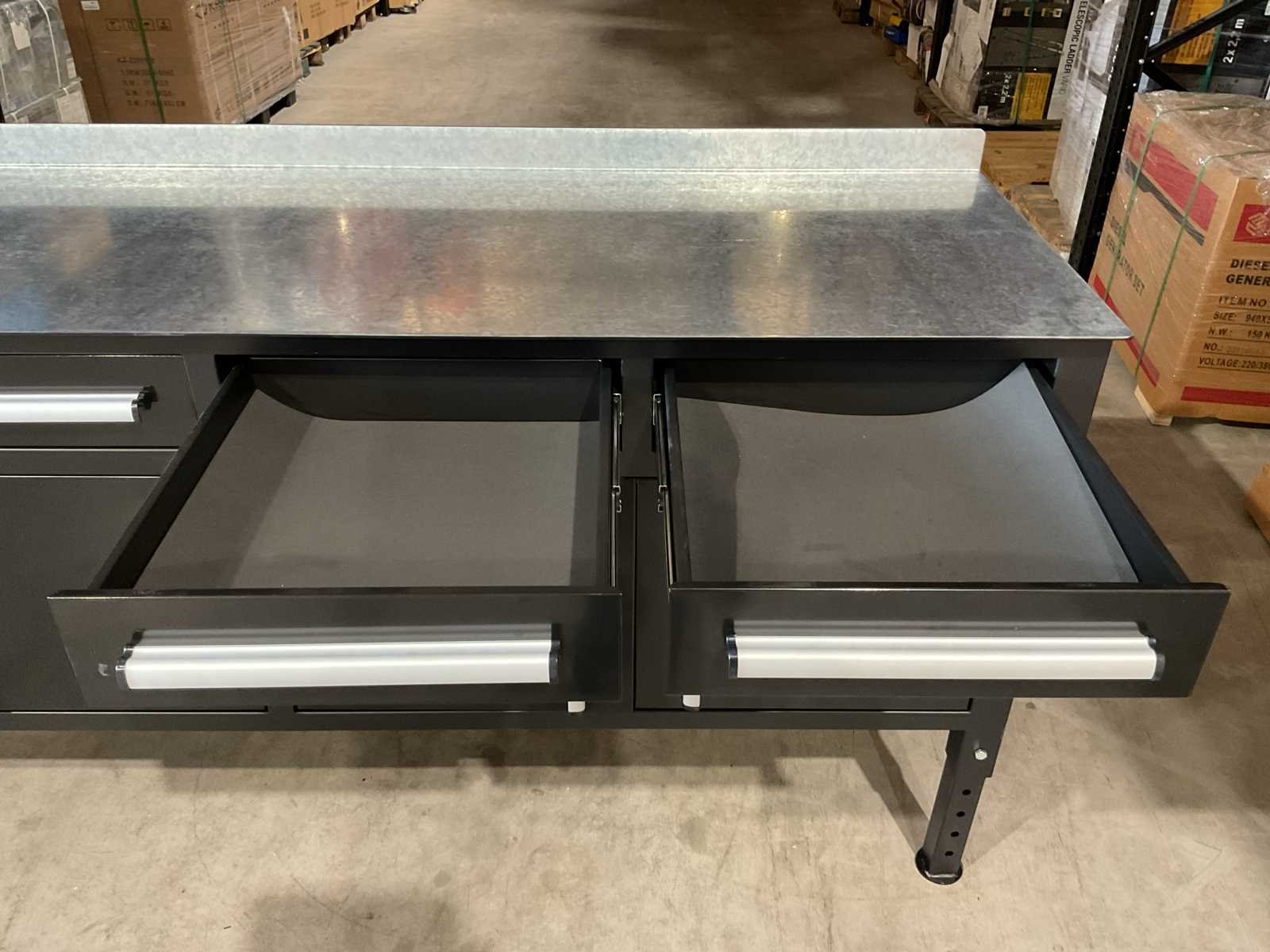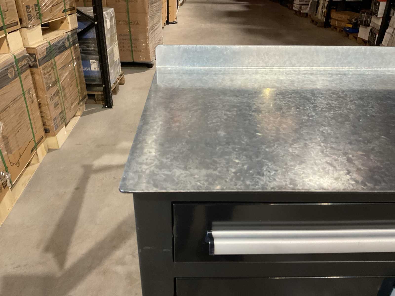 Voorzien van Gepoedercoat staal; 4 lades; 4 deuren; verstelbare hoogte van de poten; Sleutels voor afsluiten; Ongebruikt (Transport afmetingen 2200x660x850 mm) Merk: Rhino-Cross-Workbench Type: 7ft Zwart / stalen blad