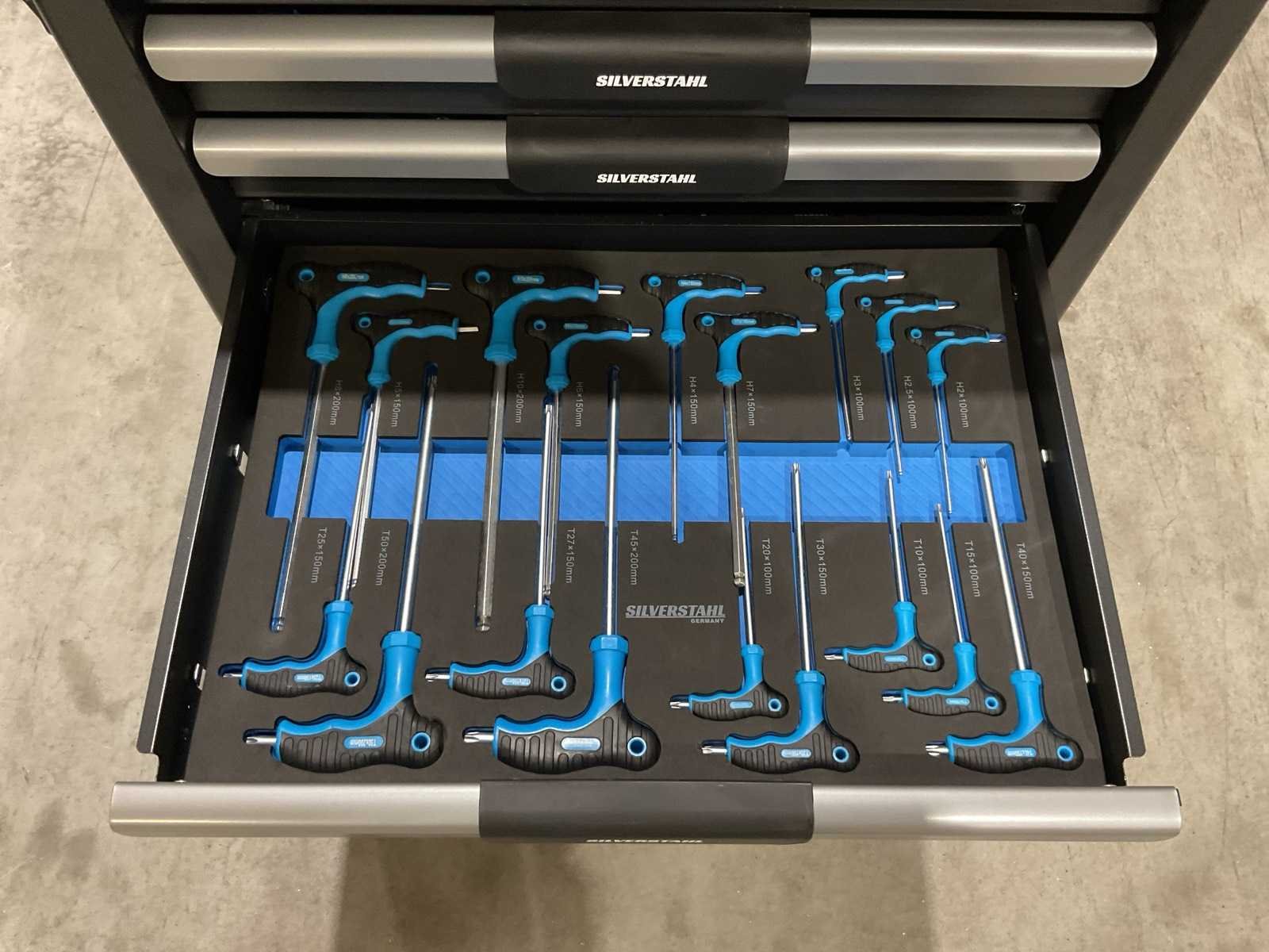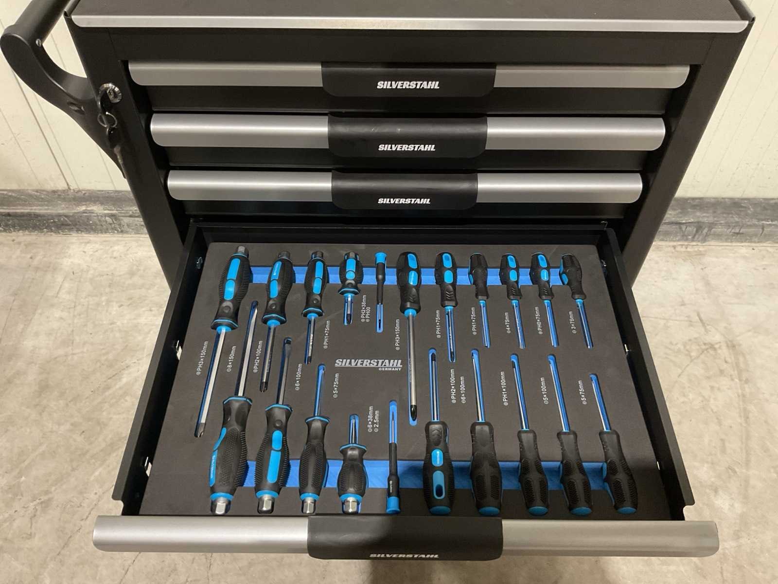 Voorzien van 266 stuks gereedschap; dopleutelset; ringsleutels / steeksleutels; schroevendraaiers; tangen; bits en bithoudersets; inbussleutels / torxsleutels; hamers; meetlint; kleien handtools; Transport gewicht 72kg; nieuw in doos Merk: Silverstahl Model: 7 lades 266 pcs Type: Limited Edition Gewicht: 69kg Lengte: 71cm Breedte: 48cm Hoogte: 99cm
