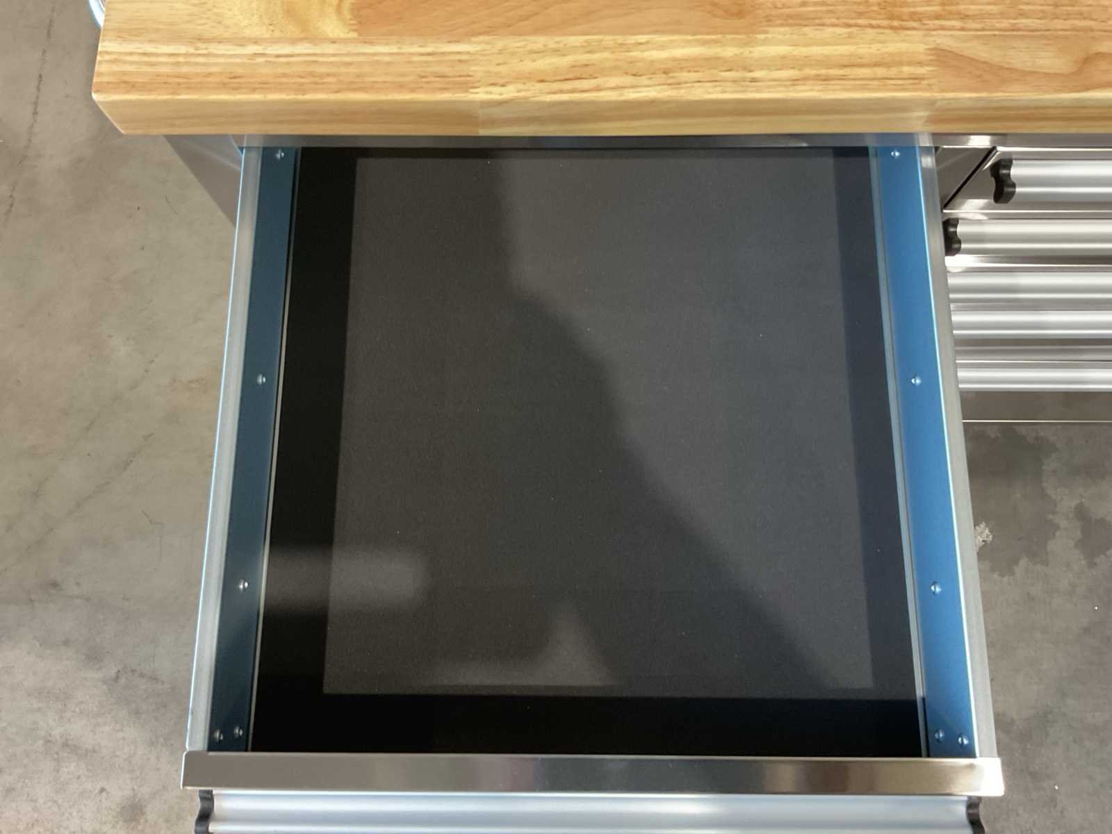 Voorzien van all 430 anti-fingerprint stainless steel; 15 laden; 3 hoge kasten; achterwand; 35 mm houten werkblad; 2 handvaten; 4 x 6 inch wielen waarvan 2 wielen met rem; afsluitbaar door middel van sleutel; ongebruikt in doos (transport afmetingen 190x55x130 cm) Merk: Stahlworks Model: Deluxe RVS 72 inch high Product type: 15 laden Gewicht: 179kg Lengte: 1830mm Hoogte: 1870mm Materiaal: RVS
