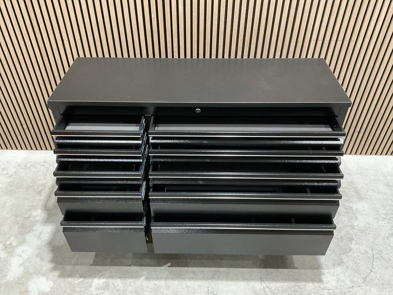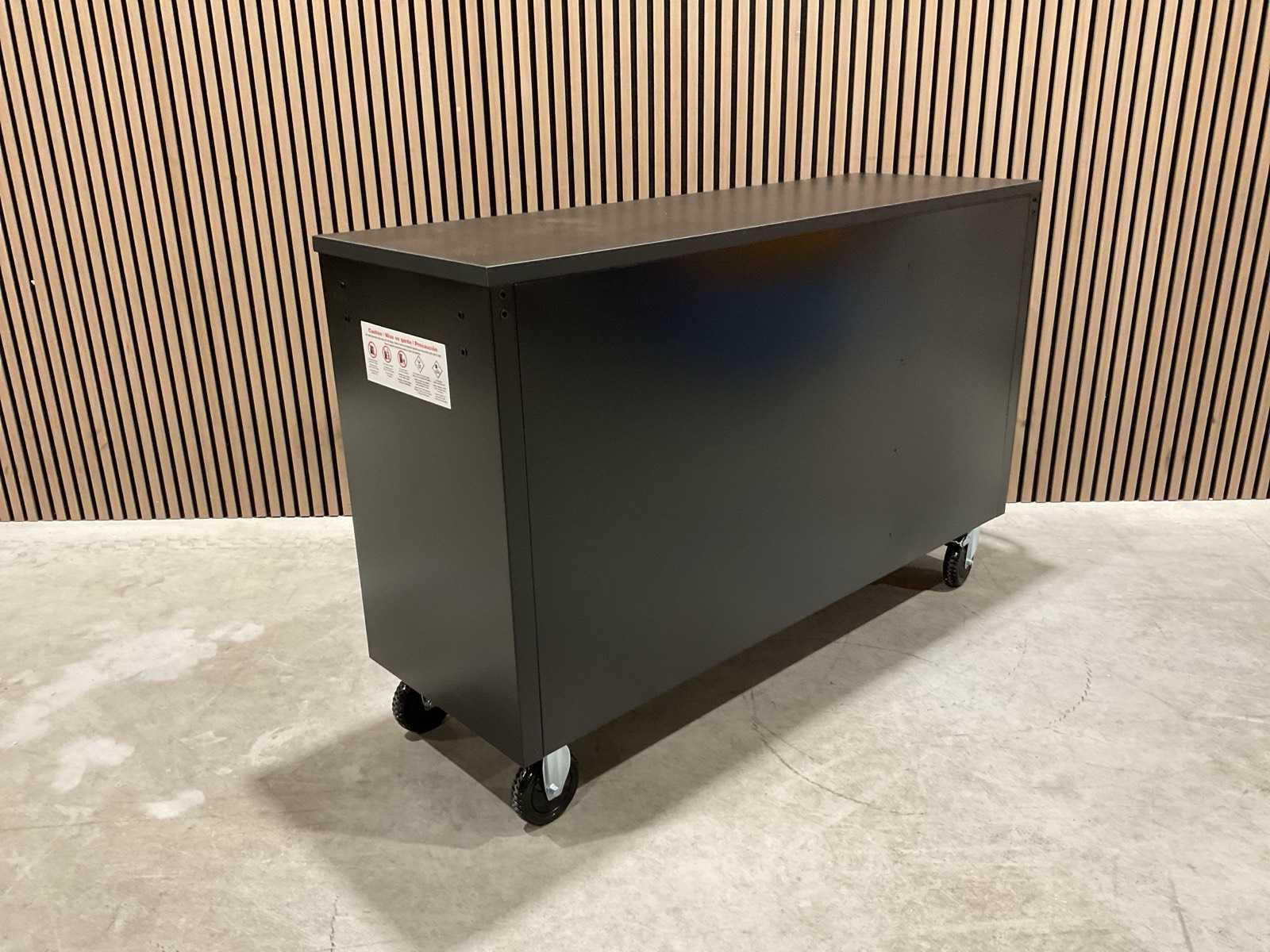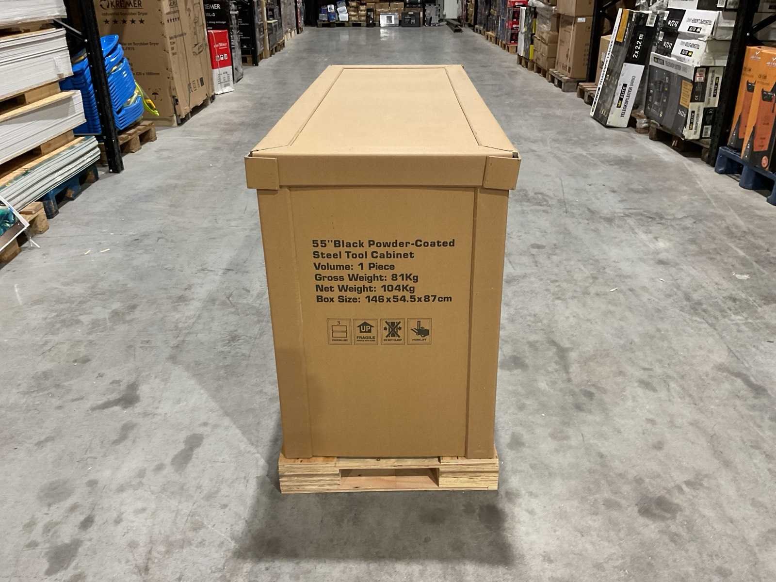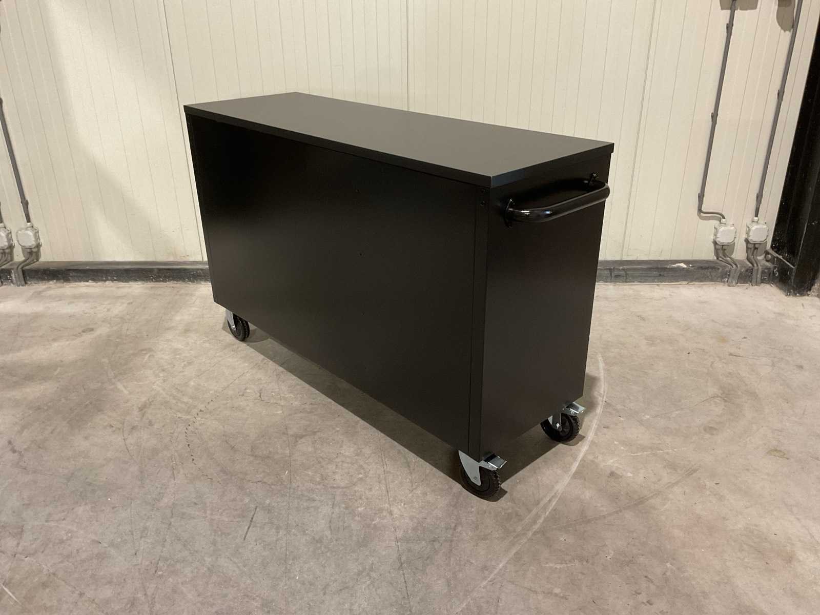 Voorzien van Materiaal: staal; Zwarte poedercoating; 10 lades; centraal slot; 4 wielen 2x zwenk met rem; transport gewicht: 104 kg; transport afmetingen: 146x54,5x87 cm; ongebruikt in doos Merk: 55” ZWART Type: HTC5510W