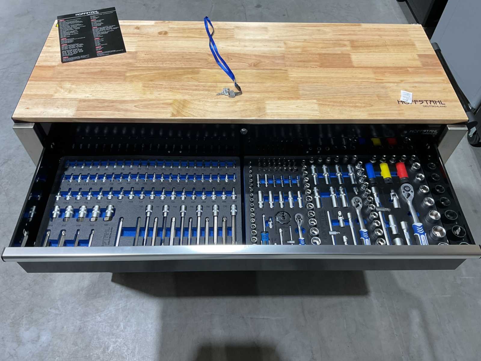 Voorzien van 11 lades waarvan 9 gevuld met gereedschap; professioneel chroom-vanadium gereedschap; heavy duty gereedschapswagen; houten werkblad; 4 wielen; stevig handvat; ongebruikt in doos (transport afmetingen 140x55x100 cm) Merk: Hoffstahl Type: Deutschland XXXL Bouwjaar: 2025 Aantal laden: 11 Met inhoud: true Eigen gewicht: 185kg Totale afmeting L: 1400mm Totale afmeting Breedte: 550mm Totale afmeting Hoogte: 100mm