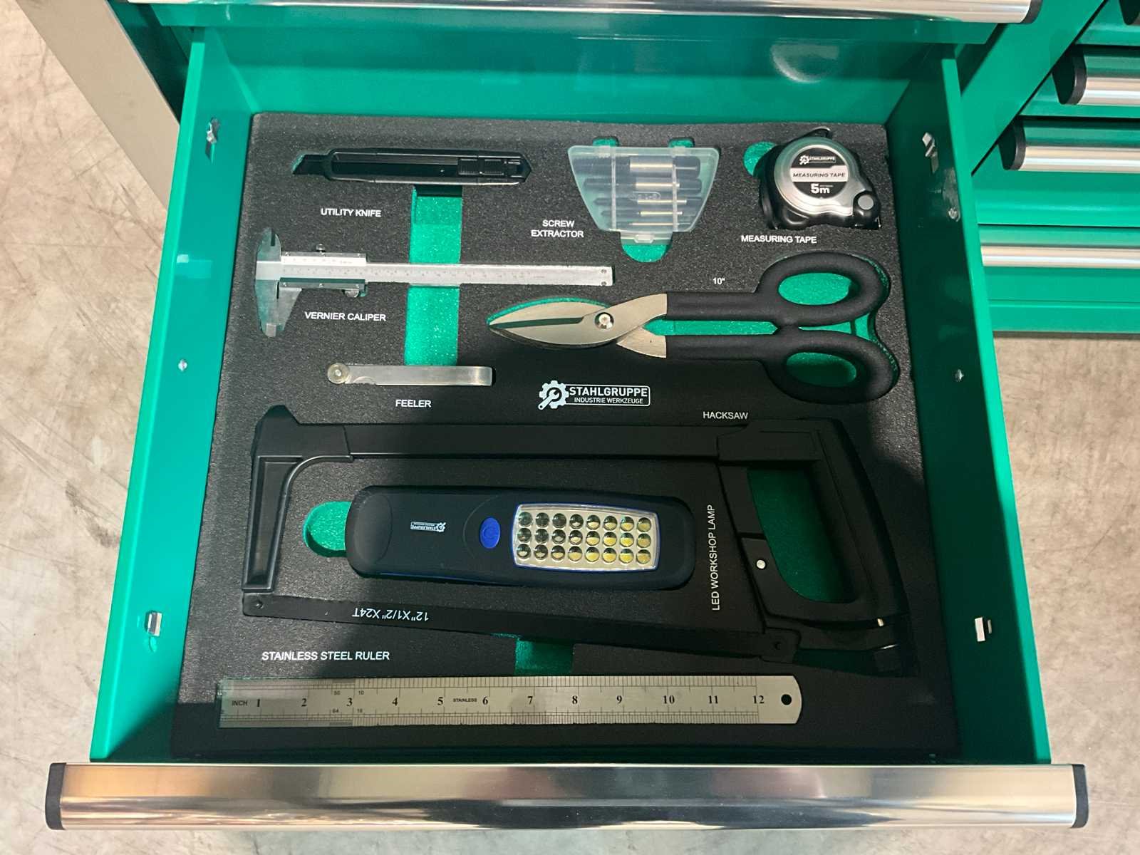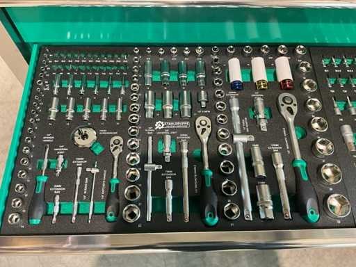 Voorzien van 11 lades waarvan 9 gevuld met gereedschap; professioneel chroom-vanadium gereedschap; heavy duty gereedschapswagen; houten werkblad; 4 wielen; stevig handvat; ongebruikt in doos (transport afmetingen 140x60x115 cm) Merk: Stahlgruppe Type: SG54 Bouwjaar: 2025 Aantal laden: 11 Eigen gewicht: 200kg