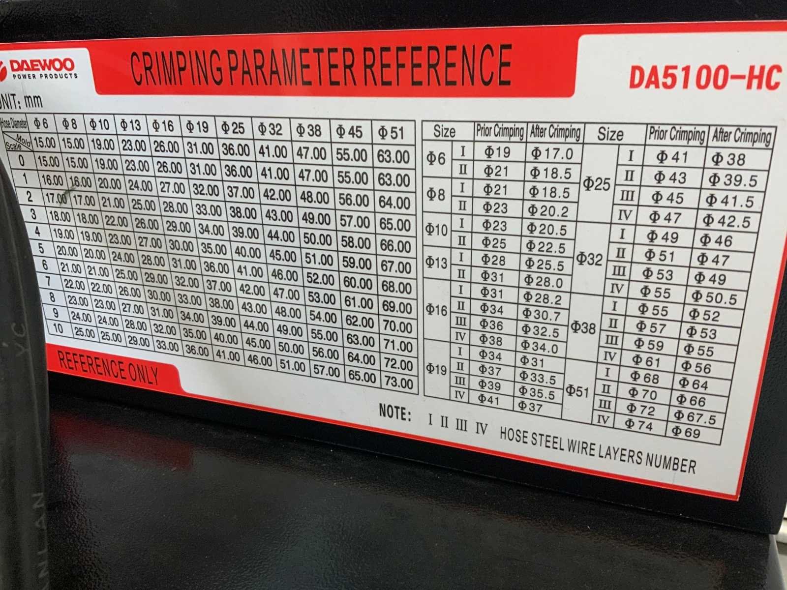 Crimping range 15-63mm; max opening 75mm; pressure 53,5 Mpa; kracht 500 T; 3000W; 380V; 5585 Merk: Daewoo Type: DA5100-HC Eigen gewicht: 280kg Totale afmeting L: 770mm Totale afmeting Breedte: 530mm Totale afmeting Hoogte: 1320mm