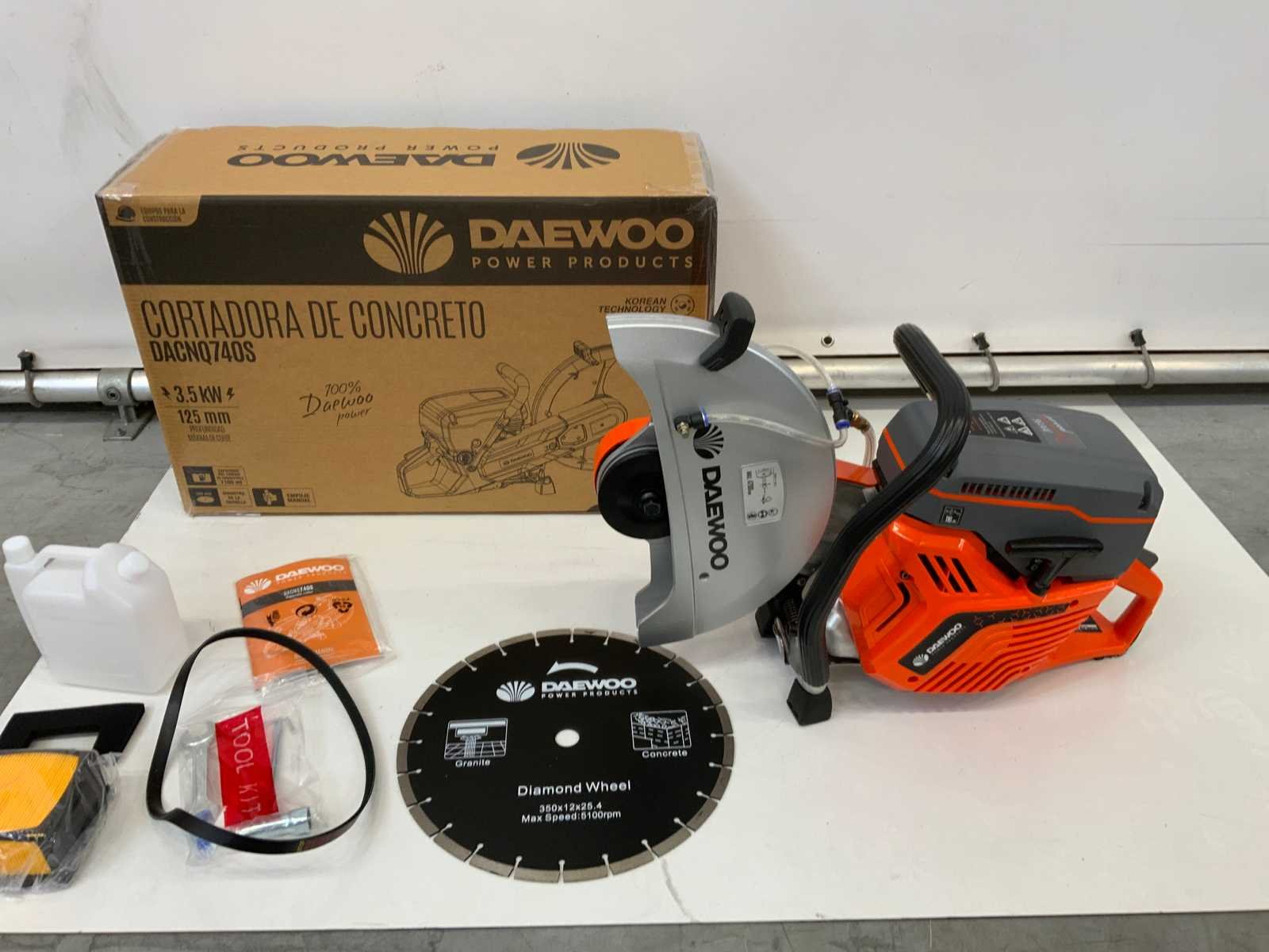 74cc; tankinhoud 1100ml; handleiding; gereedschap; filter en snaar; diamandzaag 350x12x25.4 max speed 5100rpm; graniet en beton;4893 Merk: Daewoo Type: DACNQ740S Bouwjaar: 2025 Diameter zaagblad: 350mm Motorvermogen (kW): 3.50kW Eigen gewicht: 13kg