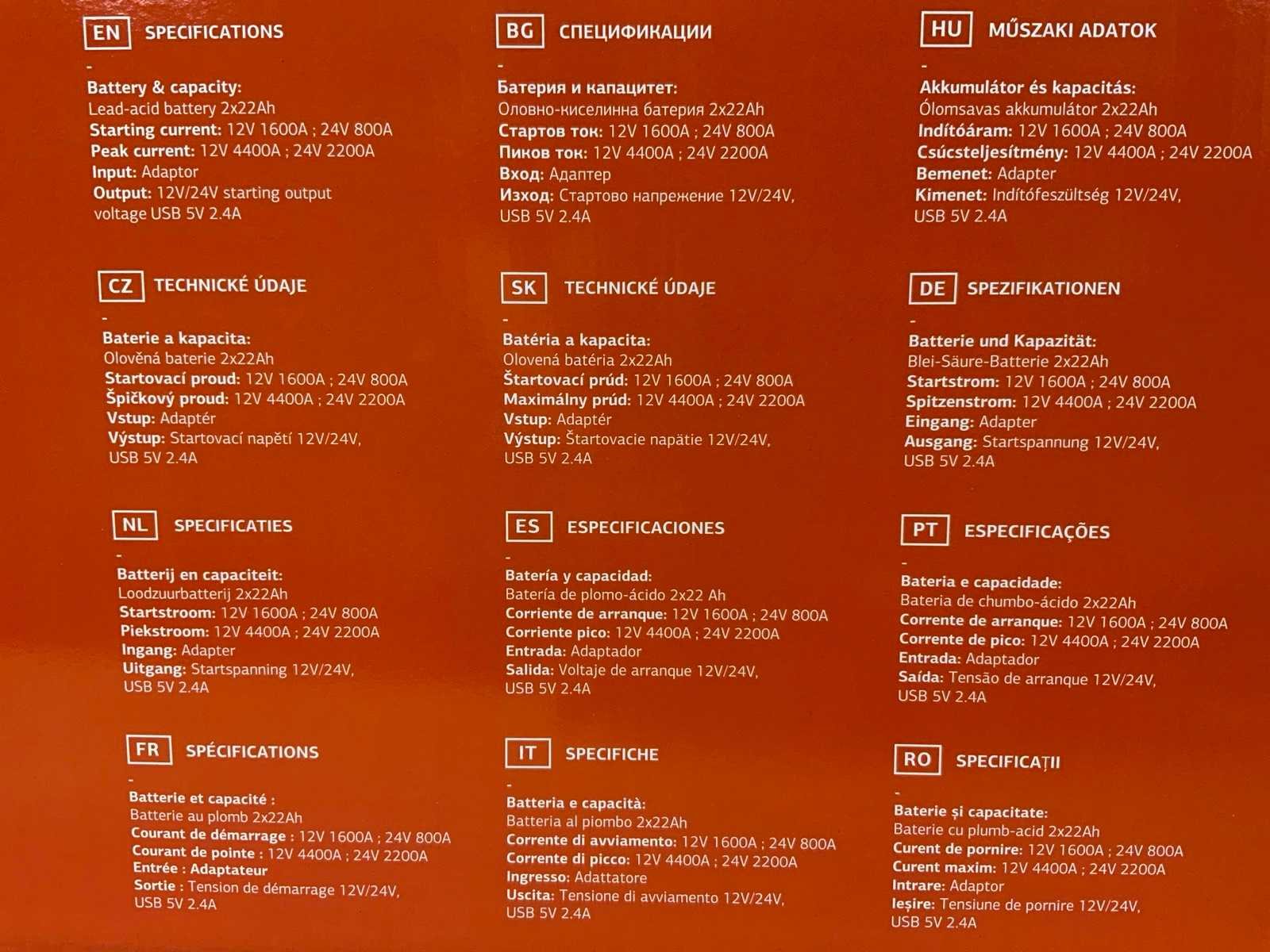 12/24v dual voltage; peak 12v 4400A/ 24v 2200A; usb charger; 230v; 50hz; ongebruikt; in verpakking; Merk: Daewoo Type: DAJSA4400 Bouwjaar: 2025 Totale afmeting L: 450mm Totale afmeting Breedte: 260mm Totale afmeting Hoogte: 460mm