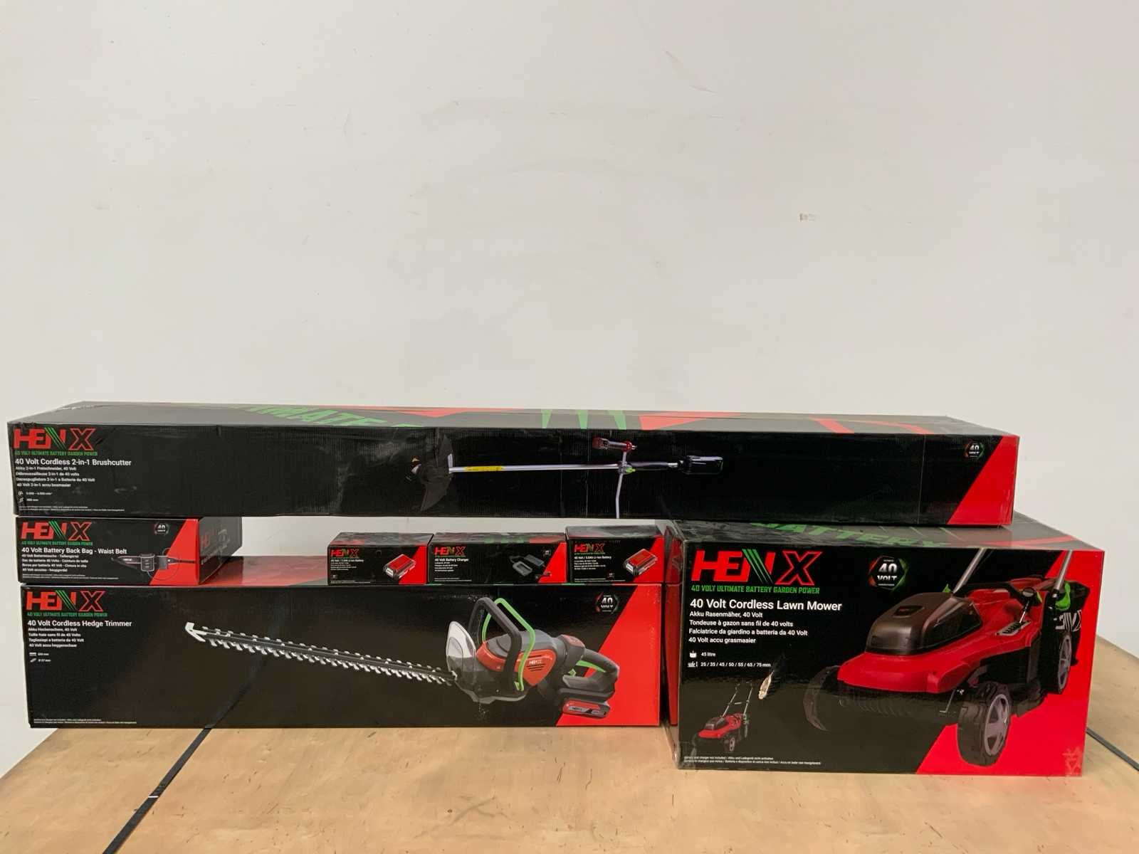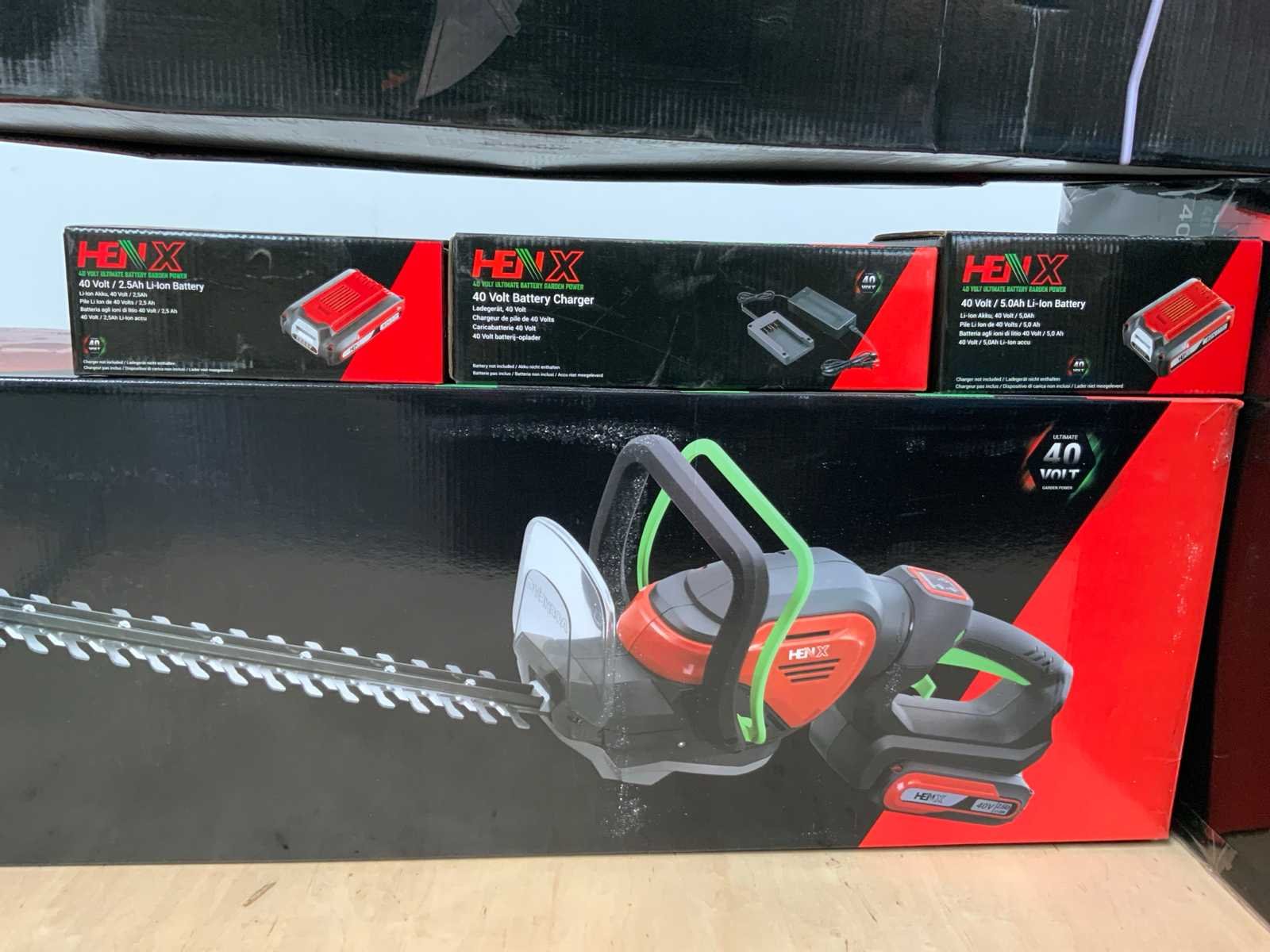 2 accu’s; 2.5AH & 5.0AH; 1x grasmaaier; 1x heggenschaar; 1x 2in1 bruschcutter; 40V batterij waist belt; Merk: Henx