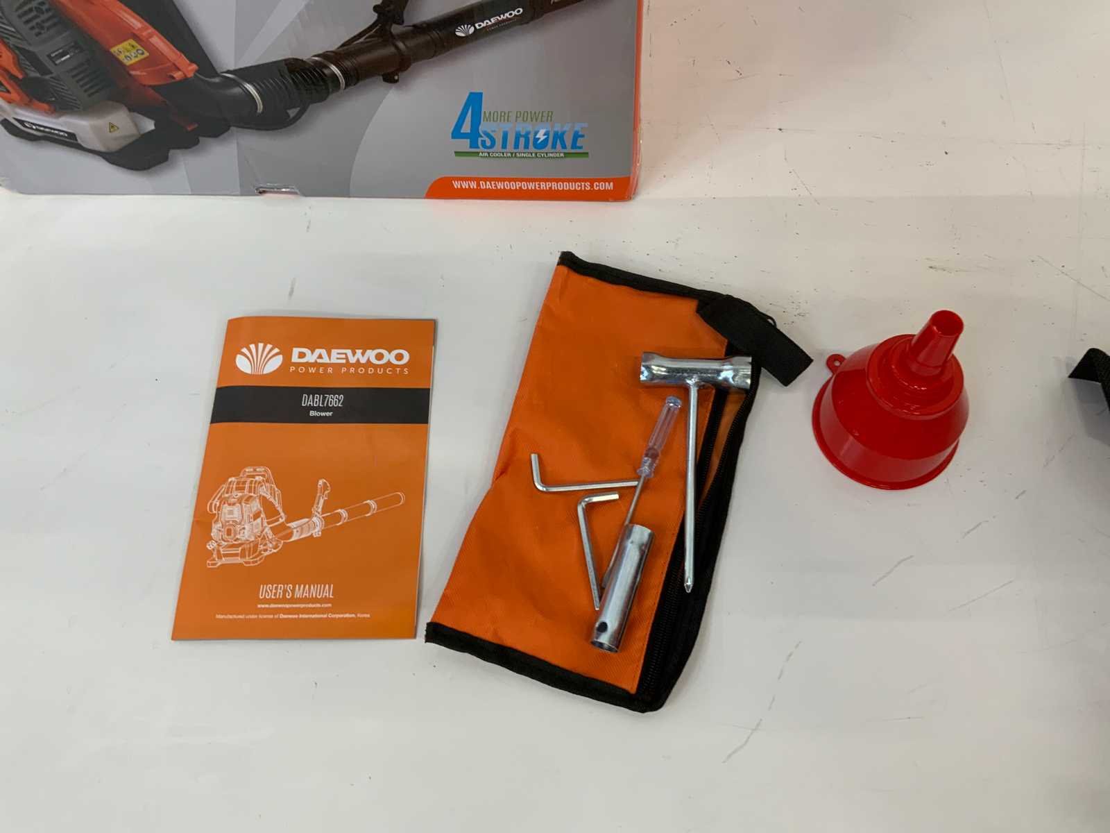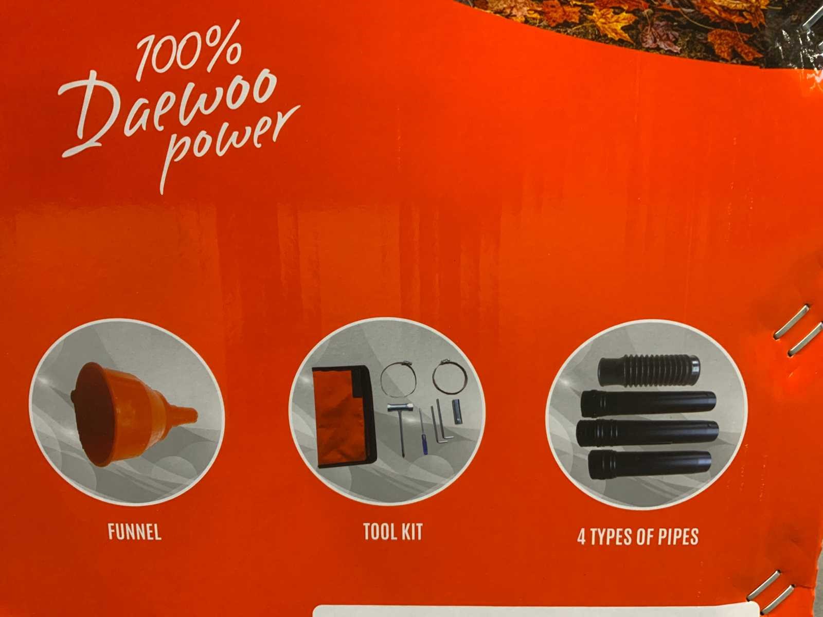 2.2kW;lucht volume 950m3/h;speed 82m/s;tankinhoud 2000ml;handleiding;gereedschap;4892 Merk: Daewoo Model: DABL7662 Gewicht: 11kg Lengte: 1500cm Breedte: 500cm Hoogte: 500cm