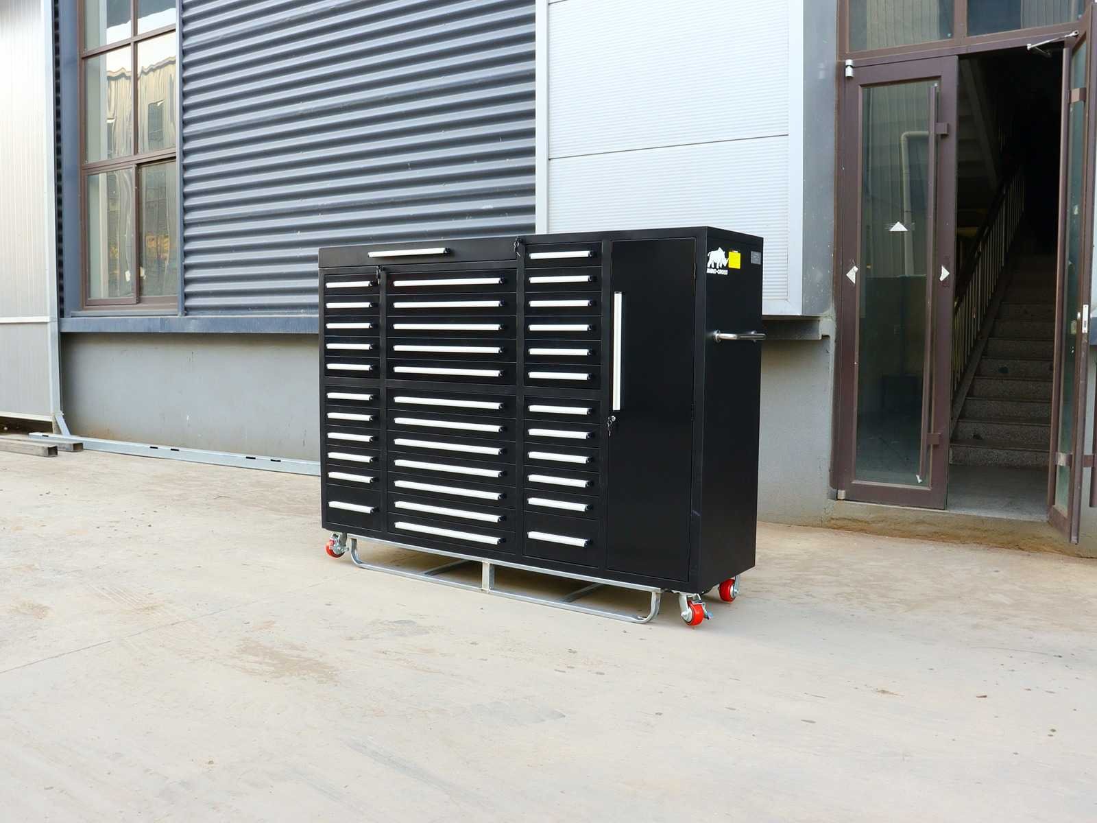 Voorzien van Gepoedercoat staal; 35 lades; 1 Deur; 1 bovenkast; Ongebruikt (Transport afmetingen 2875x725x1140mm) Merk: Rhino-Cross-Workbench Product type: H7ft-35D-1-L-01C Zwart