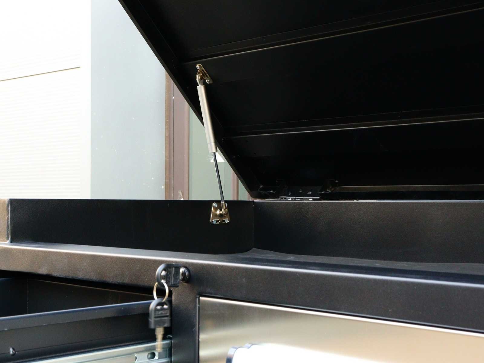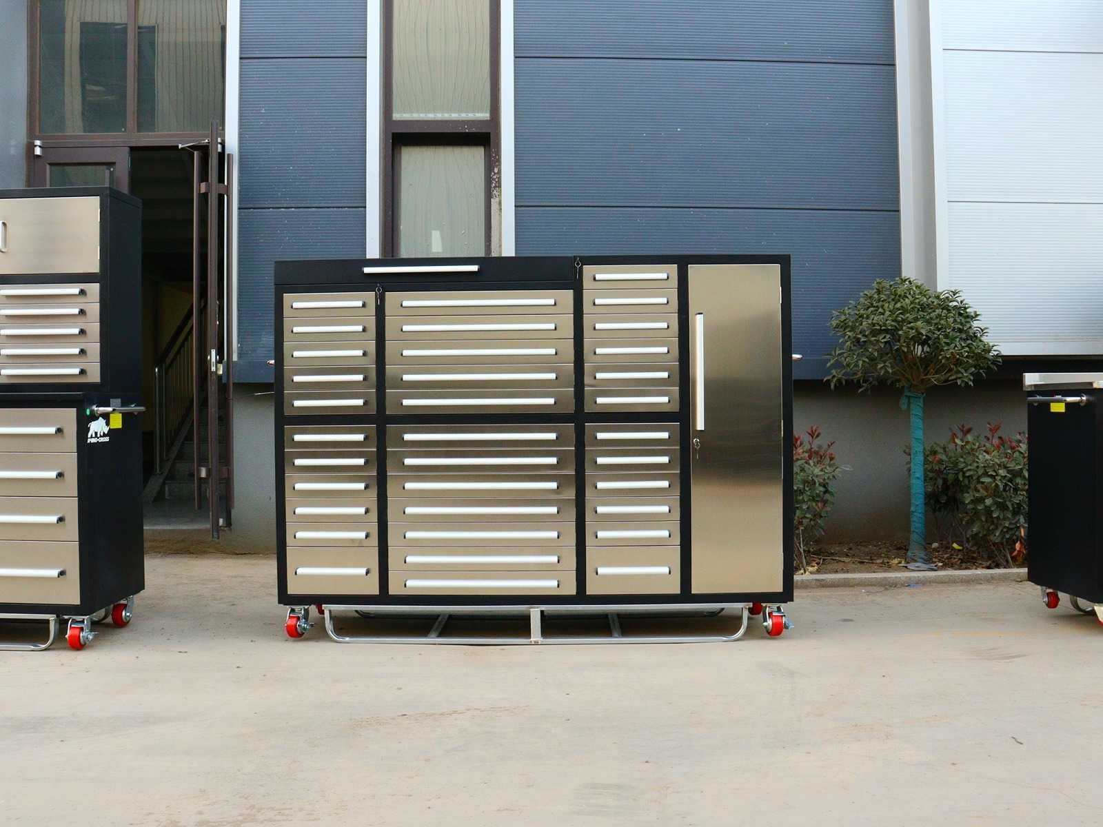 Voorzien van Gepoedercoat staal; 35 lades; 1 Deur; 1 bovenkast; Ongebruikt (Transport afmetingen 2875x725x1140mm) Merk: Rhino-Cross-Workbench Product type: H7ft-35D-1-L-01C RVS
