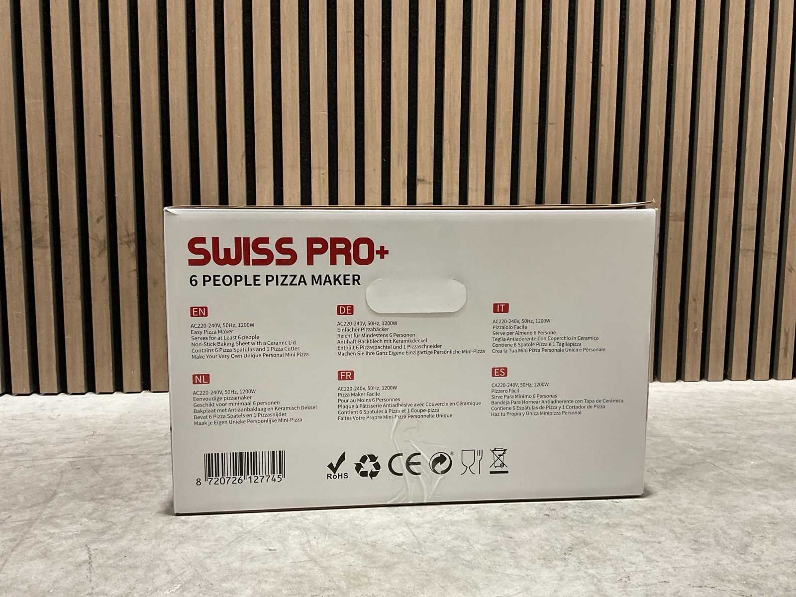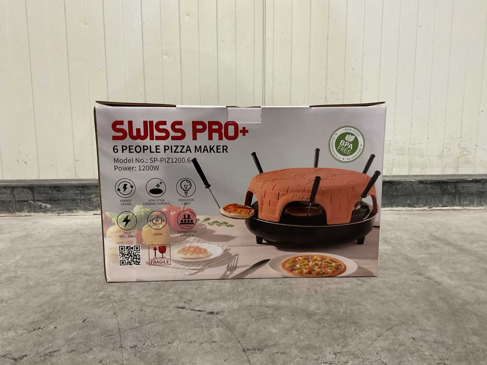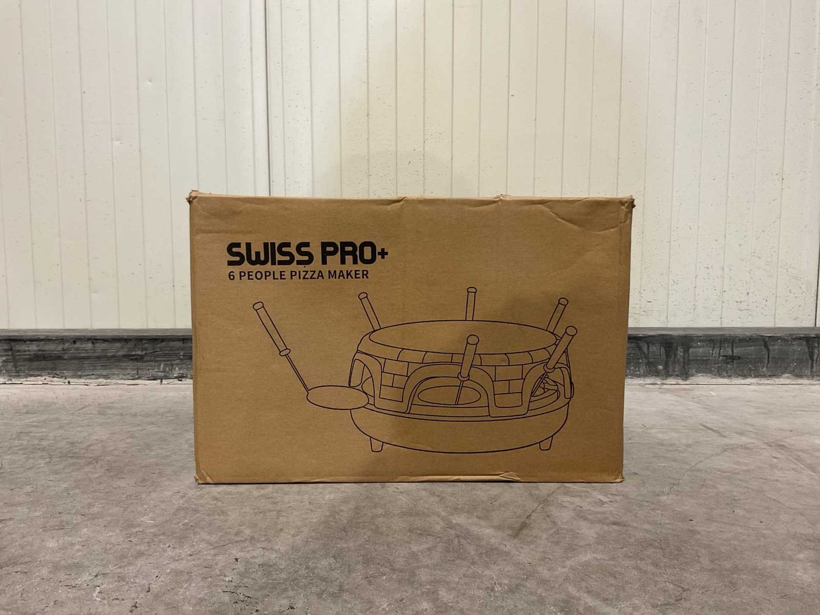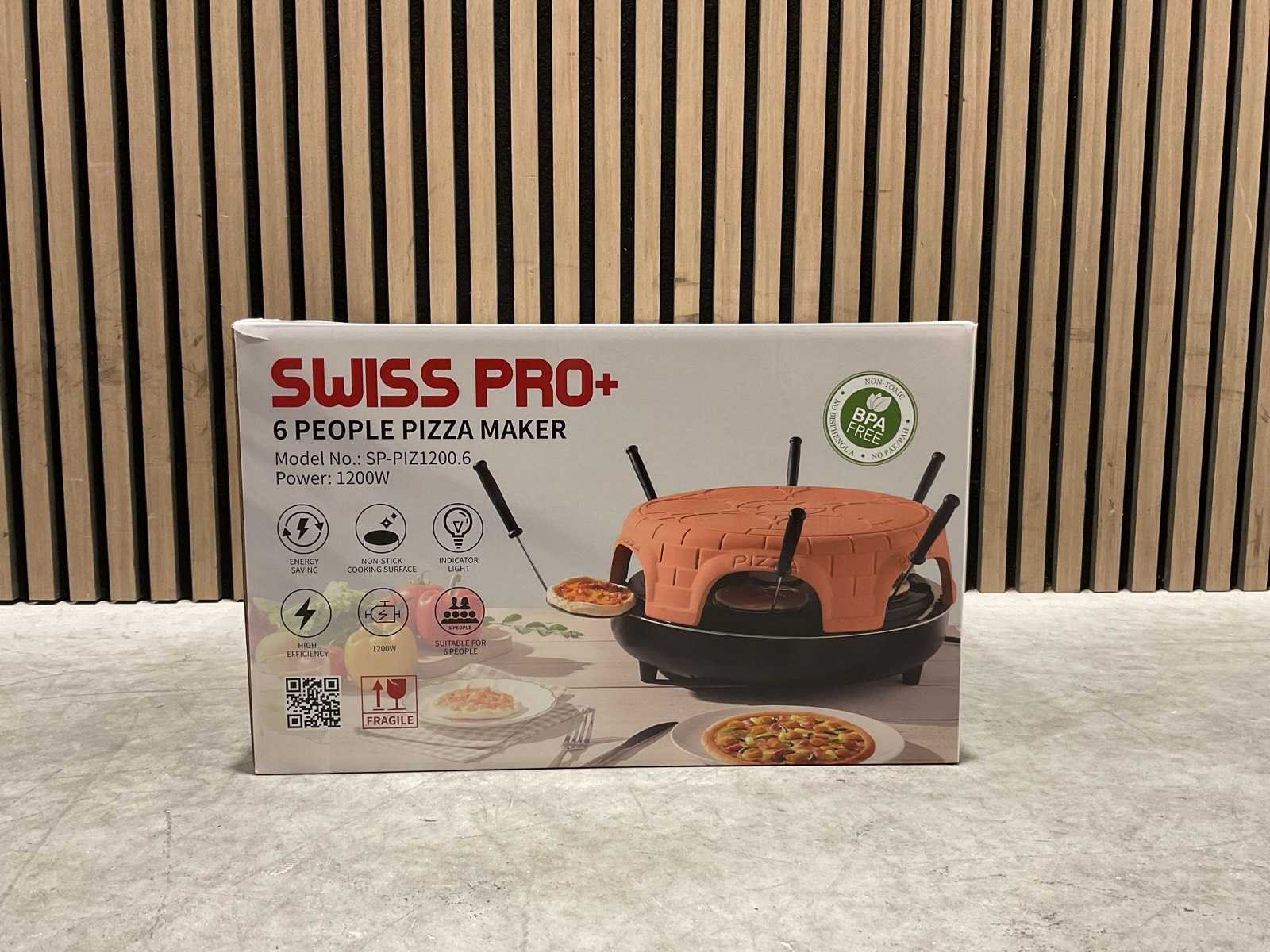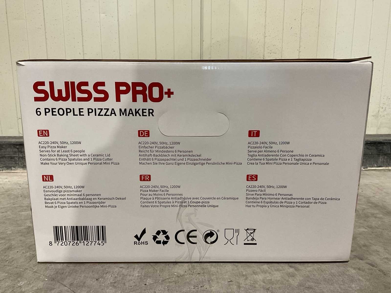 Voorzien van behuizing van IJzer; Terracotta koepel (absorbeert vocht voor knapperige bodem); RVS Bakplaat; Antiaanbaklaag; Boven- en onderverwarming; Cool-touch ontwerp; 6 geïsoleerde bakspatels / pannetjes; Deegvorm voor mini-pizza’s; Ongebruik in doos (Transportafmeting 45*45*29) Merk: Swiss Pro+ Type: 6 people pizza maker Eigen gewicht: 7.7kg Totale afmeting L: 45cm Totale afmeting Breedte: 45cm Totale afmeting Hoogte: 29cm