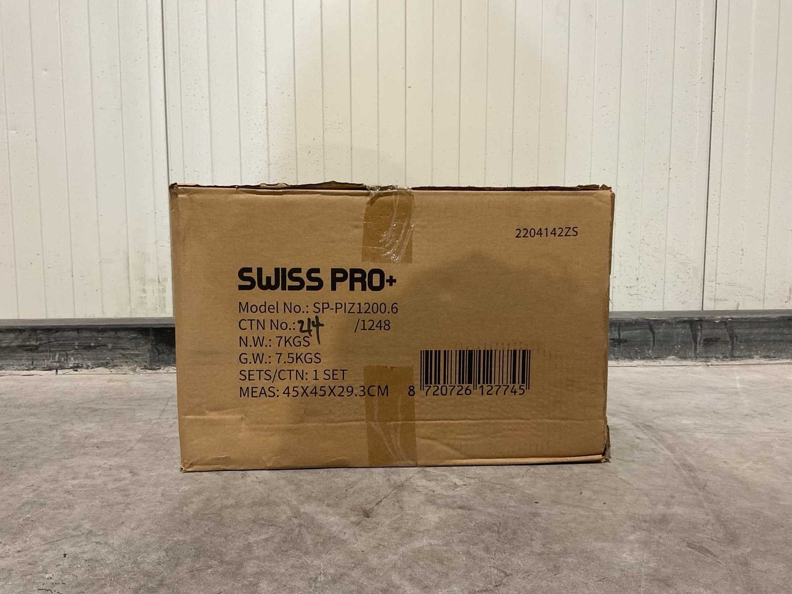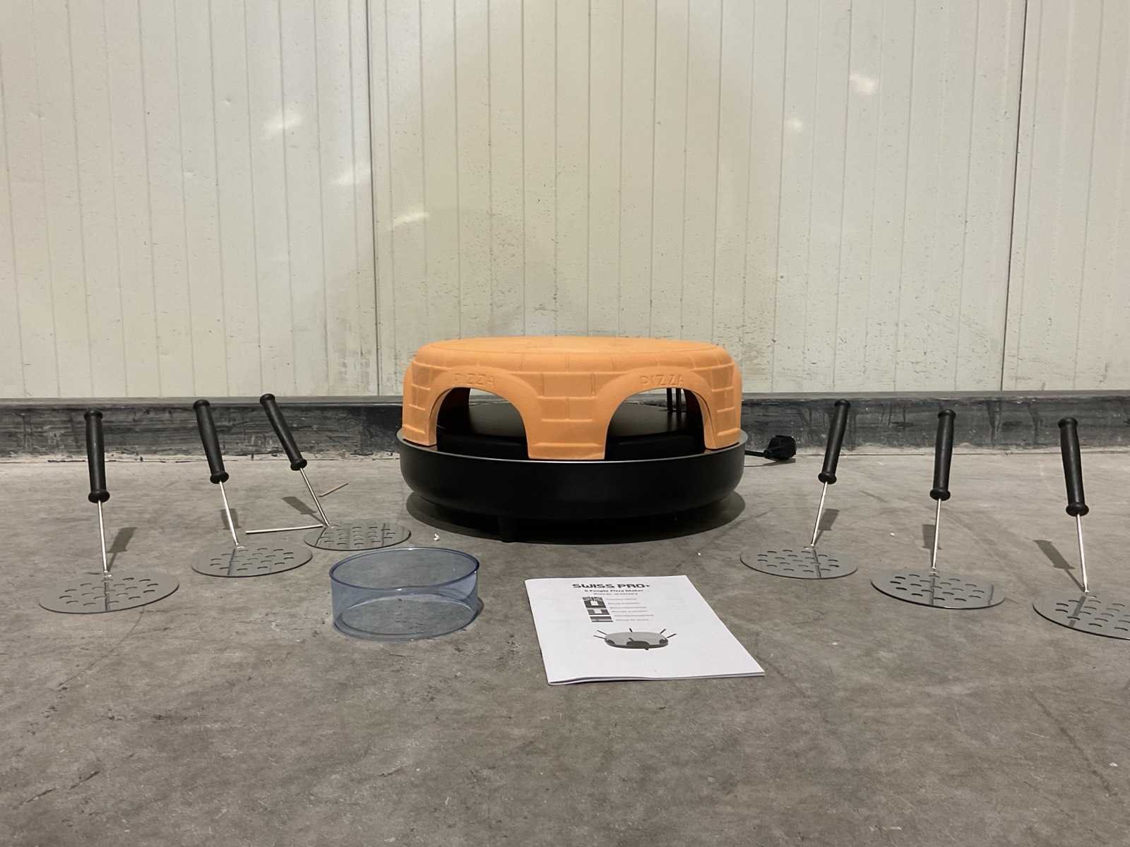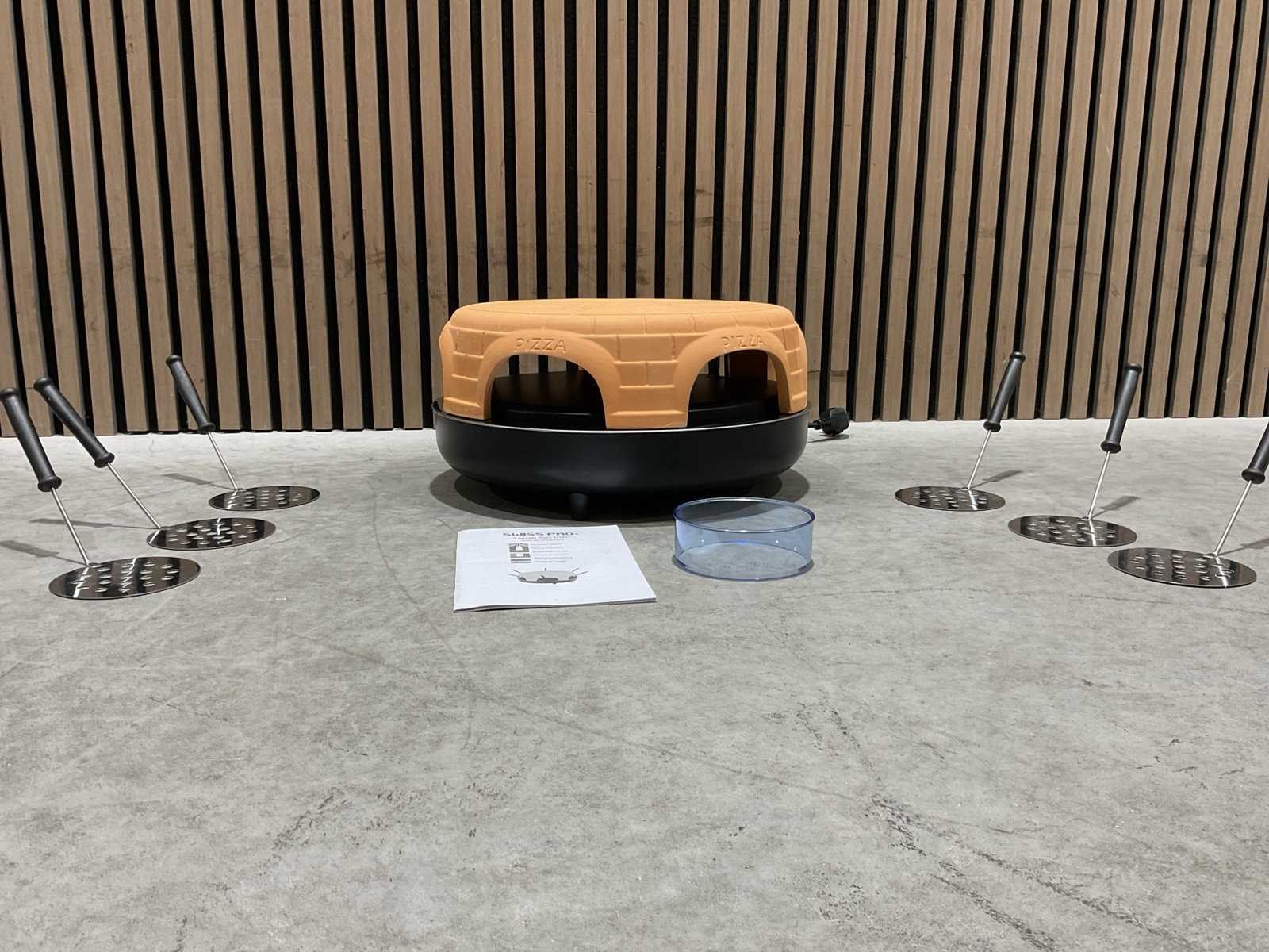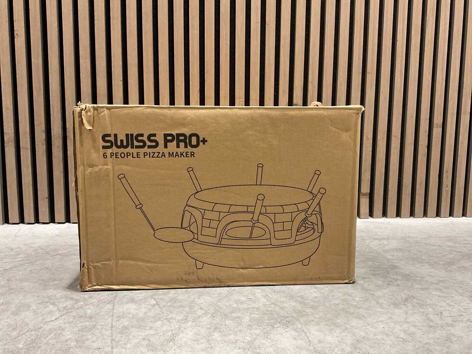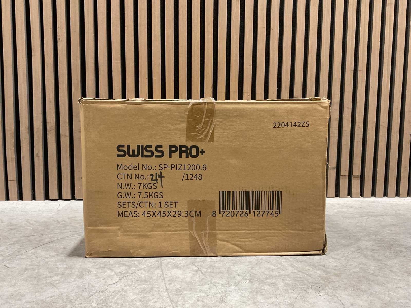 Voorzien van behuizing van IJzer; Terracotta koepel (absorbeert vocht voor knapperige bodem); RVS Bakplaat; Antiaanbaklaag; Boven- en onderverwarming; Cool-touch ontwerp; 6 geïsoleerde bakspatels / pannetjes; Deegvorm voor mini-pizza’s; Ongebruik in doos (Transportafmeting 45*45*29) Merk: Swiss Pro+ Type: 6 people pizza maker Eigen gewicht: 7.7kg Totale afmeting L: 45cm Totale afmeting Breedte: 45cm Totale afmeting Hoogte: 29cm