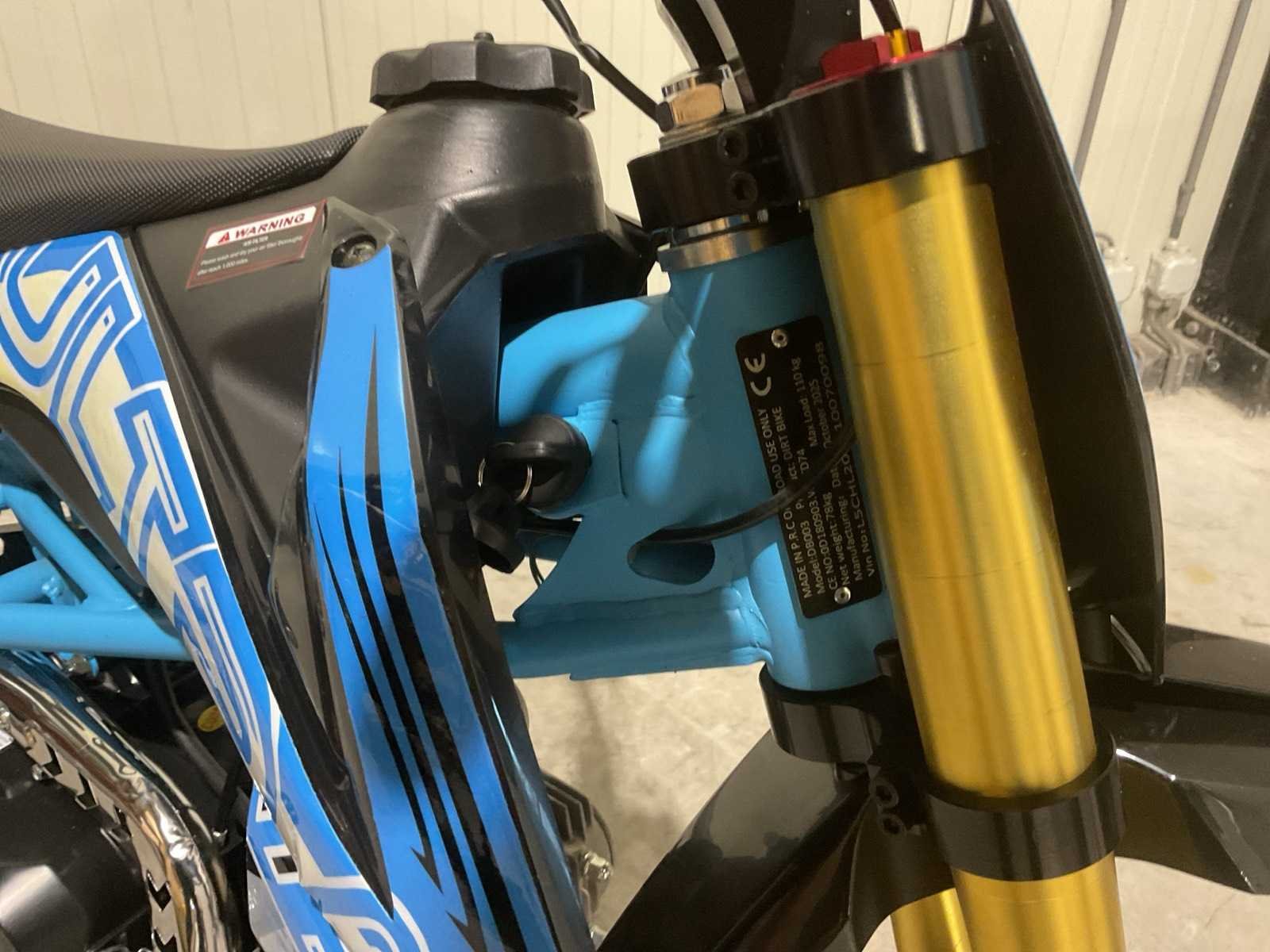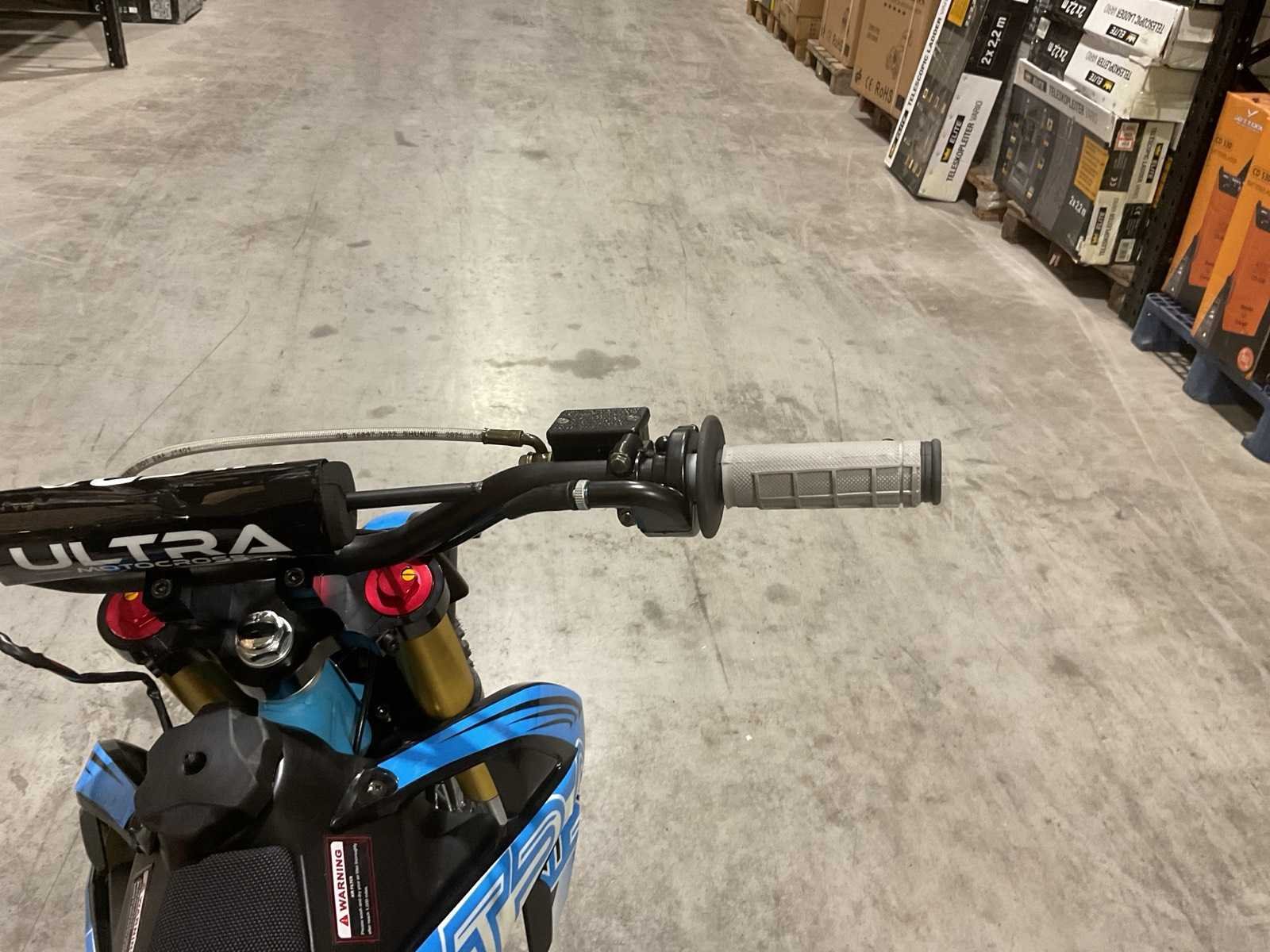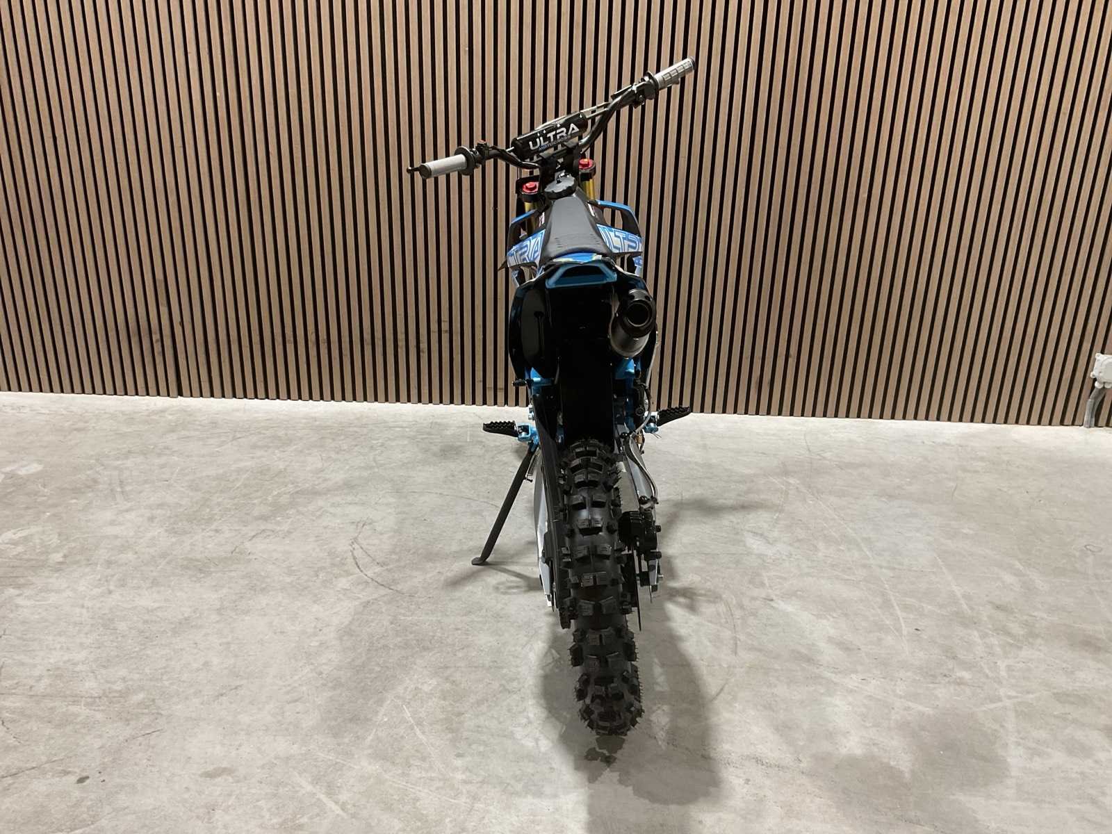 Voorzien van motor: 125 cc, 4-takt, 11 pk; Brandstof: benzine (4-takt); Transmissie: schakel; Remmen: hydraulische schijfremmen; Bandenmaat: voor 17" / achter 14"; Transportafmetingen (in doos): 135 × 45 × 65 cm; Transport gewicht: 78kg; ongebruikt in doos Merk: Ultra Motocross Model: DB003 Type: Pitbike 2025 BL Cilinderinhoud: 125cc Gewicht: 71kg Kleur: Blauw