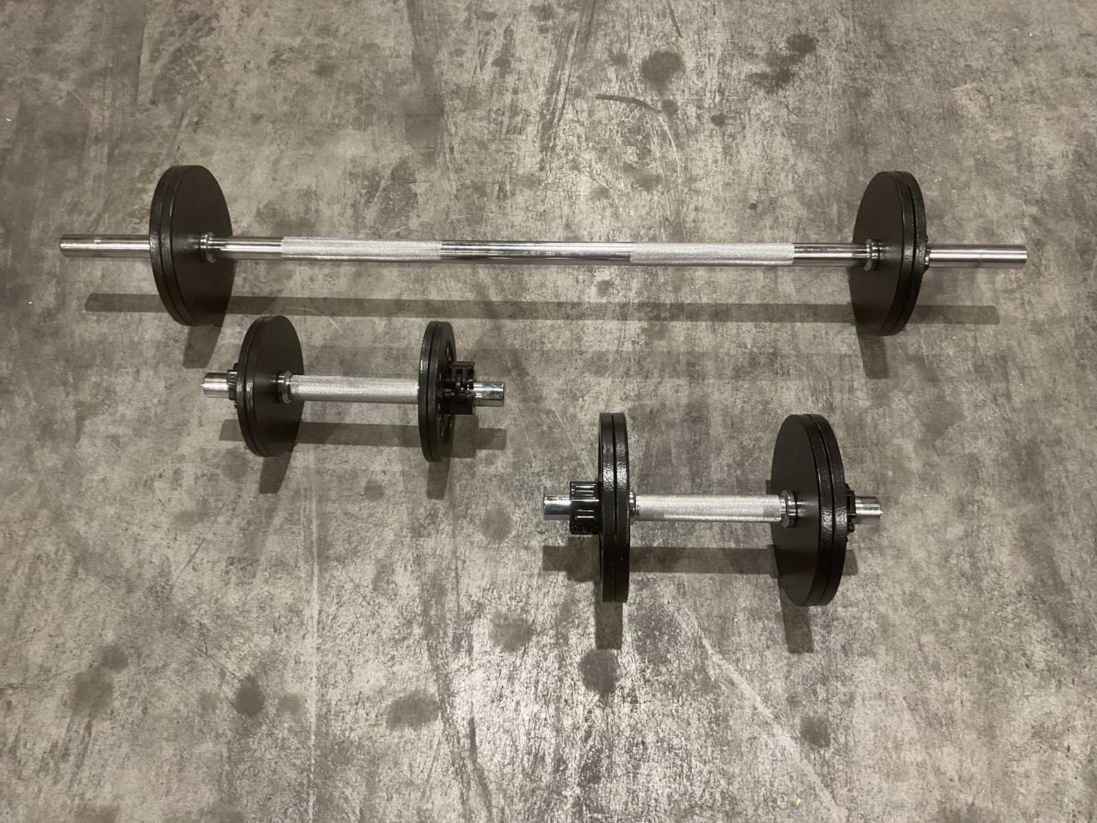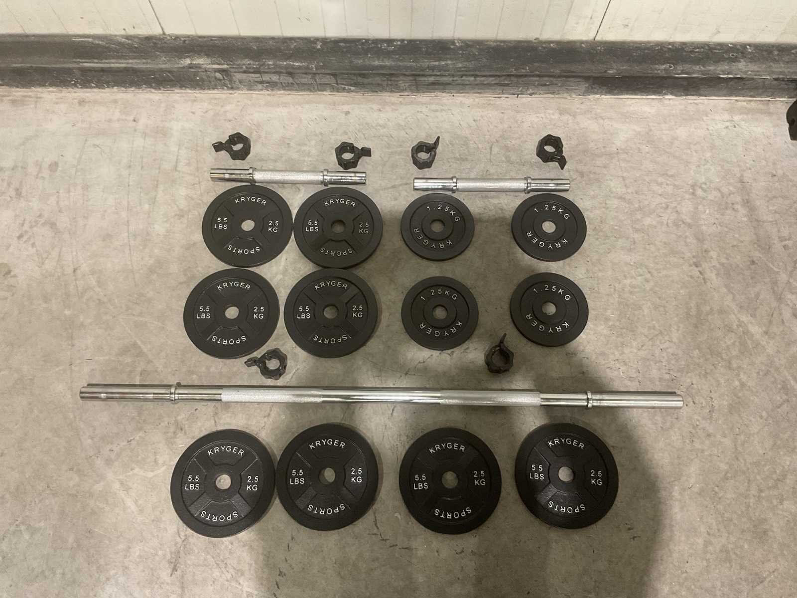 1x Barbell 120cm | 7KG 2x Dumbell 35cm | 2KG 6x Quick-release halterklemmen 4x Halterschijf 1.25kg black 8x Halterschijf 2.5kg black 2x Bar strap | enkelband 1x Single Grip | Deuranker 2x Eenhandsgreep 1x Elastiek 50lbs/22.7kg 1x Elastiek 40lbs/18.2kg 1x Elastiek 30lbs/13.6kg 1x Elastiek 20lbs/9.1kg 1x Elastiek 10lbs/4.6kg 10x Stalen Karabijnhaak 1x Fitnessmat 1x Compacte halterbank Transport doos 1 - 30kg 1230x245x500 mm doos 2 - 25 kg 205x205x205 Merk: Kryger Sports