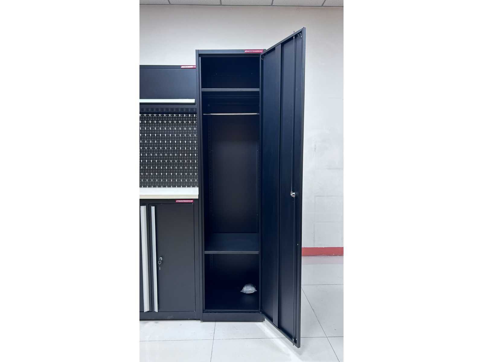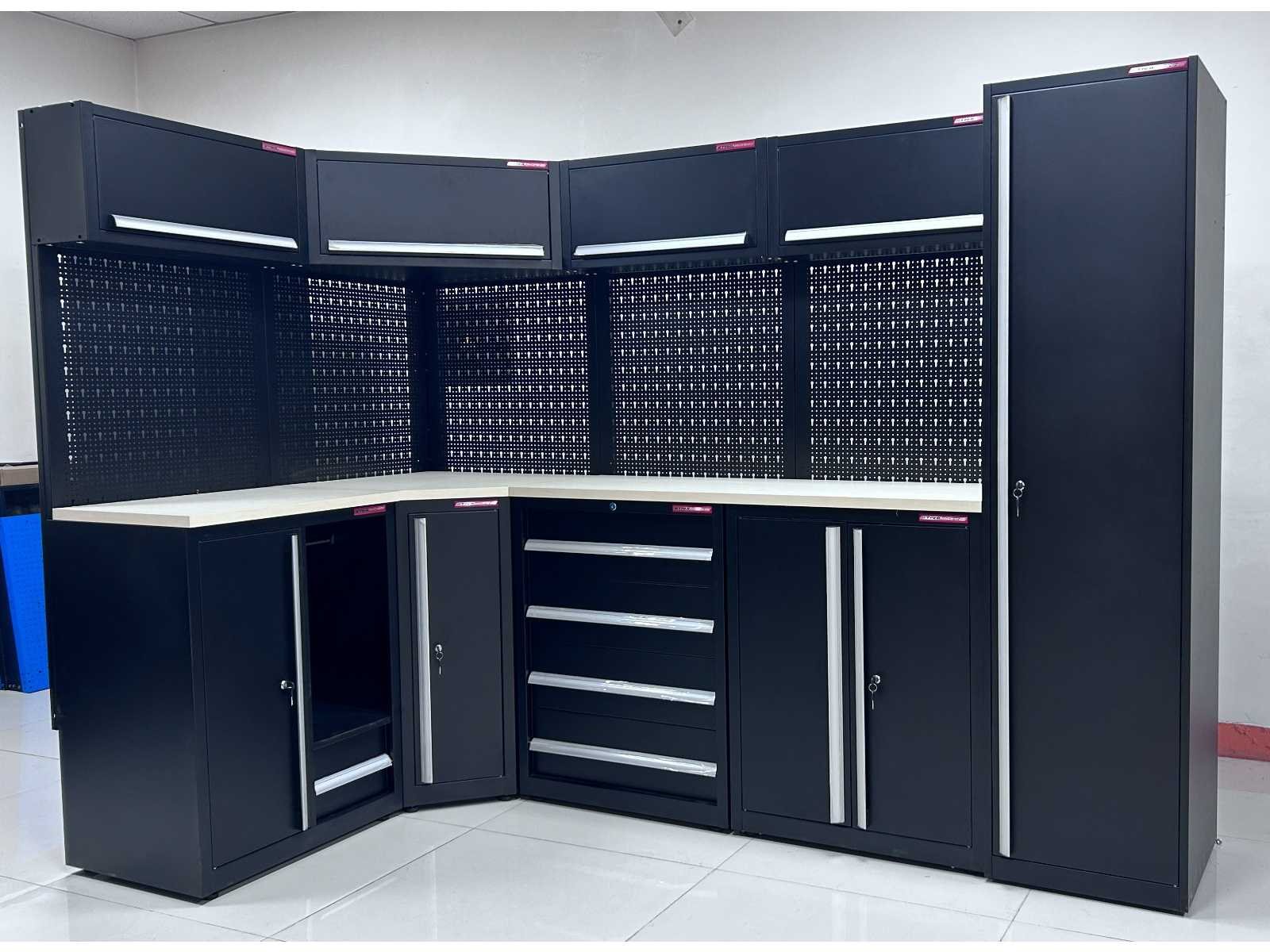 Voorzien van poeder coating; 30 mm houten werkblad; kleur zwart; ongebruikt in dozen (transport afmeting 1,9 m3) Merk: Stahlworks Model: TC-204 Product type: 155x55x203 / 280x55x203 cm Materiaal: SPCC steel