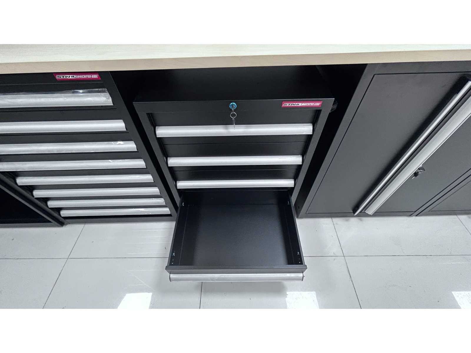 Voorzien van poeder coating; 30 mm houten werkblad; kleur zwart; ongebruikt in dozen (transport afmeting 3 m3) Merk: Stahlworks Model: TC-202 Product type: 550x55x203 cm Materiaal: SPCC steel