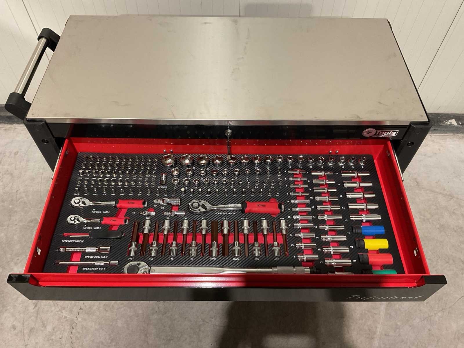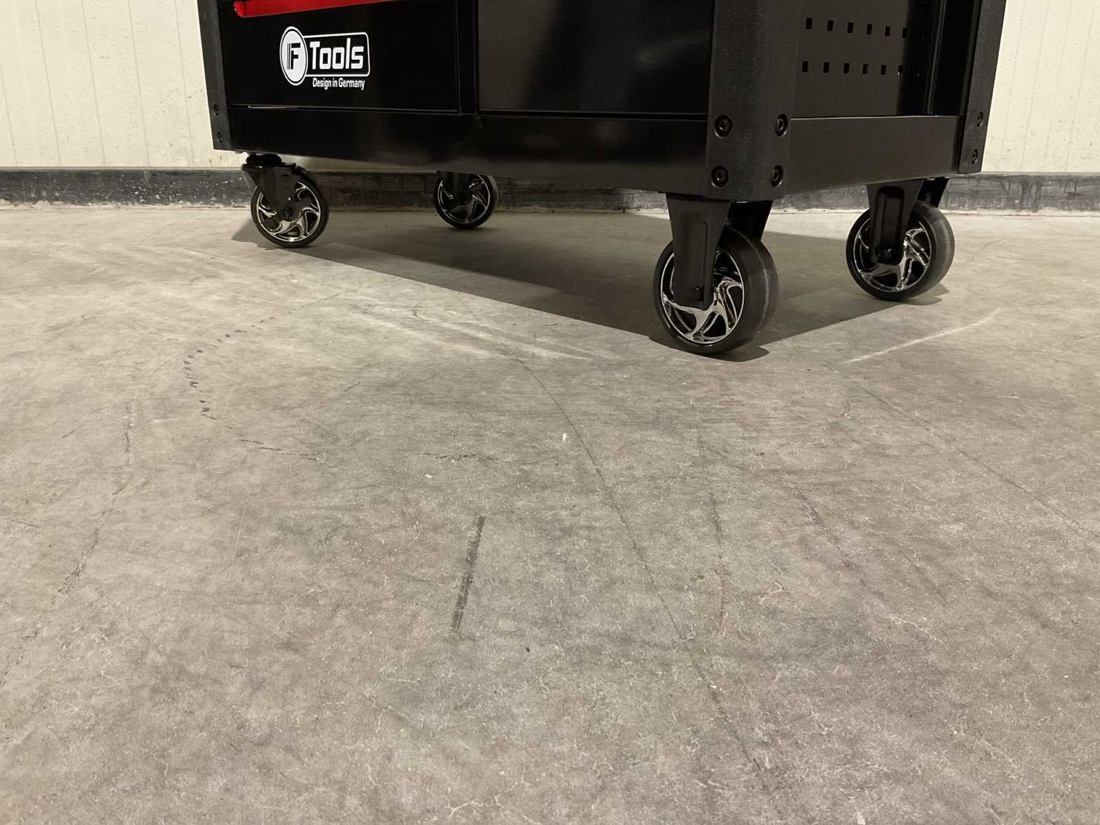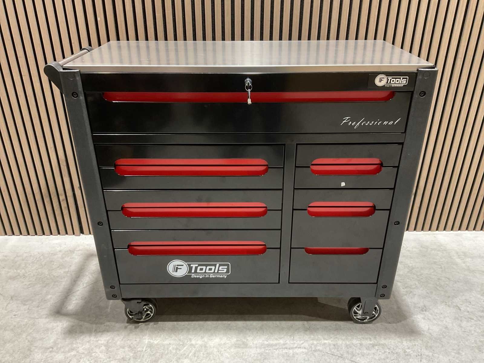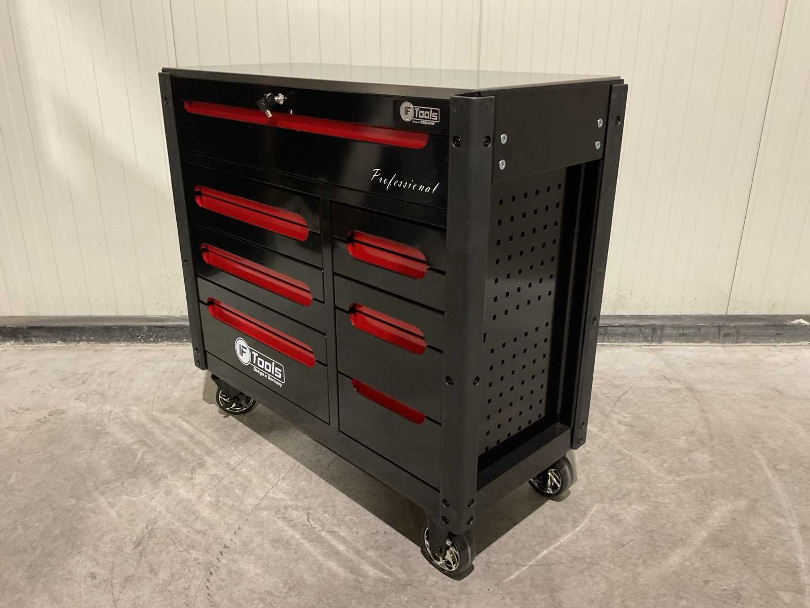 Voorzien van 11 lades; 10 gevuld; divers gereedschap; Materiaal: staal; 2 vaste wiel; 2 zwenkwielen; transport gewicht: 122kg; transport afmetingen: 1086x510x870 mm; ongebruikt in doos Merk: Ftools Type: Tool Trolley Black & Red