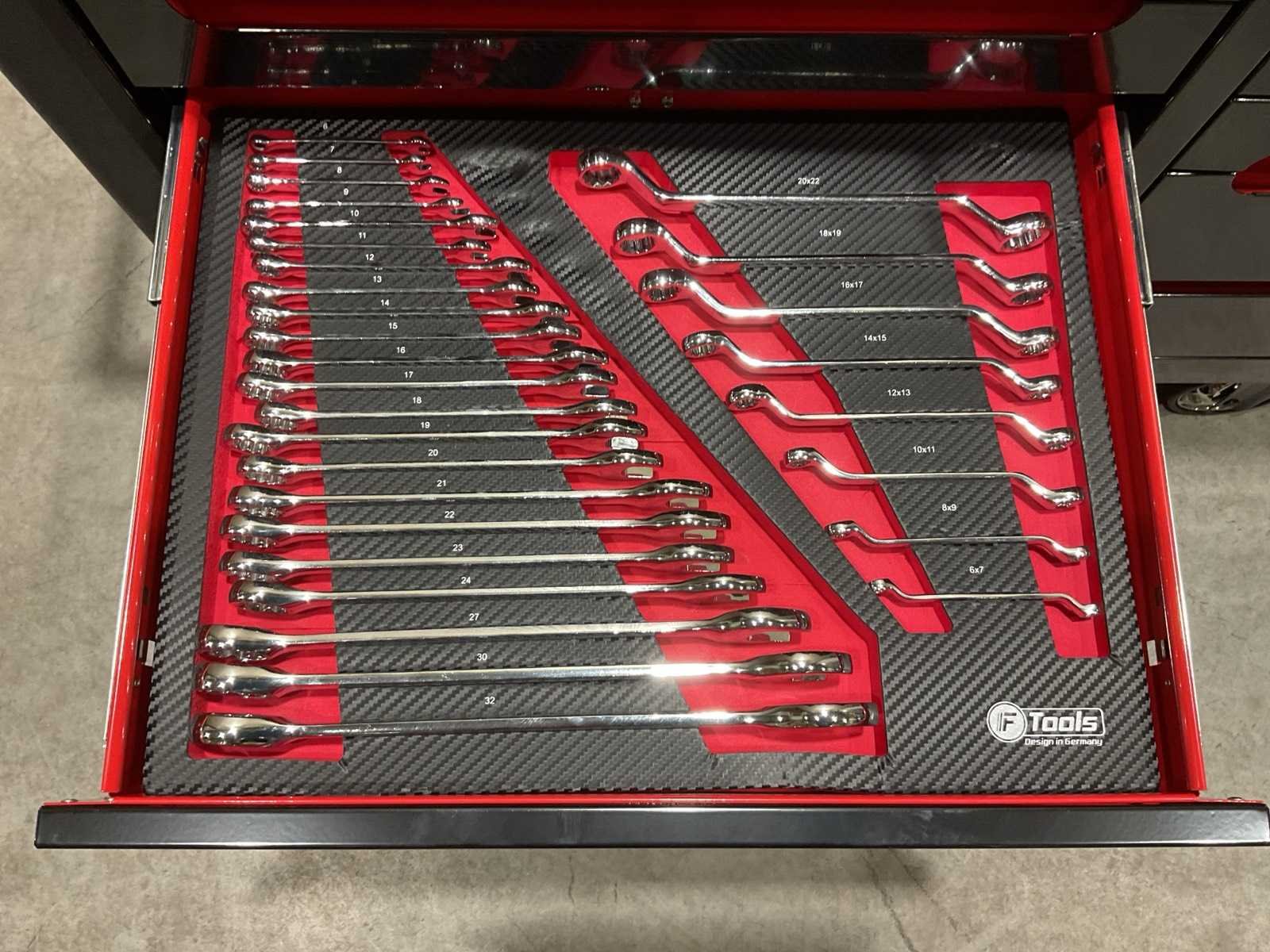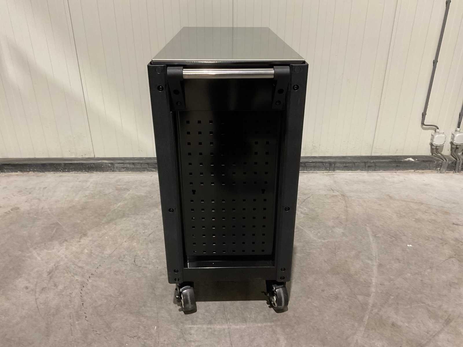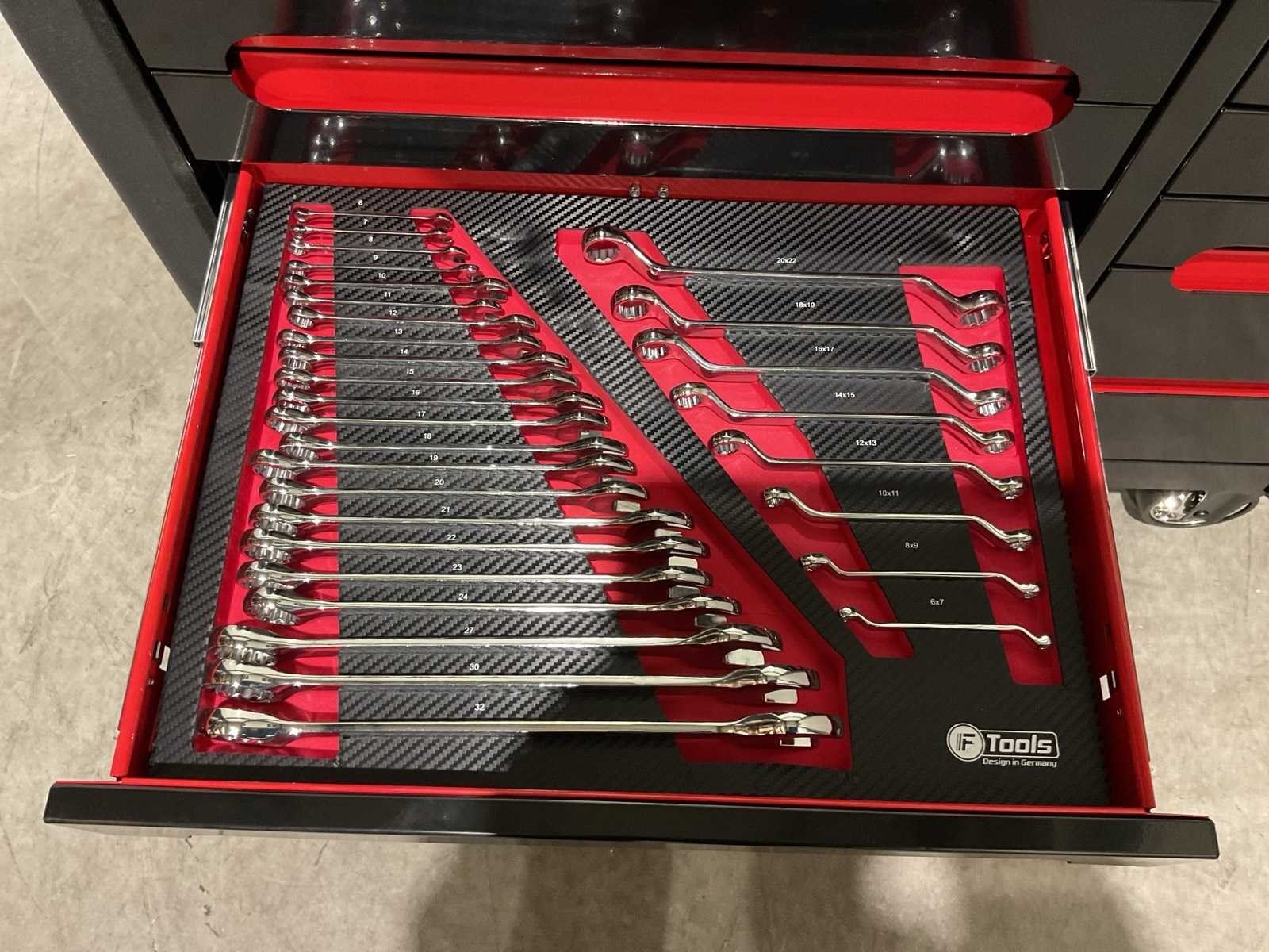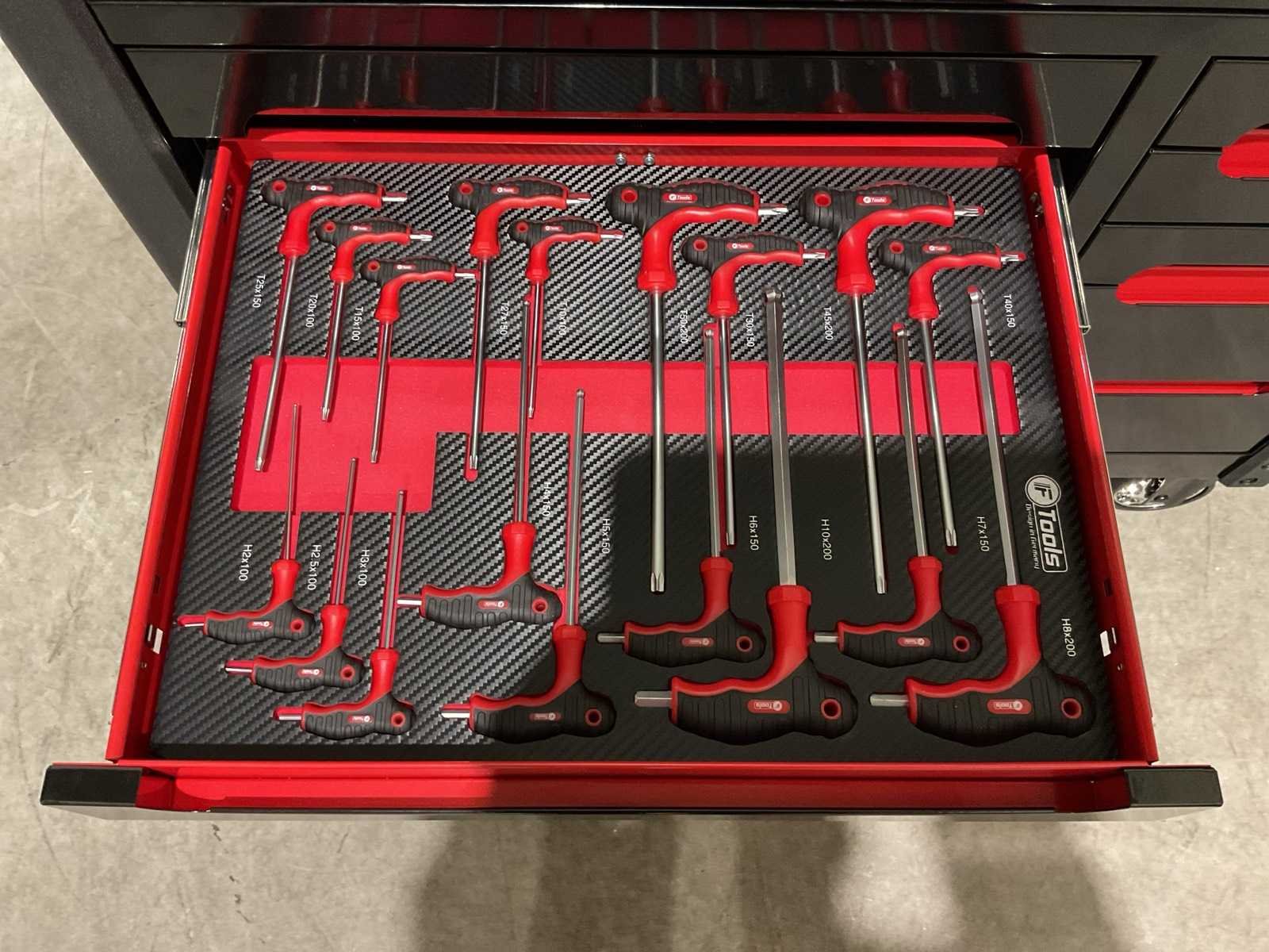 Voorzien van 11 lades; 10 gevuld; divers gereedschap; Materiaal: staal; 2 vaste wiel; 2 zwenkwielen; transport gewicht: 122kg; transport afmetingen: 1086x510x870 mm; ongebruikt in doos Merk: Ftools Type: Tool Trolley Black & Red