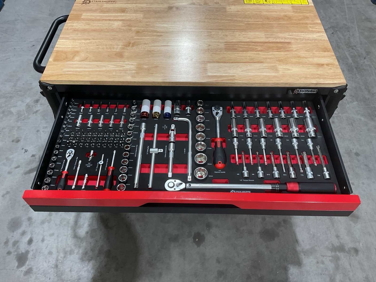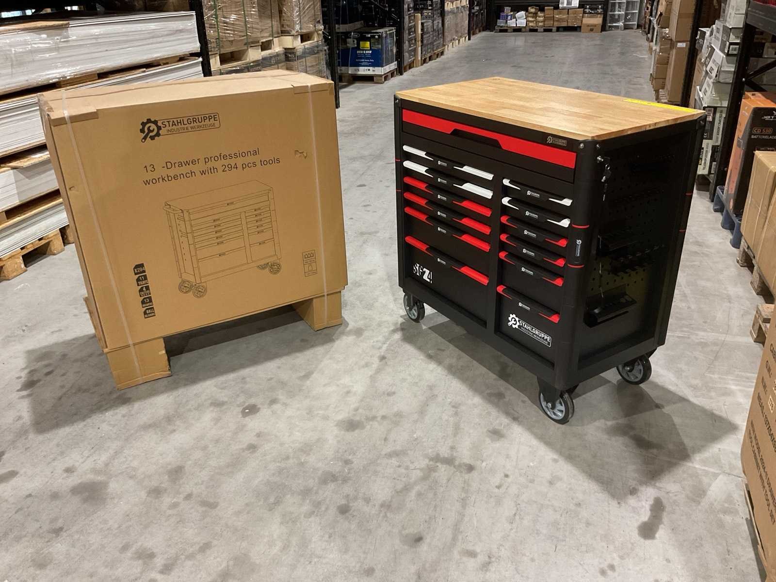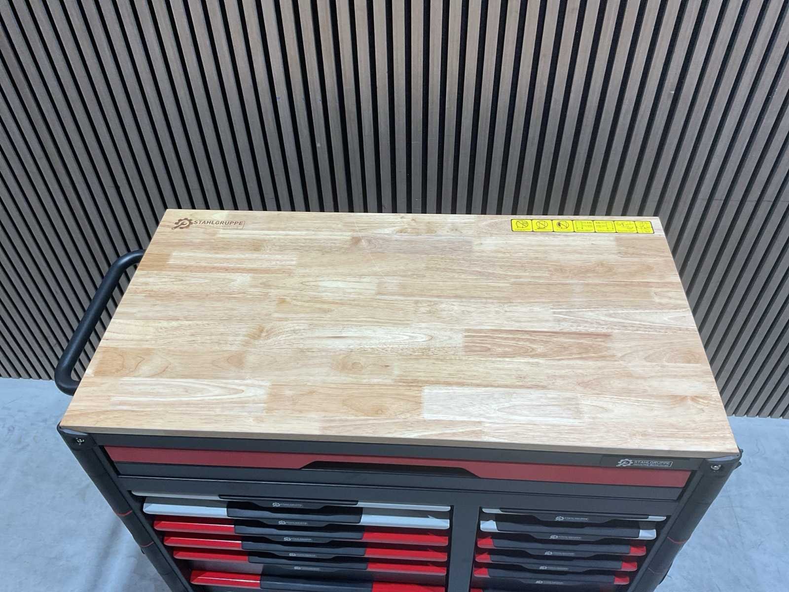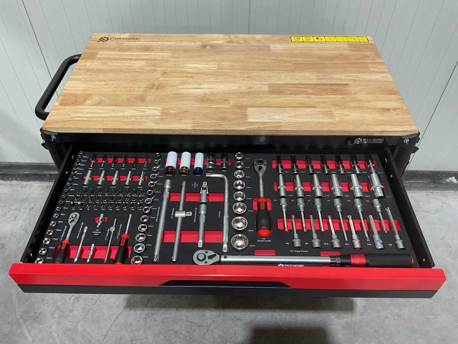 Werkbank op wielen met werkblad; Aantal laden: 13; Aantal gevulde laden: 11; 294-delig, materiaal chroom-vanadium; houten werkblad; 2 delen afsluitbaar; 2× dopsleutelsets 1/2” & 1/4”; Momentsleutel 40–220 Nm; Ring-/steeksleutelsets (o.a. 6–32 mm), ringratel-steeksleutelset (8–19 mm); Inbus (1,5–10 mm), Torx (T8–T70); Schroevendraaiers (21 st.), tangen (9 st.); Schuifmaat 0–150 mm (0,02 mm); Beitels/pendrijvers (9 st.), hamers (3 st.); T-greep Torx (T15–T45), T-greep inbus (2–10 mm); Chroom-molybdeen krachtdoppen (10–24 mm); T-greep dopsleutels (7–14 mm); VDE-gereedschappen (10 st.), vijlen & hakenset (8 st.); L 112 × B 55 × H 110 cm, gewicht 152 kg; ongebruikt in doos Merk: Stahlgruppe Model: SG24 Type: Rood