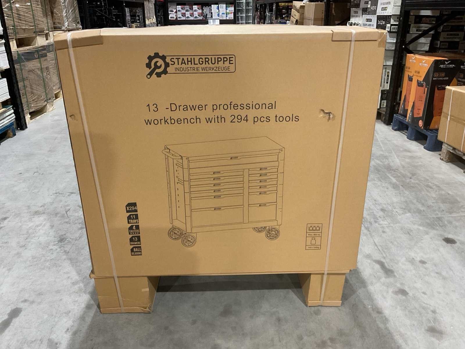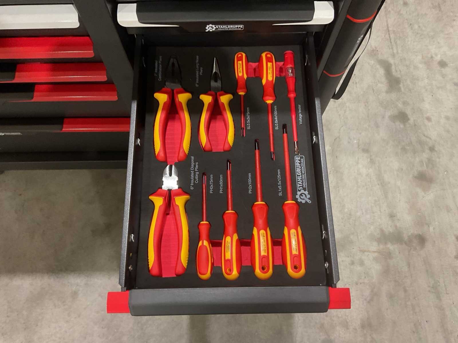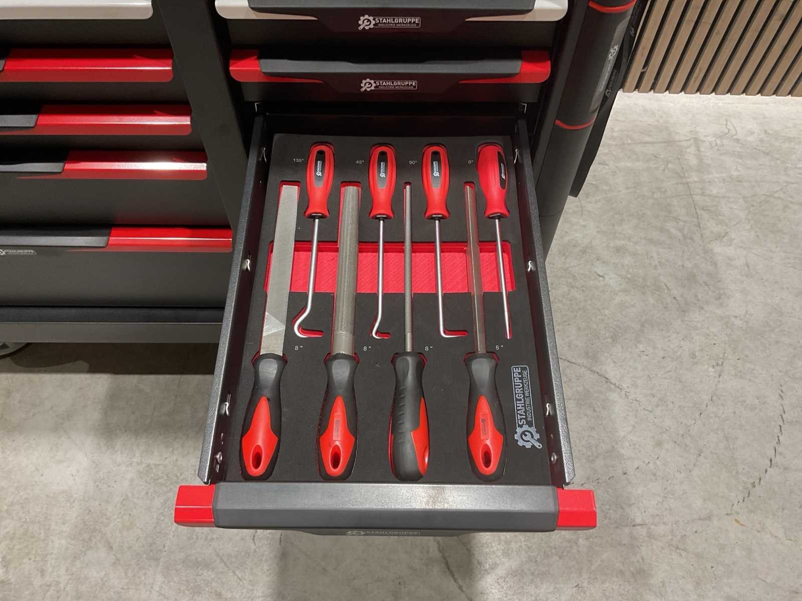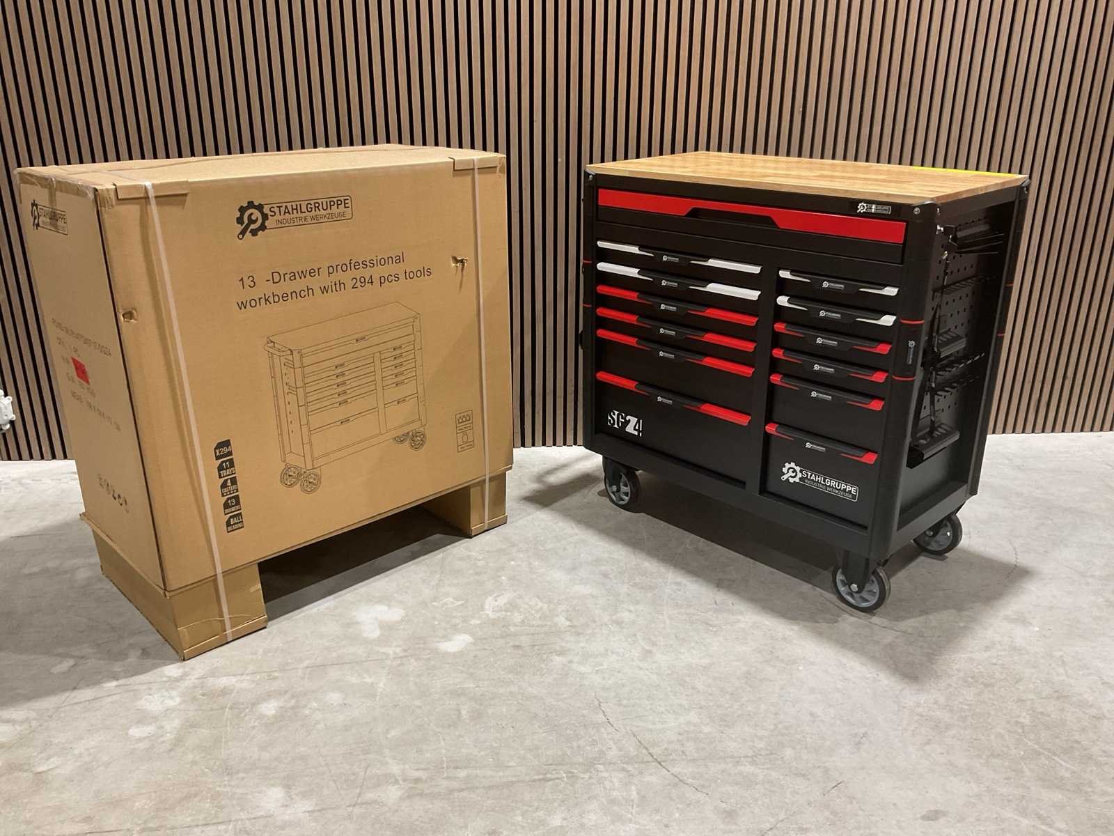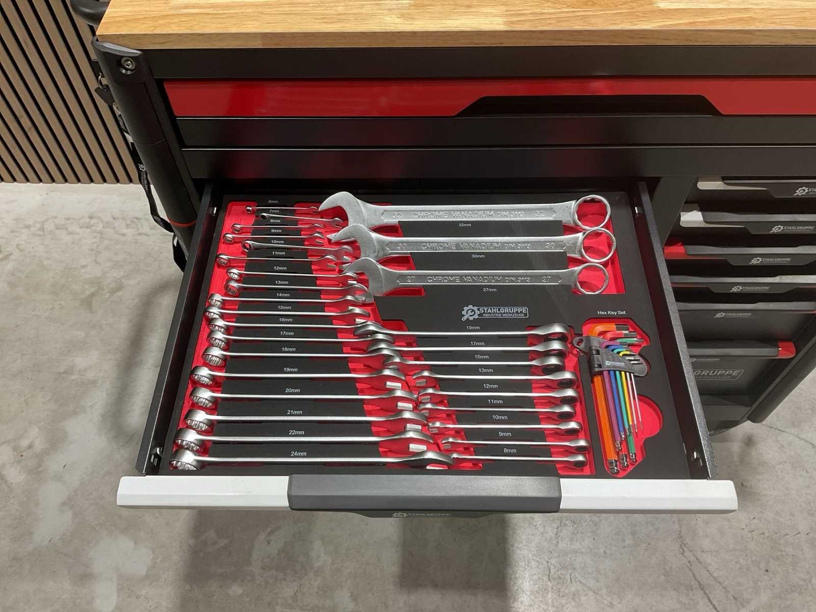 Werkbank op wielen met werkblad; Aantal laden: 13; Aantal gevulde laden: 11; 294-delig, materiaal chroom-vanadium; houten werkblad; 2 delen afsluitbaar; 2× dopsleutelsets 1/2” & 1/4”; Momentsleutel 40–220 Nm; Ring-/steeksleutelsets (o.a. 6–32 mm), ringratel-steeksleutelset (8–19 mm); Inbus (1,5–10 mm), Torx (T8–T70); Schroevendraaiers (21 st.), tangen (9 st.); Schuifmaat 0–150 mm (0,02 mm); Beitels/pendrijvers (9 st.), hamers (3 st.); T-greep Torx (T15–T45), T-greep inbus (2–10 mm); Chroom-molybdeen krachtdoppen (10–24 mm); T-greep dopsleutels (7–14 mm); VDE-gereedschappen (10 st.), vijlen & hakenset (8 st.); L 112 × B 55 × H 110 cm, gewicht 152 kg; ongebruikt in doos Merk: Stahlgruppe Model: SG24 Type: Rood
