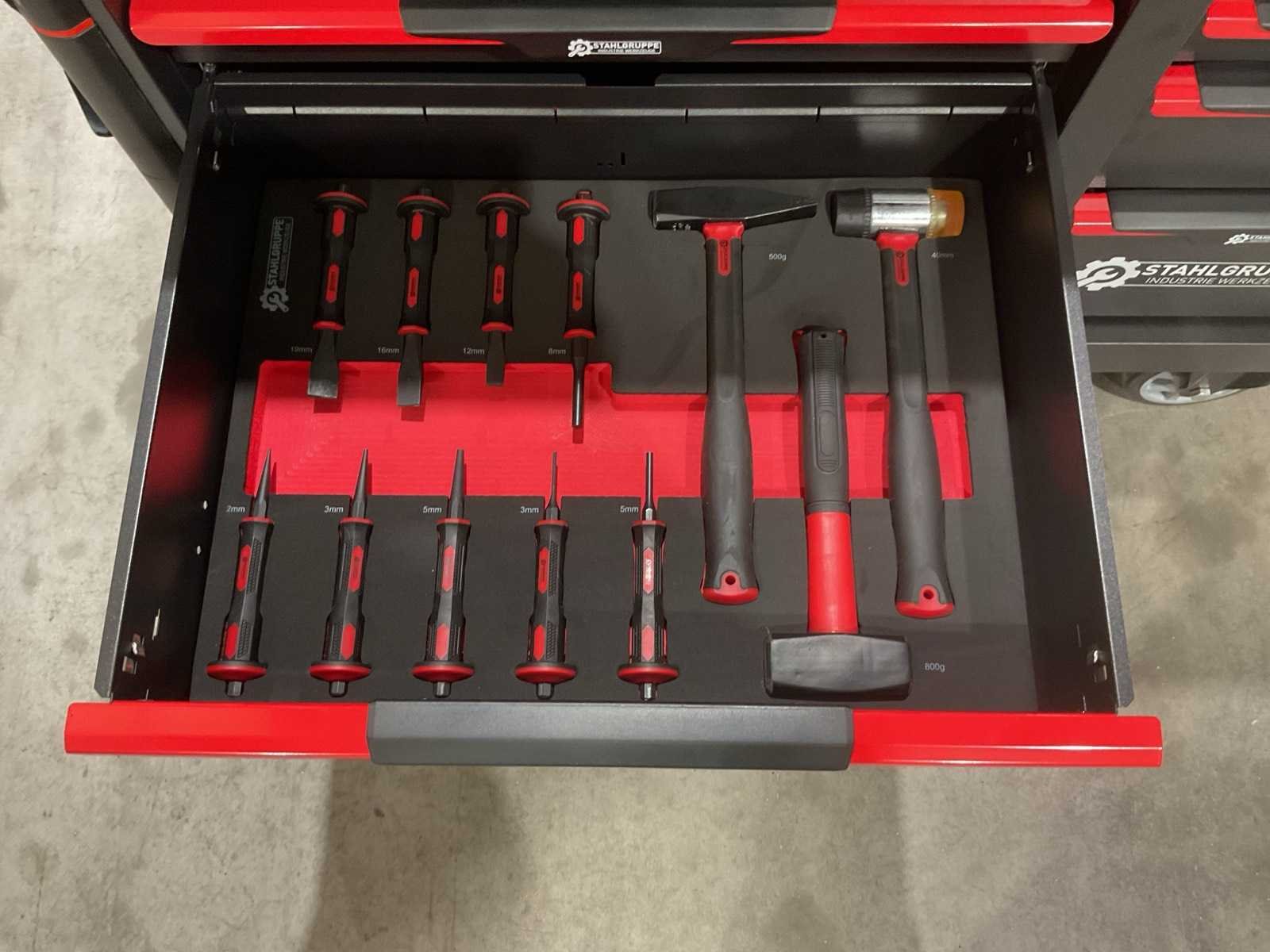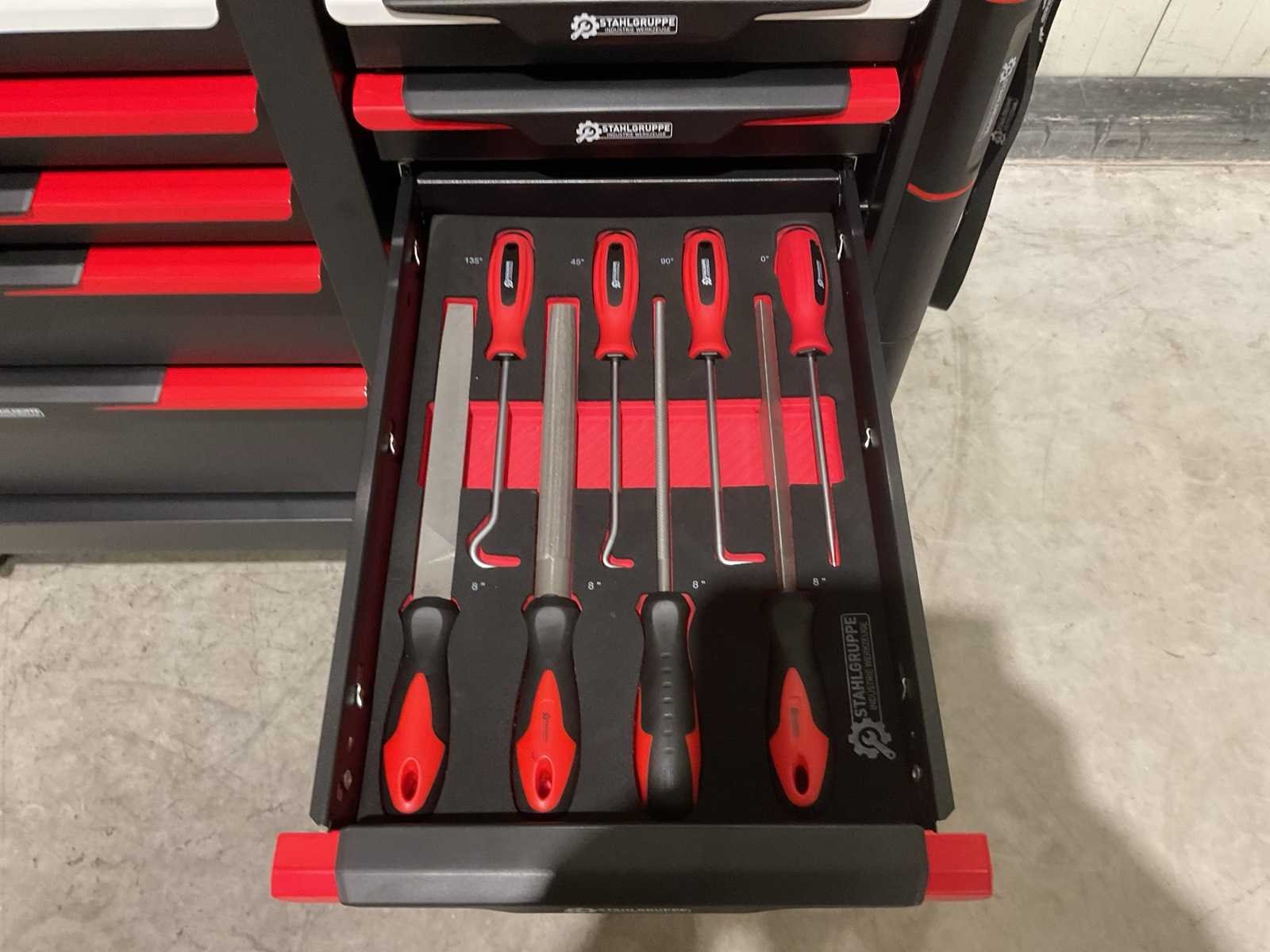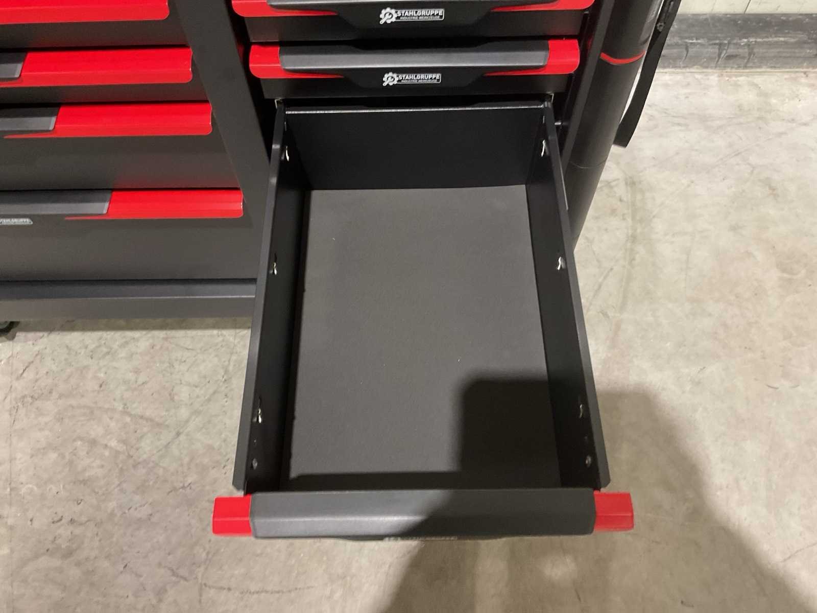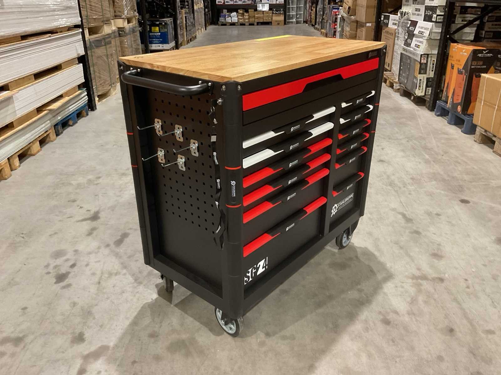 Werkbank op wielen met werkblad; Aantal laden: 13; Aantal gevulde laden: 11; 294-delig, materiaal chroom-vanadium; houten werkblad; 2 delen afsluitbaar; 2× dopsleutelsets 1/2” & 1/4”; Momentsleutel 40–220 Nm; Ring-/steeksleutelsets (o.a. 6–32 mm), ringratel-steeksleutelset (8–19 mm); Inbus (1,5–10 mm), Torx (T8–T70); Schroevendraaiers (21 st.), tangen (9 st.); Schuifmaat 0–150 mm (0,02 mm); Beitels/pendrijvers (9 st.), hamers (3 st.); T-greep Torx (T15–T45), T-greep inbus (2–10 mm); Chroom-molybdeen krachtdoppen (10–24 mm); T-greep dopsleutels (7–14 mm); VDE-gereedschappen (10 st.), vijlen & hakenset (8 st.); L 112 × B 55 × H 110 cm, gewicht 152 kg; ongebruikt in doos Merk: Stahlgruppe Model: SG24 Type: Rood
