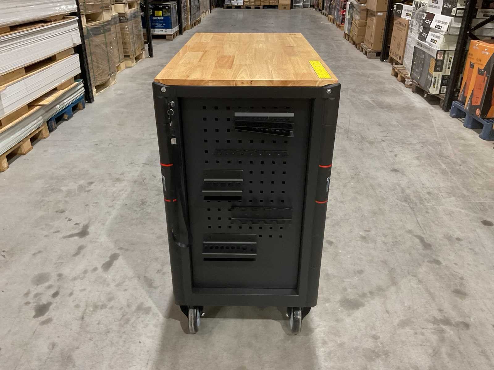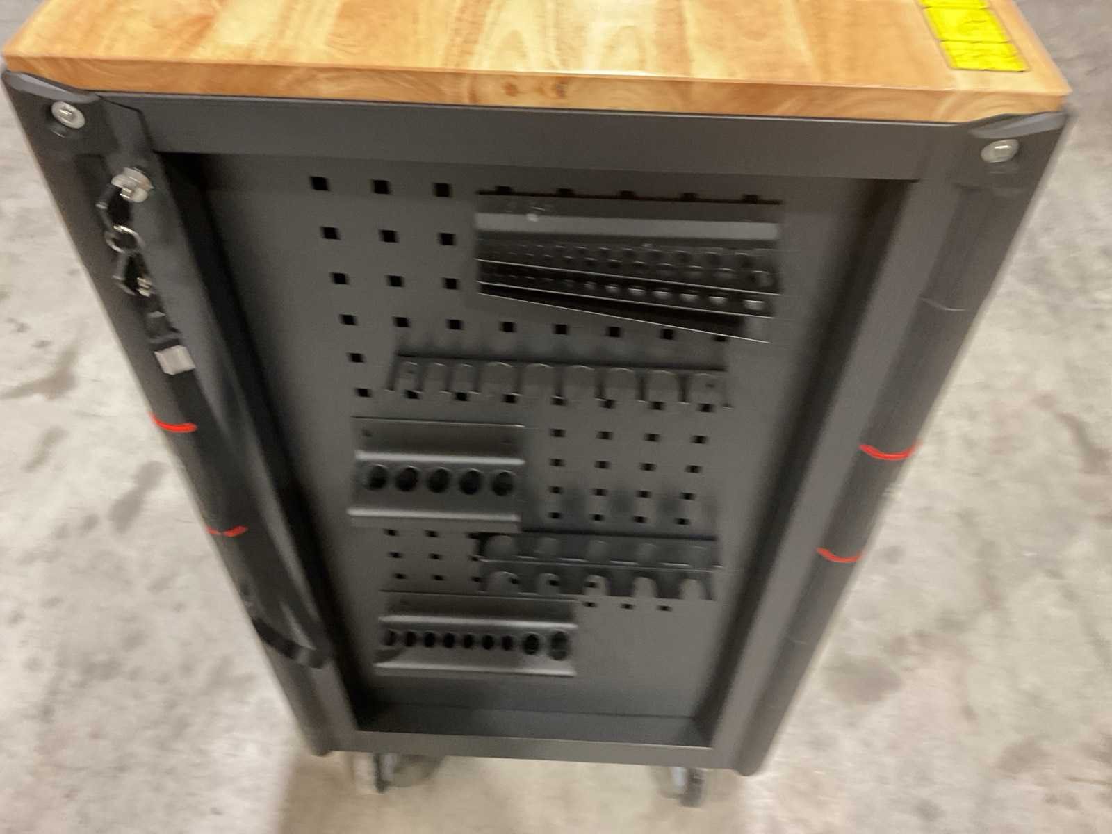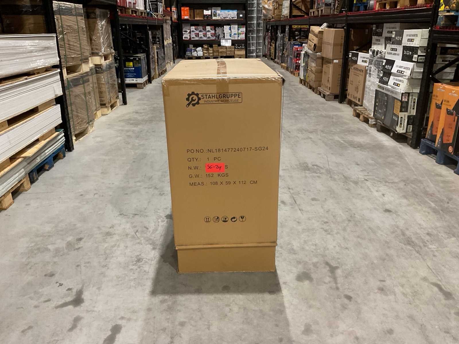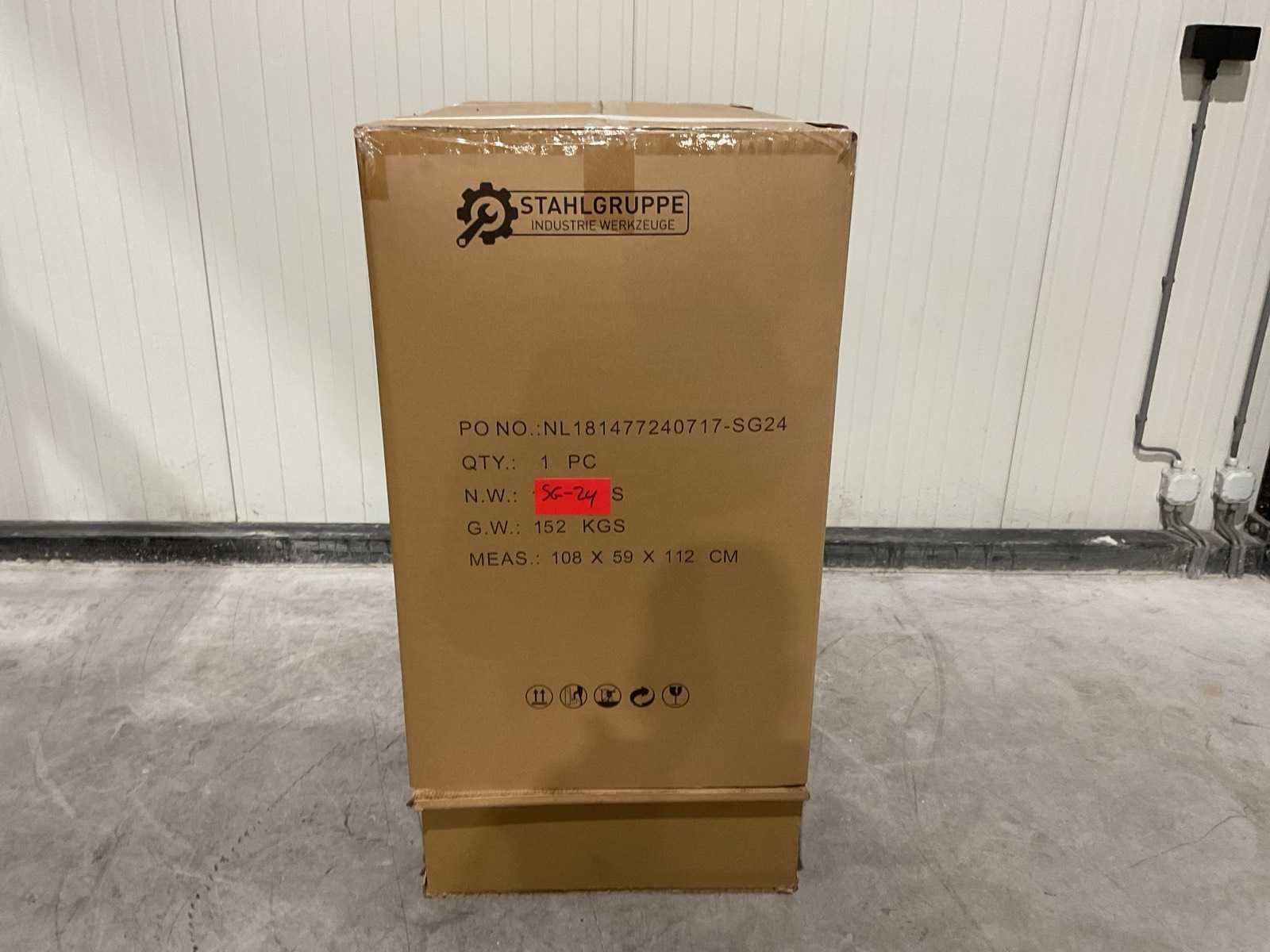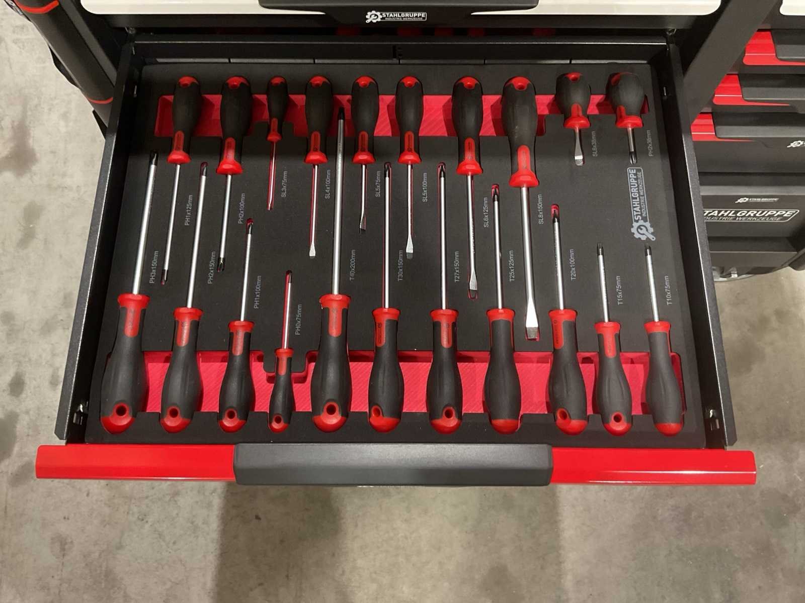 Werkbank op wielen met werkblad; Aantal laden: 13; Aantal gevulde laden: 11; 294-delig, materiaal chroom-vanadium; houten werkblad; 2 delen afsluitbaar; 2× dopsleutelsets 1/2” & 1/4”; Momentsleutel 40–220 Nm; Ring-/steeksleutelsets (o.a. 6–32 mm), ringratel-steeksleutelset (8–19 mm); Inbus (1,5–10 mm), Torx (T8–T70); Schroevendraaiers (21 st.), tangen (9 st.); Schuifmaat 0–150 mm (0,02 mm); Beitels/pendrijvers (9 st.), hamers (3 st.); T-greep Torx (T15–T45), T-greep inbus (2–10 mm); Chroom-molybdeen krachtdoppen (10–24 mm); T-greep dopsleutels (7–14 mm); VDE-gereedschappen (10 st.), vijlen & hakenset (8 st.); L 112 × B 55 × H 110 cm, gewicht 152 kg; ongebruikt in doos Merk: Stahlgruppe Model: SG24 Type: Rood