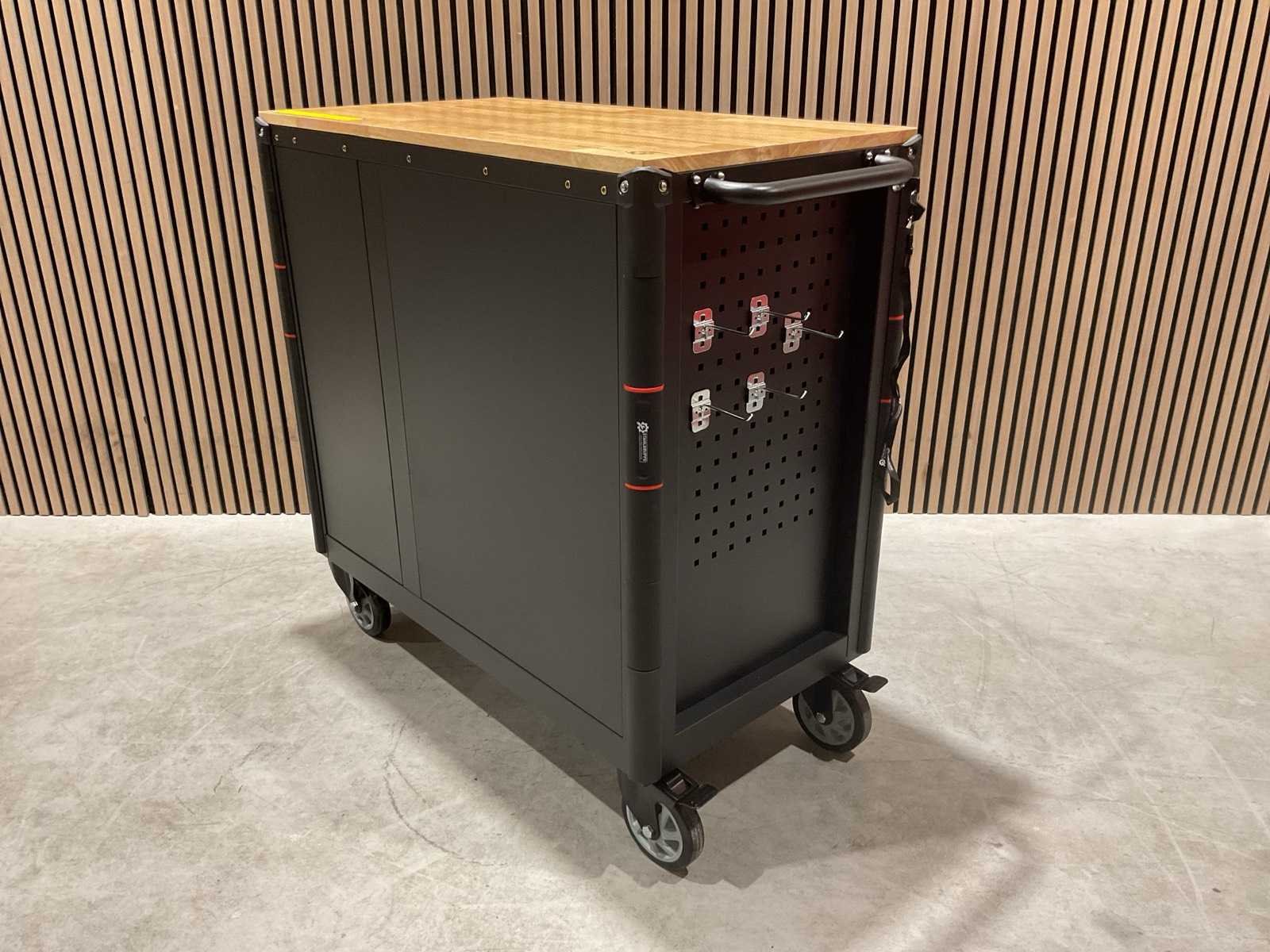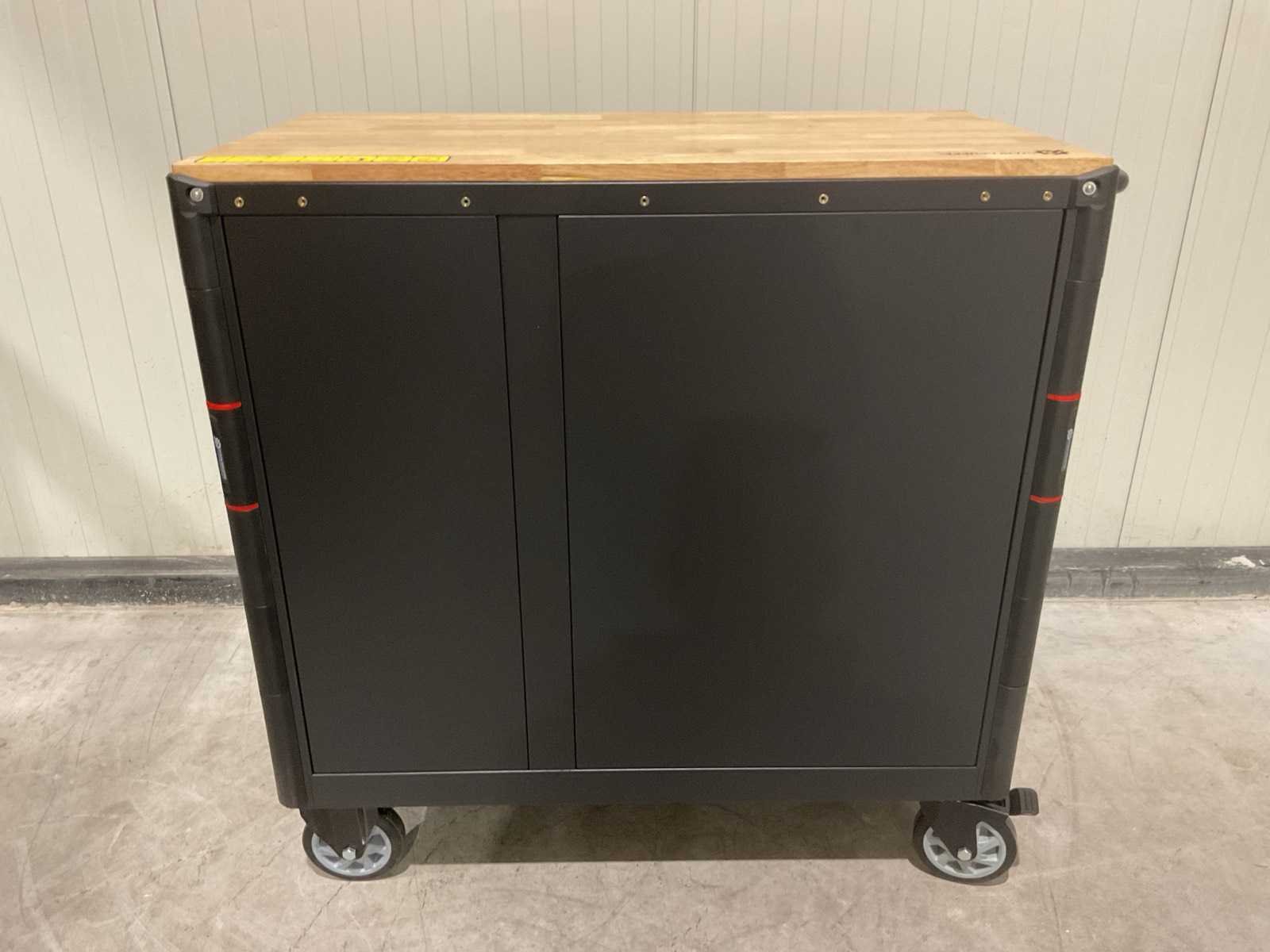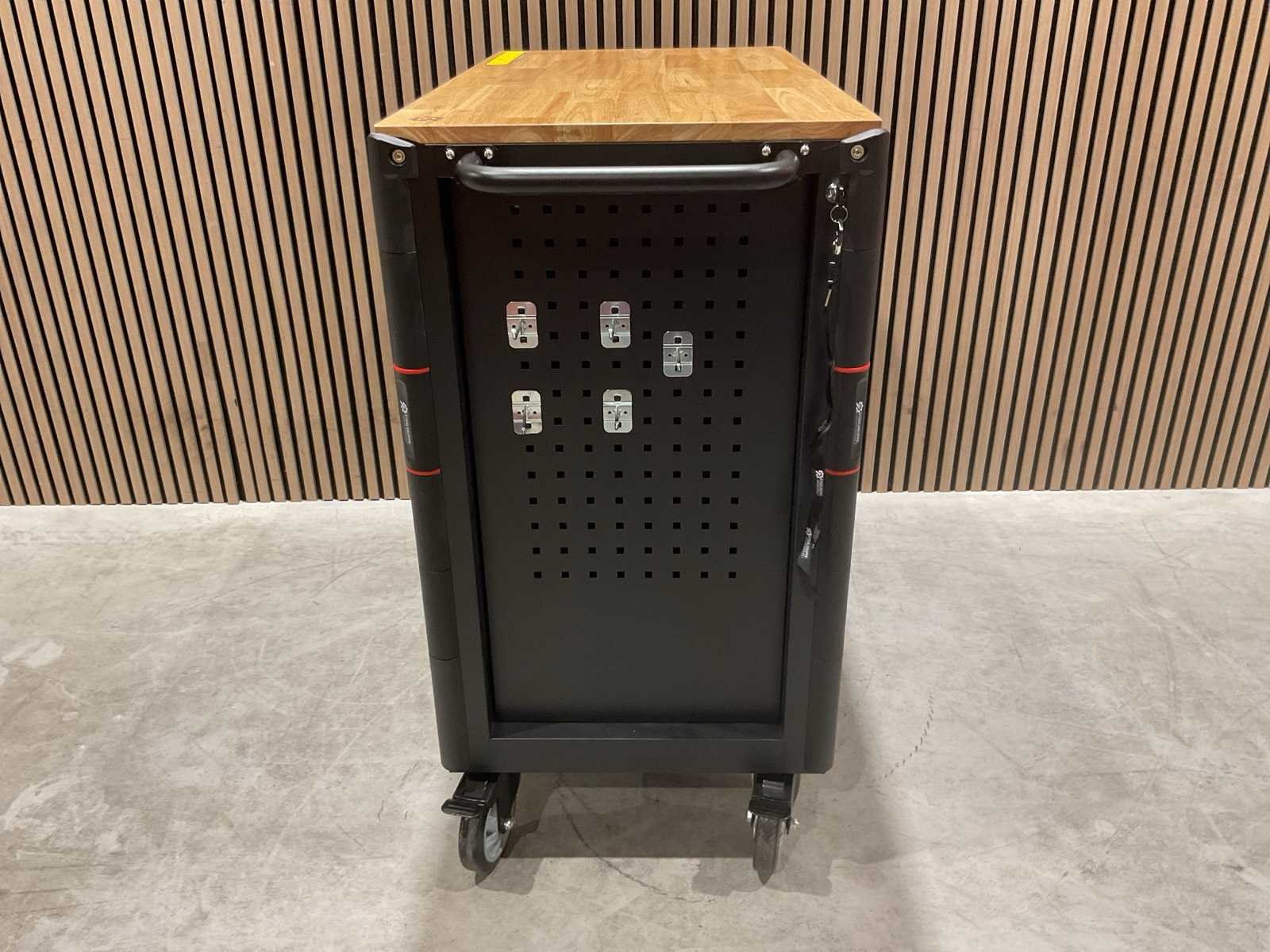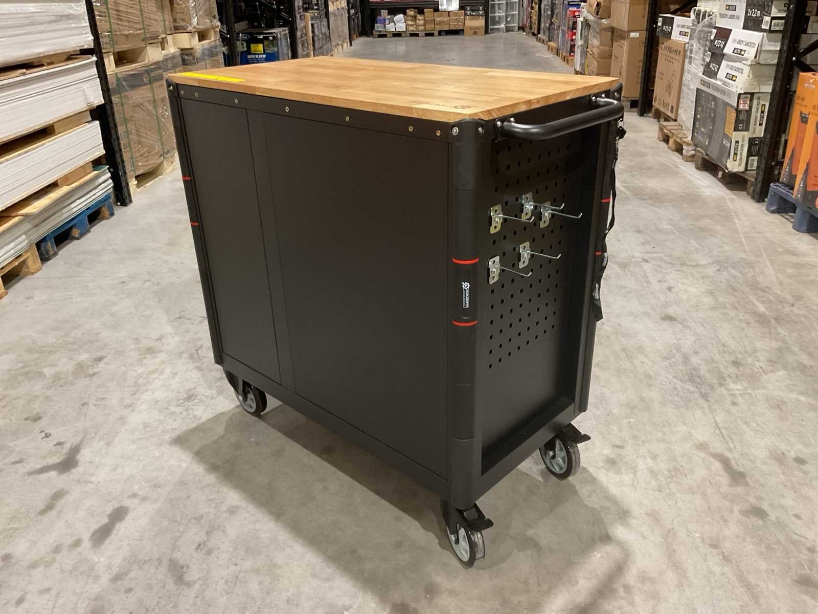 Werkbank op wielen met werkblad; Aantal laden: 13; Aantal gevulde laden: 11; 294-delig, materiaal chroom-vanadium; houten werkblad; 2 delen afsluitbaar; 2× dopsleutelsets 1/2” & 1/4”; Momentsleutel 40–220 Nm; Ring-/steeksleutelsets (o.a. 6–32 mm), ringratel-steeksleutelset (8–19 mm); Inbus (1,5–10 mm), Torx (T8–T70); Schroevendraaiers (21 st.), tangen (9 st.); Schuifmaat 0–150 mm (0,02 mm); Beitels/pendrijvers (9 st.), hamers (3 st.); T-greep Torx (T15–T45), T-greep inbus (2–10 mm); Chroom-molybdeen krachtdoppen (10–24 mm); T-greep dopsleutels (7–14 mm); VDE-gereedschappen (10 st.), vijlen & hakenset (8 st.); L 112 × B 55 × H 110 cm, gewicht 152 kg; ongebruikt in doos Merk: Stahlgruppe Model: SG24 Type: Rood