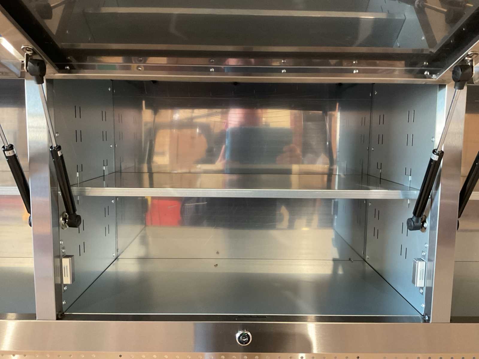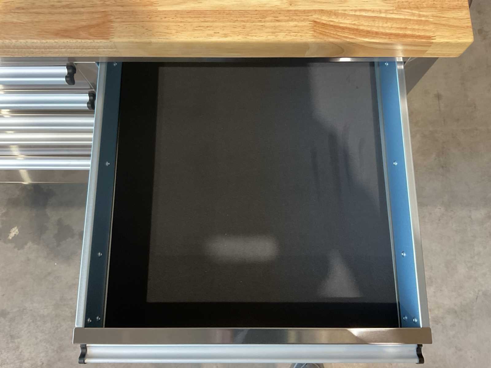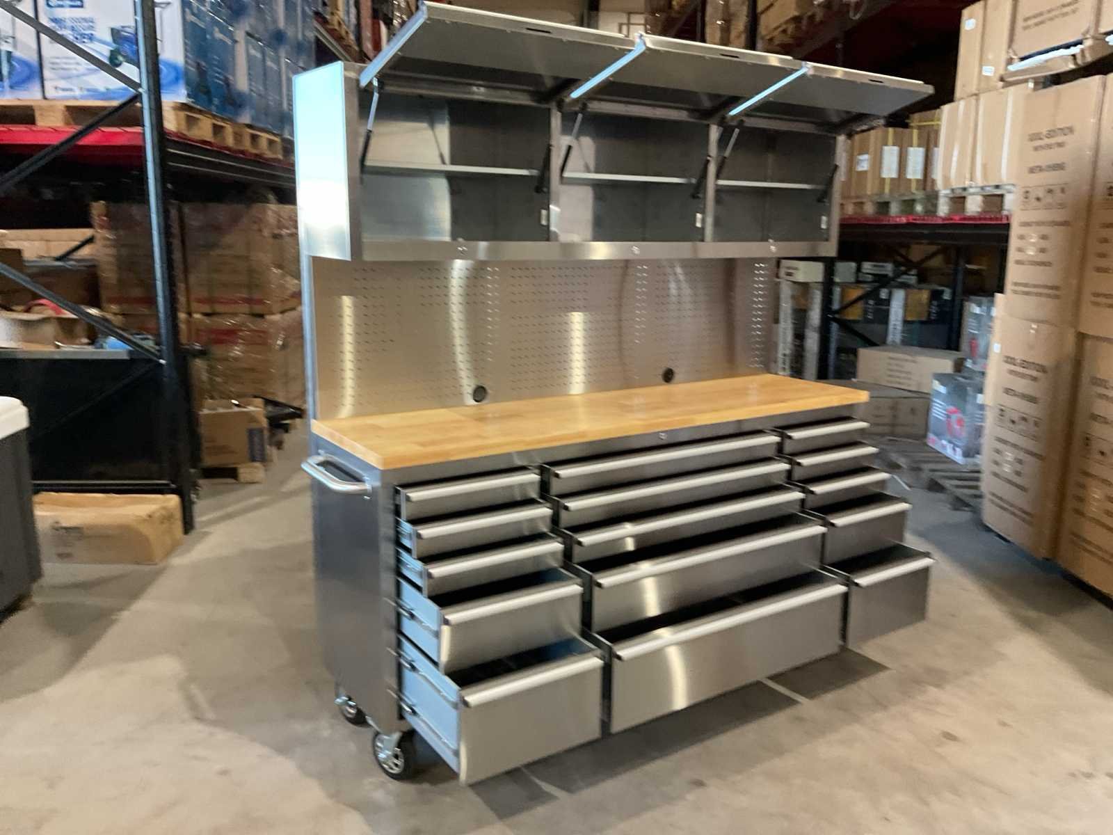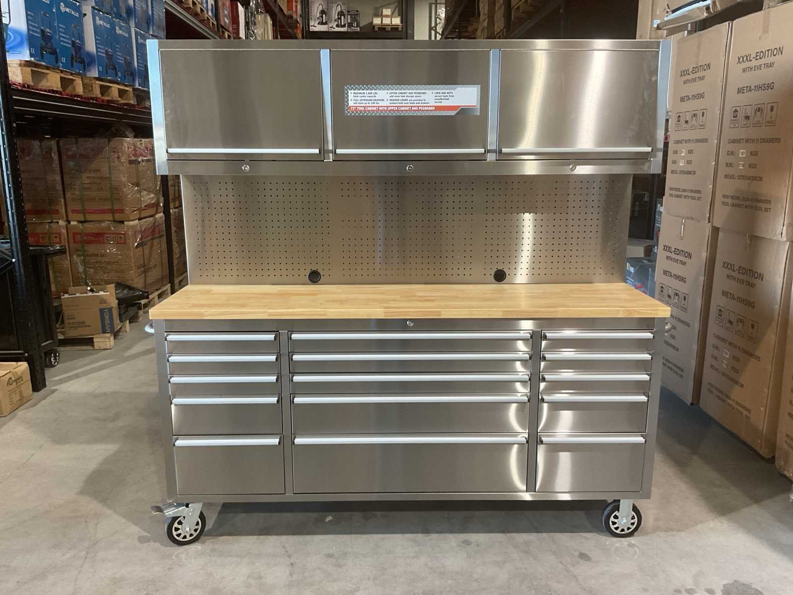 Voorzien van all 430 anti-fingerprint stainless steel; 15 laden; 3 hoge kasten; achterwand; 35 mm houten werkblad; 2 handvaten; 4 x 6 inch wielen waarvan 2 wielen met rem; afsluitbaar door middel van sleutel; ongebruikt in doos (transport afmetingen 190x55x130 cm) Merk: Stahlworks Model: Deluxe RVS 72 inch high Product type: 15 laden Gewicht: 179kg Lengte: 1830mm Hoogte: 1870mm Materiaal: RVS