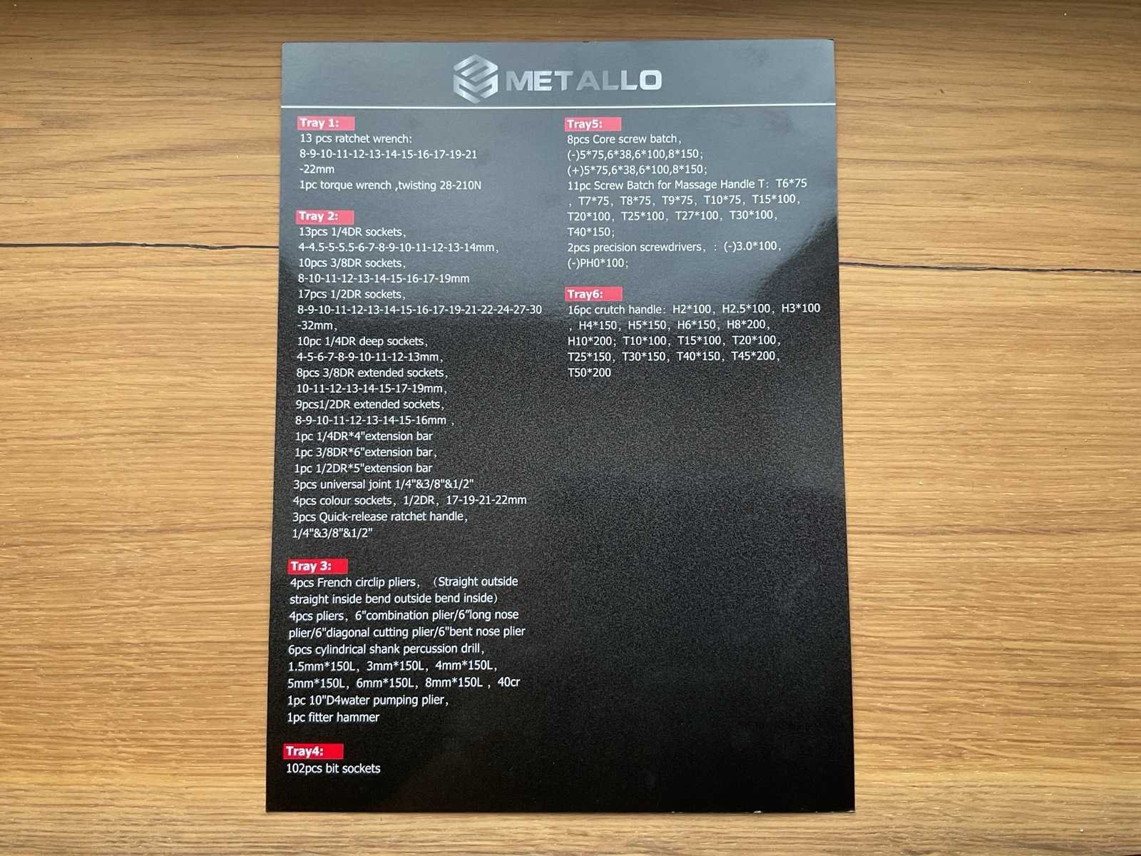 Ongebruikt in doos La 1 13 pcs rachet wrench 8-9-10-11-12-13-14-15-16-17-19-21-22mm 1 pc torque wrench, twisting 28-210N La 2 13pcs 1/4DR sockets 4-4,5 5-5.5 5-7-8-9-10-11-12-13-14mm 10pcs 3/8DR Sockets 8-10-11-12-13-14-15-16-17-19mm 17pcs 1/2DR Sockets 8-9-10-11-12-13-14-15-16-17-19-21-22-24-27-30-32mm 10pcs 1/4DR deep sockets 4-5-6-7-8-9-10-11-12-13mm 8pcs 3/8DR extended sockets 10-11-12-13-14-15-17-19 9pcs 1/2DR extended sockets 8-9-10-11-12-13-14-15-16mm 1pc 1/4DR*4” extention bar 1pc 3/8DR*6” extention bar 3pcs universal joint1/4”& 3/8” & 1/2” 4pcs colour sockets 1/2DR 17-19-21-22mm 3pcs Quick release ratchet handle 1/4” & 3/8” & 1/2“ La3 4pcs french circlip pliers (straight outside, straight inside, bend outside, bend inside) 4pcs pliers 6”combination plier / 6”long nose plier / 6”diagonal cutting plier / 6” bent nose plier 6pcs cylindrical shank percussion drill 1.5mm*150L, 3mm*150L, 4mm*150L, 5mm*150L, 6mm*150L, 8mm*150L, 40CR 1pc 10” D4 water pumping plier 1pc fitter hammer La 4 102pcs bit sockets La5 8pcs core screw batch (-) 5*75, 6*38, 6*100, 8*150 (+) 5*75, 6*38, 6*100, 8*150 11pcs screw batch for massage handle T T6*75, T7*75, T8*75, T9*75, T10*75, T15*100, T20*100, T25*100, T27*100, T30*100, T40*150 2pcs precision screwdrivers (-) 3.0*100 (-) PH0*100 La 6 16pcs crutch handle H2*100, H2.5*100, H3*100, H4*150, H5*150, H6*150, H8*200, H10*200, T10*100, T15*100, T20*100, T25*150, T30*150, T40*150, T45*200, T50*200 Merk: Metallo Model: Meta-7HS6G Type: 2024-7 XXL edition Kleur: Grijs Gewicht: 72kg Lengte: 793cm Breedte: 480cm Hoogte: 840cm